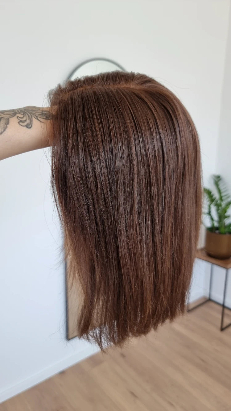 Dein eigenes Haar ist schulterlang oder kürzer? Dann solltest du keinen Topper wählen, der mehr als 5 cm länger ist. Bei dieser Länge vermischen sich das Eigen- und Topperhaar nicht optimal und es kommt zu einer deutlich sichtbaren Stufe. Das beeinträchtigt den Realismus sehr und führt zu keinem schönen Ergebnis. Bitte wähle dann einen Topper, der gleich lang oder bis zu 5 cm länger ist.