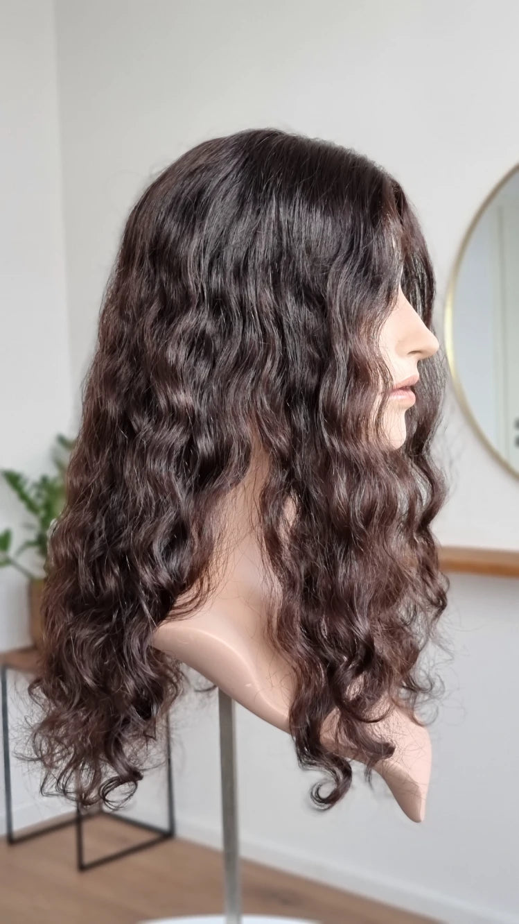 Diese Art von Topper ist für Frauen geeignet, die sich eine geringe Haarmenge und eine möglichst flache Montur wünschen. Der Topper wird hinter der eigenen Haarlinie getragen, das heißt dein Haaransatz muss noch stark genug sein, um den Rand des Toppers zu kaschieren