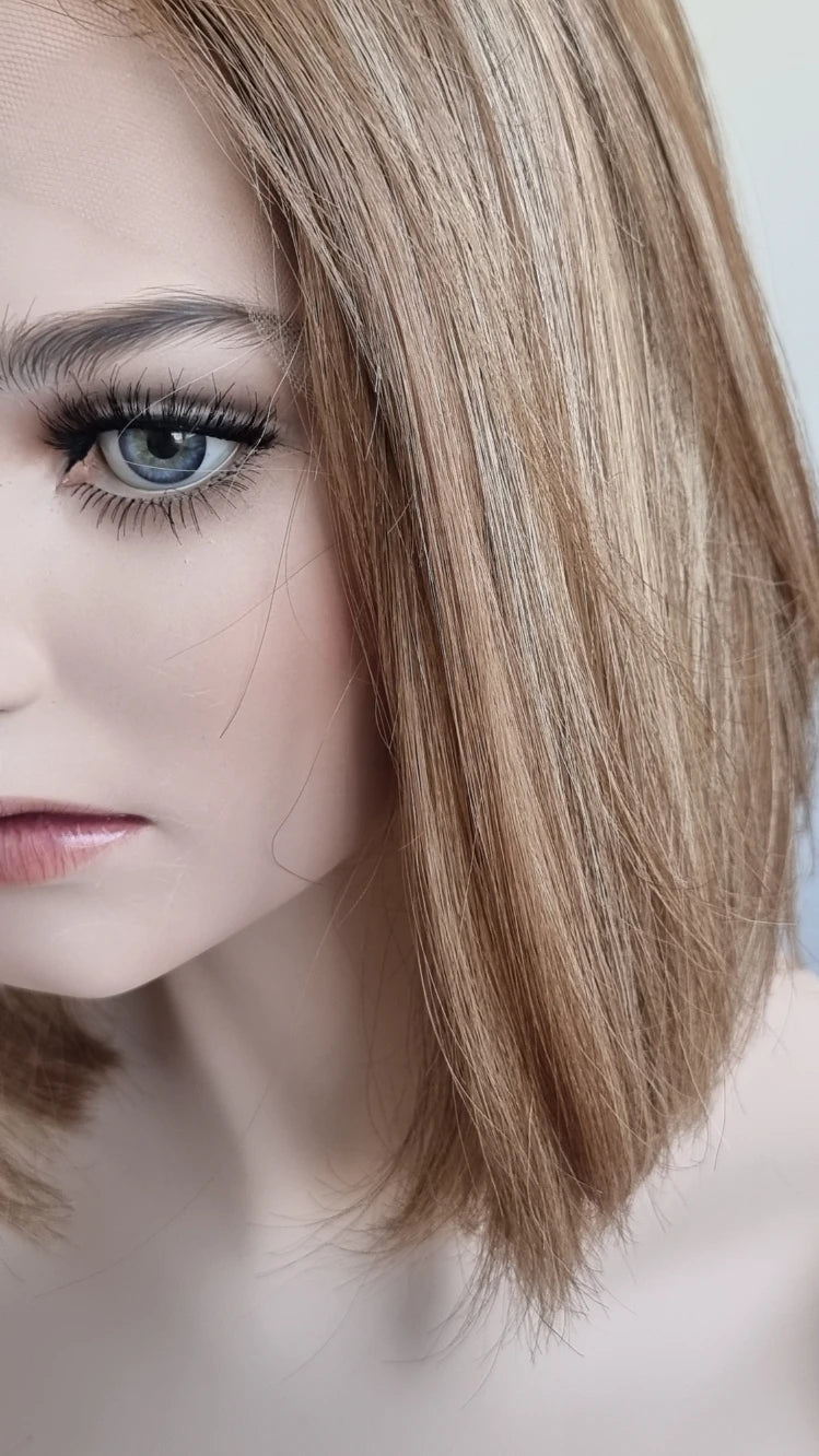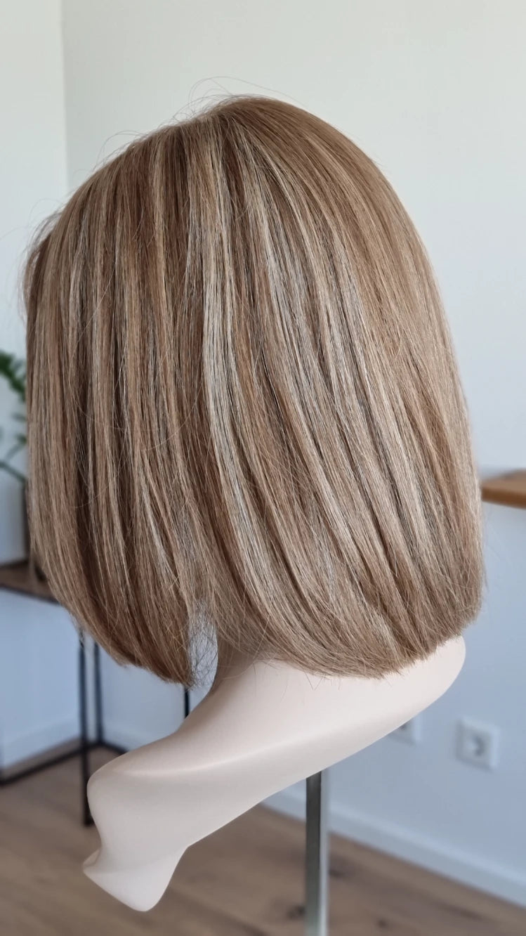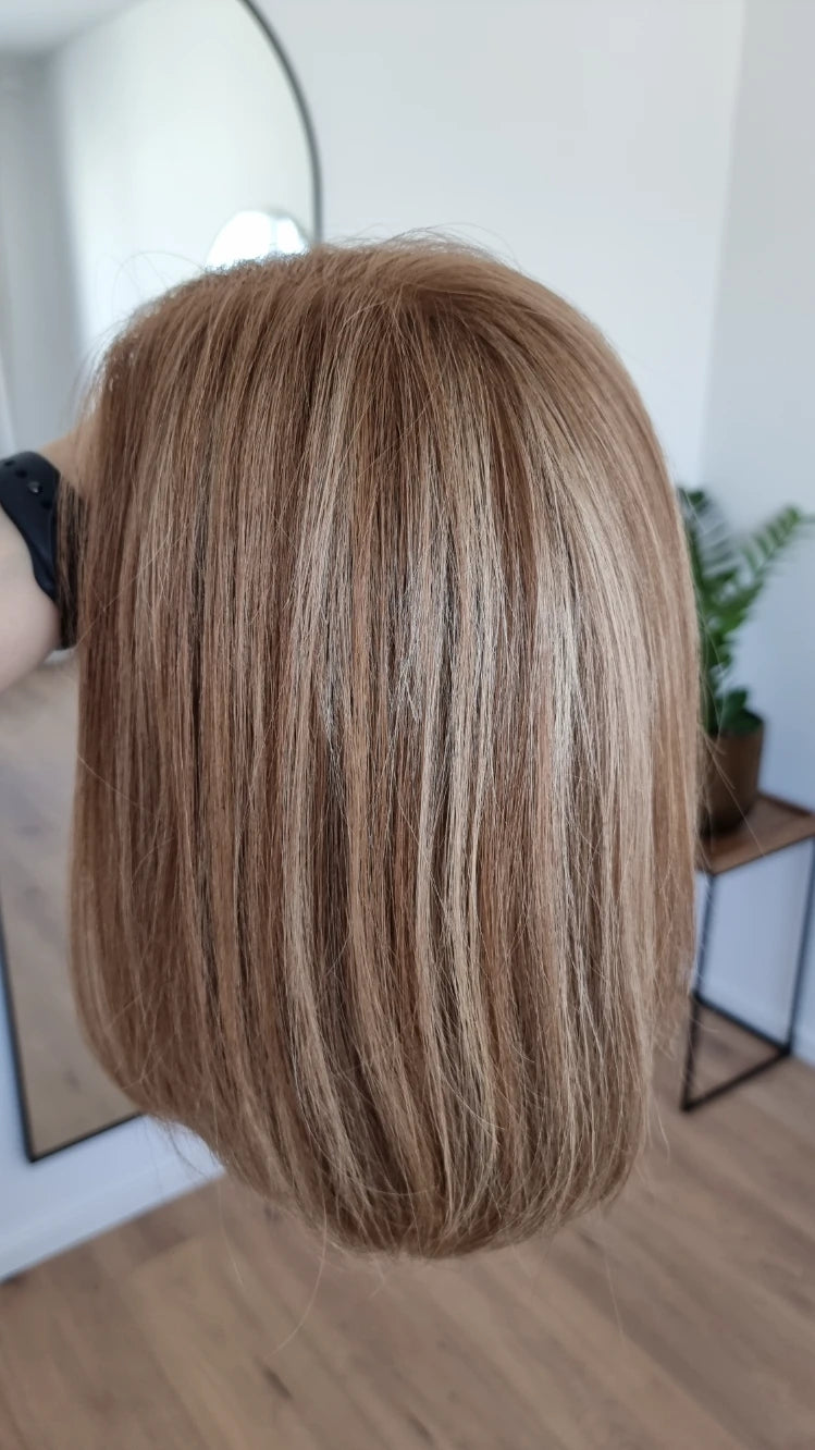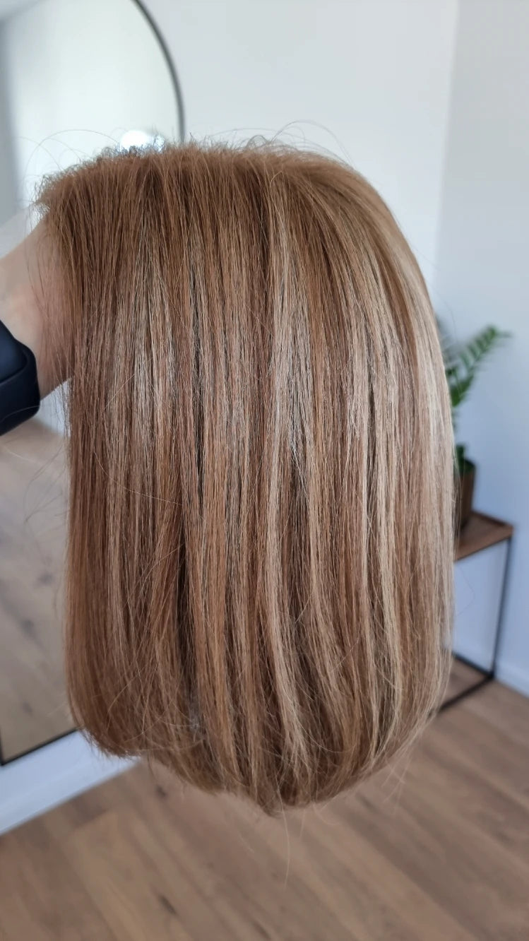 - Farbe neutrales Dunkelblond mit hellblonden Highlights