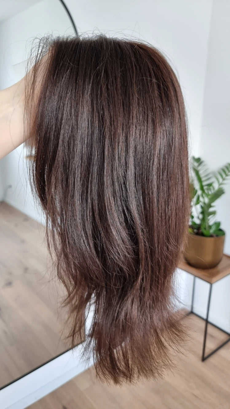 Diese Perücke besteht zu 100 % aus echtem Remy-Haar und kann wie das eigene Haar frisiert werden. Du kannst es glätten, föhnen und locken wie es dir beliebt und es sind keine teuren Pflegeprodukte notwendig. Alles, was du an Pflege benötigst, erhältst du im Frisörbedarf