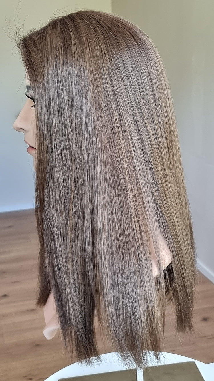 Der Scheitelbereich besteht aus einem sogenannten Silktop – die natürlichste Montur, die aktuell auf dem Markt erhältlich ist. Diese Art der Konstruktion erweckt den Anschein, als wüchsen die Haare direkt aus der Kopfhaut. Selbst aus nächster Nähe wird niemand dieses Haarteil als Zweithaar erkennen.