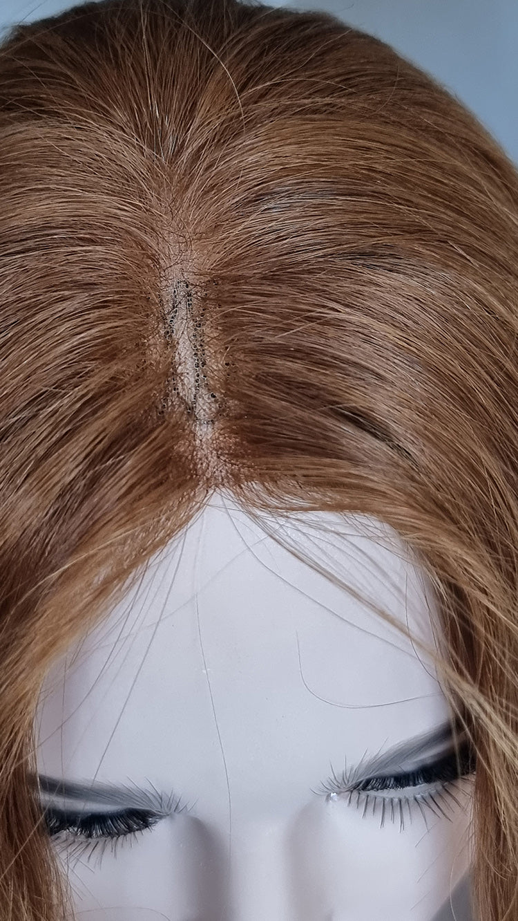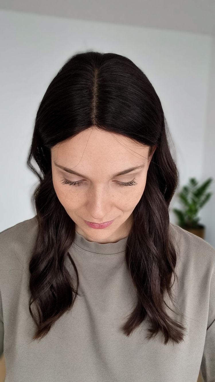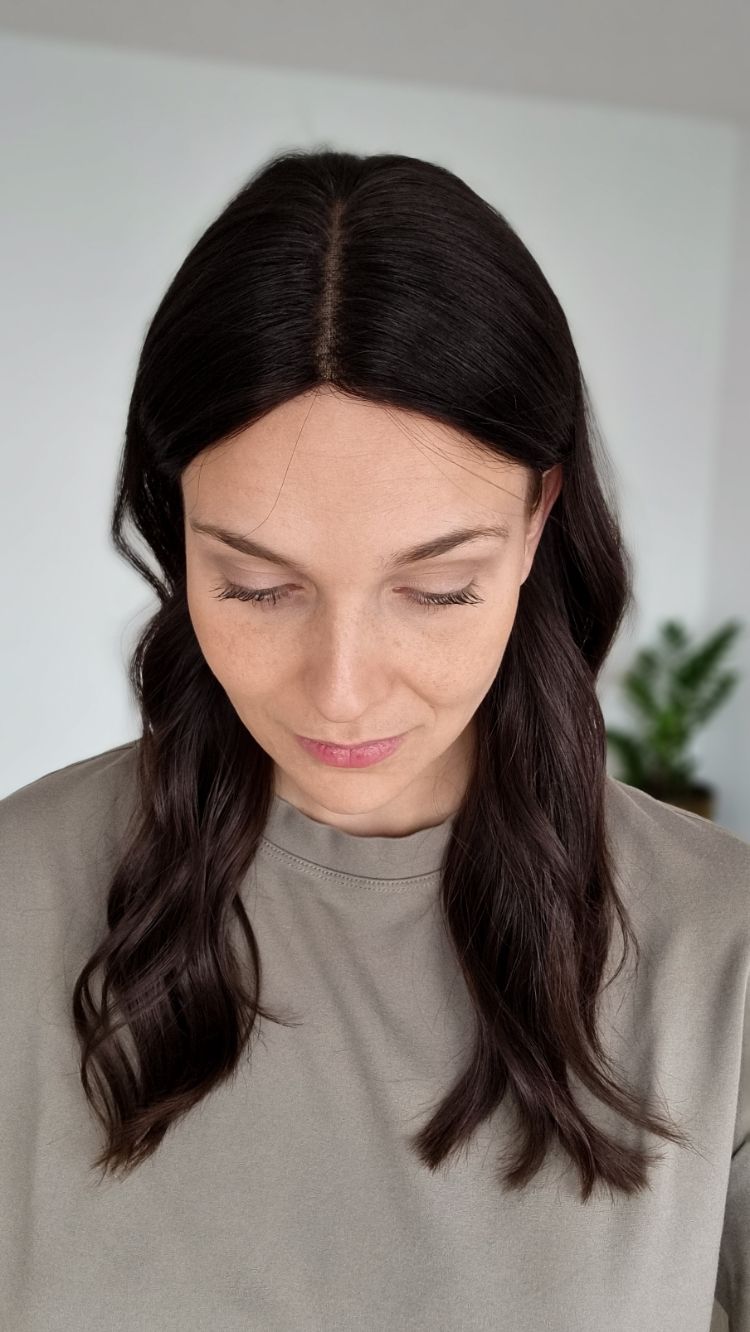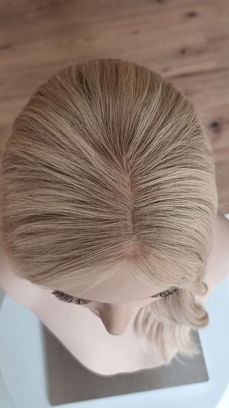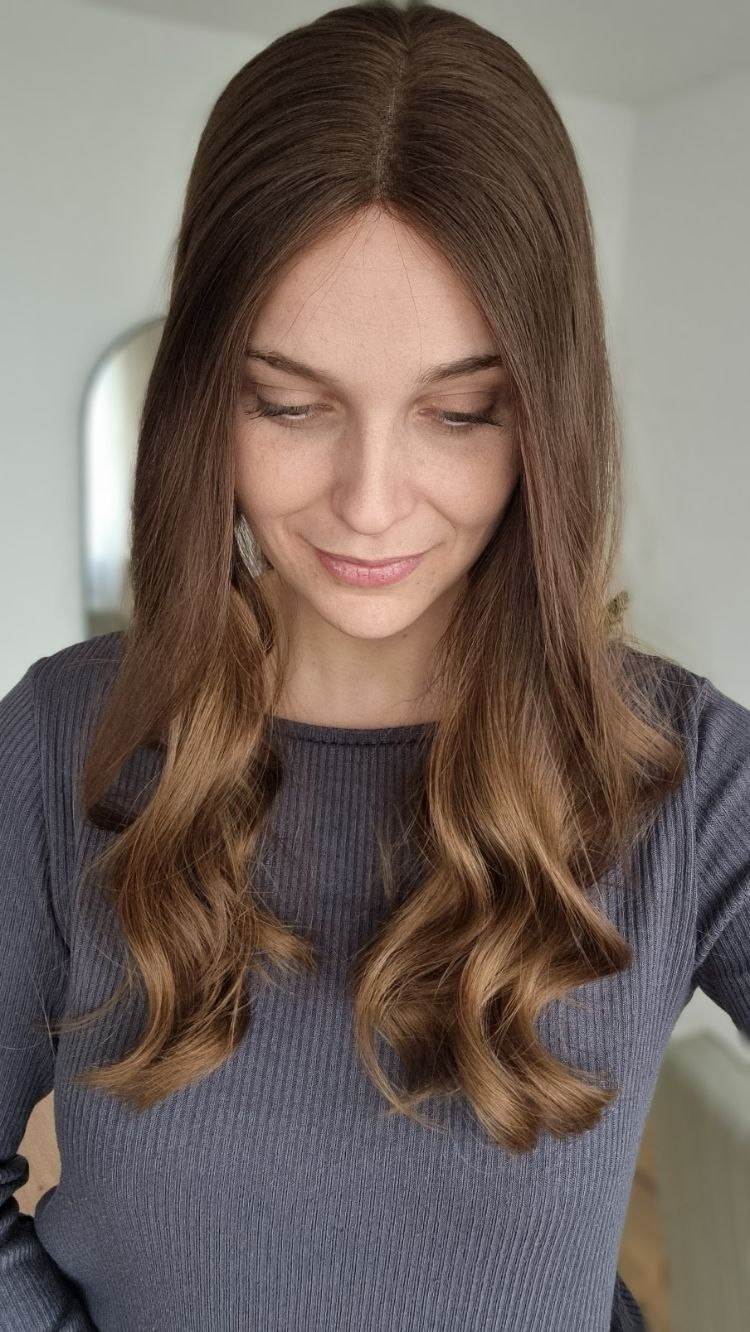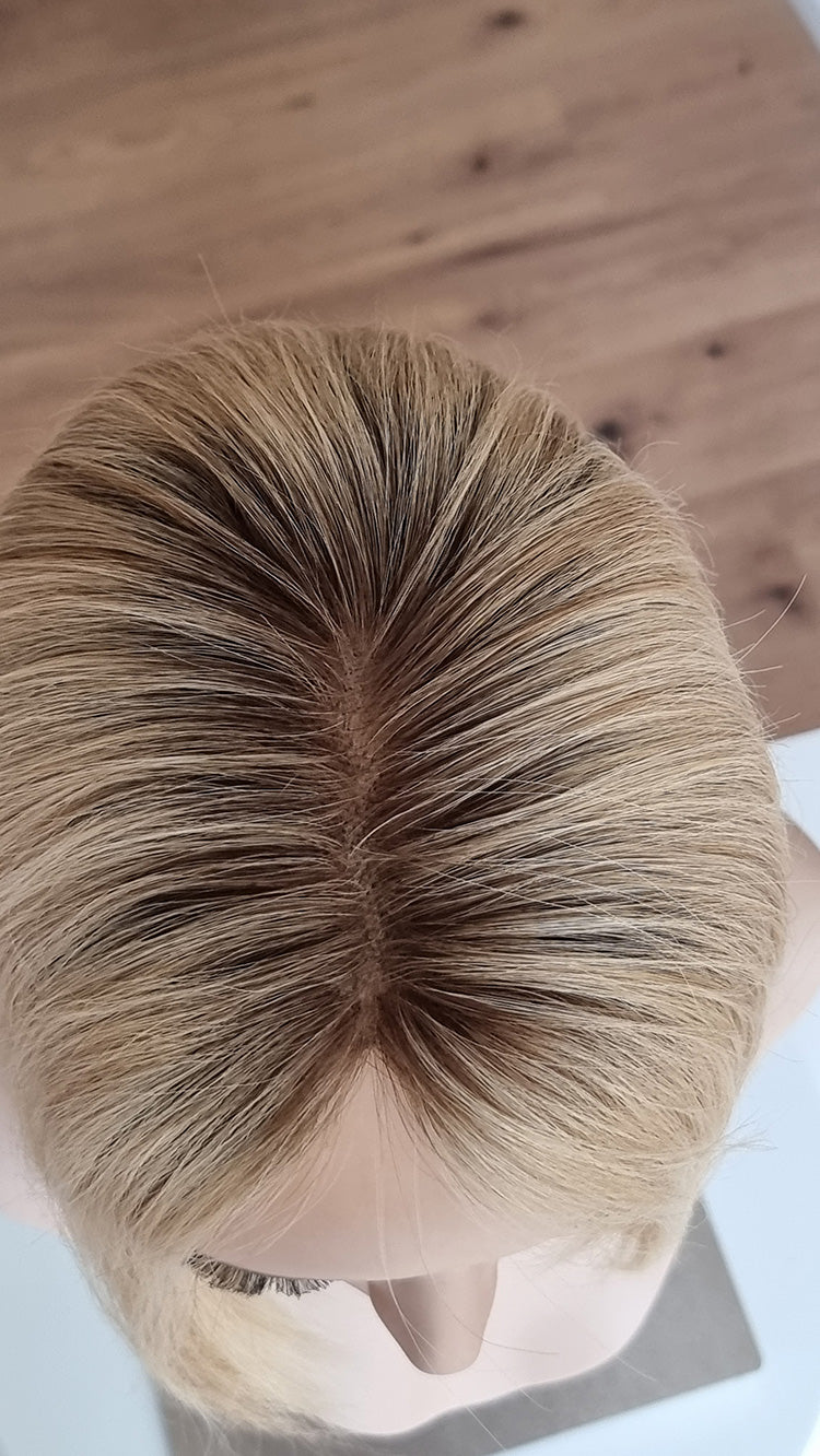 Ein Crown-Topper ist ein Haarteil mit sehr dünner Lace-Montur, das besonders für Frauen geeignet ist, die sich eine Lösung mit geringer Haardichte wünschen.