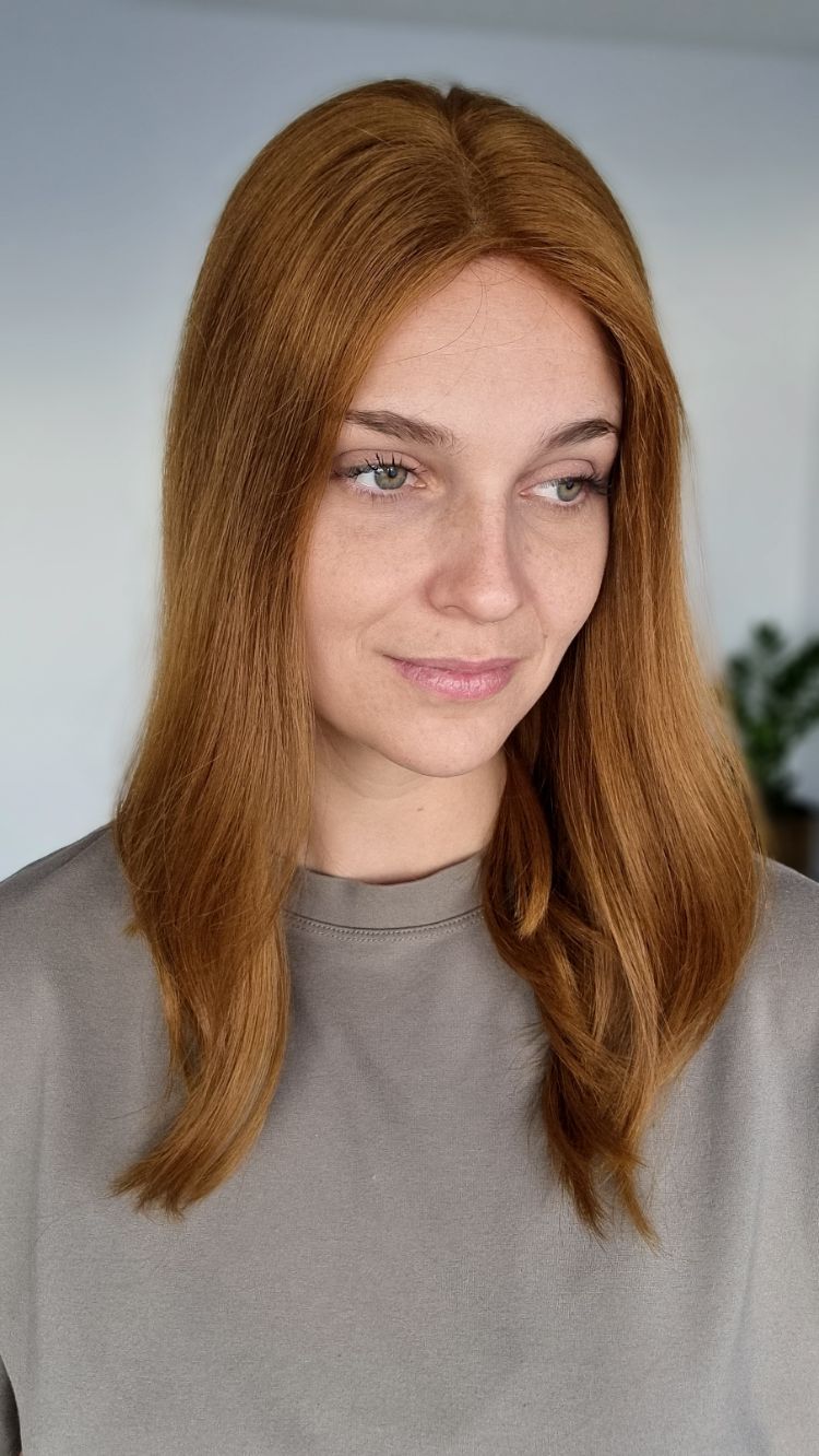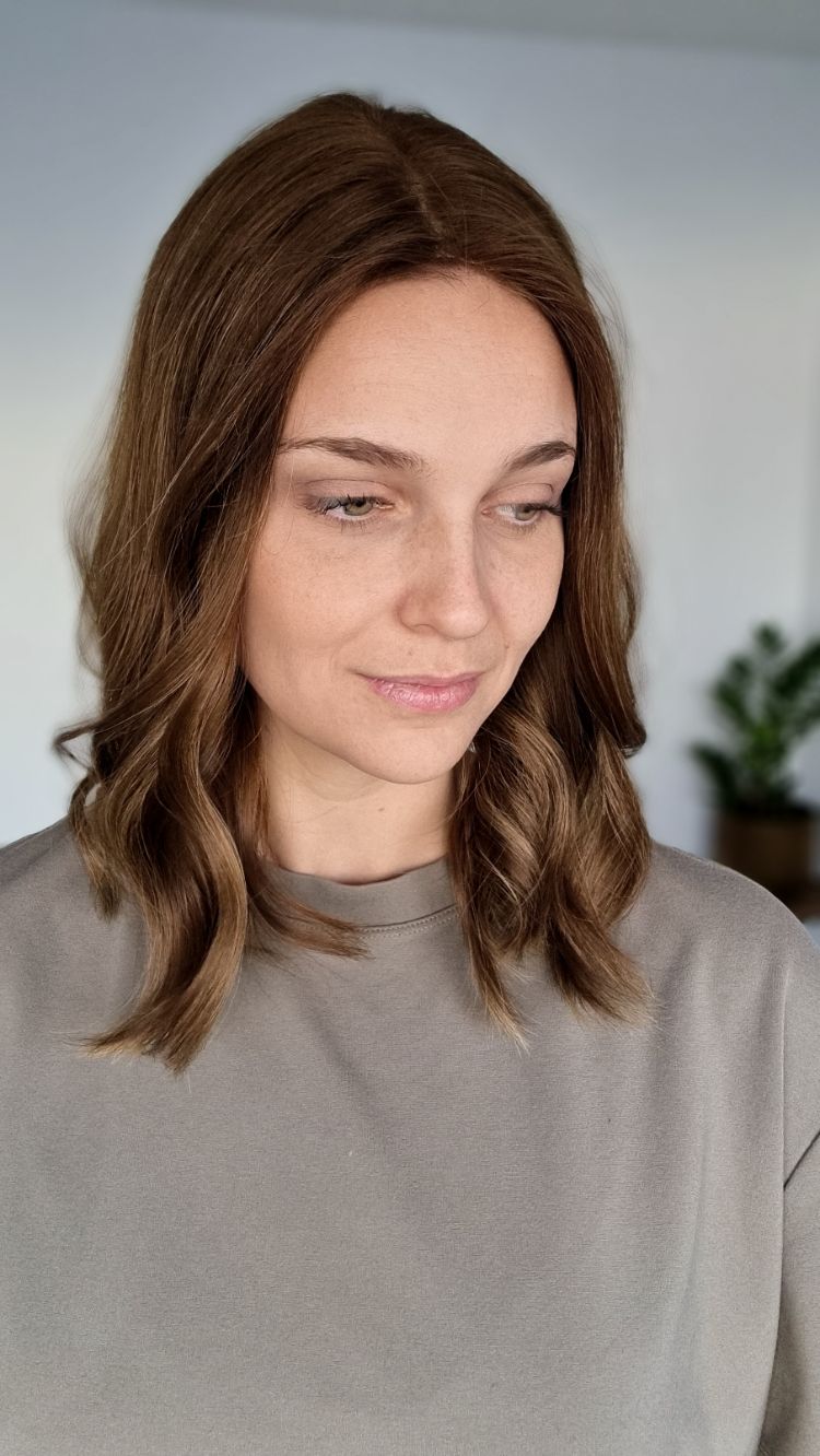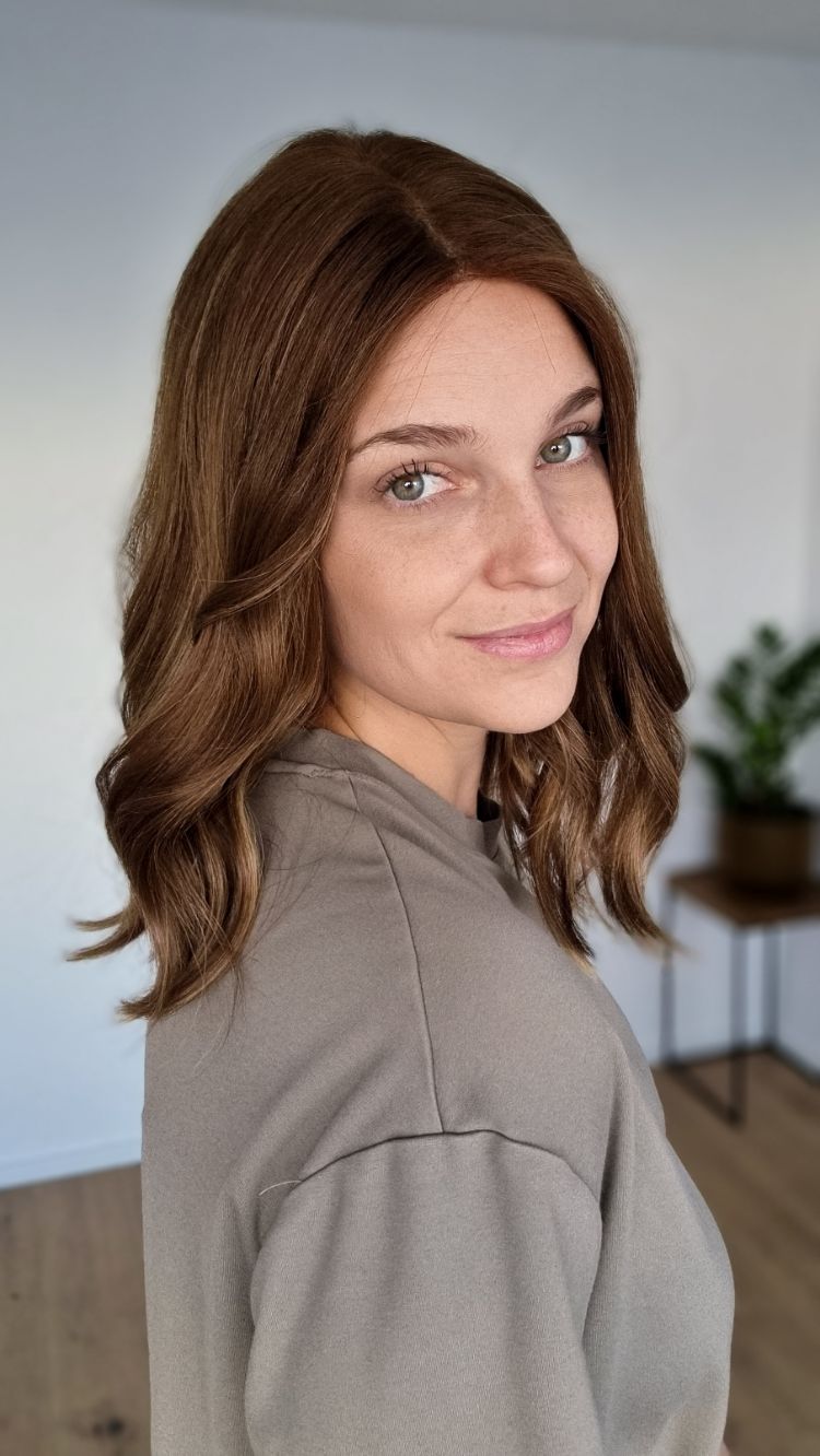 Dein eigenes Haar ist schulterlang oder kürzer? Dann solltest du keinen Topper wählen, der mehr als 5 cm länger ist. Bei dieser Länge vermischen sich das Eigen- und Topperhaar nicht optimal und es kommt zu einer deutlich sichtbaren Stufe. Das beeinträchtigt den Realismus sehr.