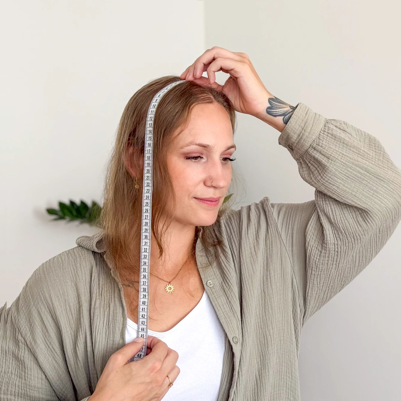 Um sicherzugehen, dass die Haarlänge für dich passend ist, nimm bitte ein flexibles Maßband und miss vom Mittelscheitel seitlich am Kopf herunter bis zu den Spitzen. Idealerweise ist der Topper dann 2 cm länger als dein eigenes Haar.