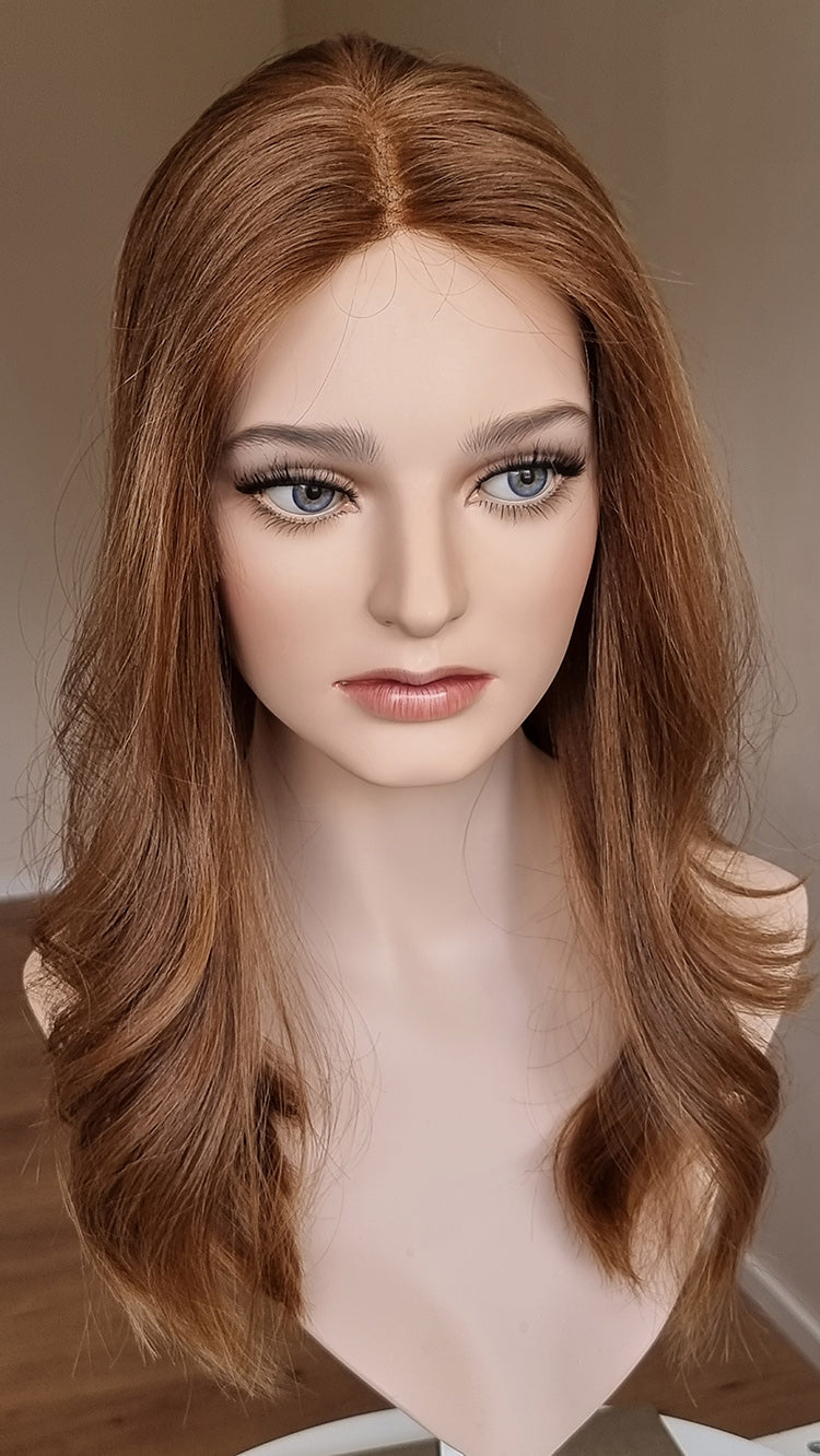 Diese Art von Topper ist für Frauen geeignet, die sich eine geringe Haarmenge und eine möglichst flache Montur wünschen. Der Topper wird hinter der eigenen Haarlinie getragen, das heißt dein Haaransatz muss noch stark genug sein, um den Rand des Toppers zu kaschieren