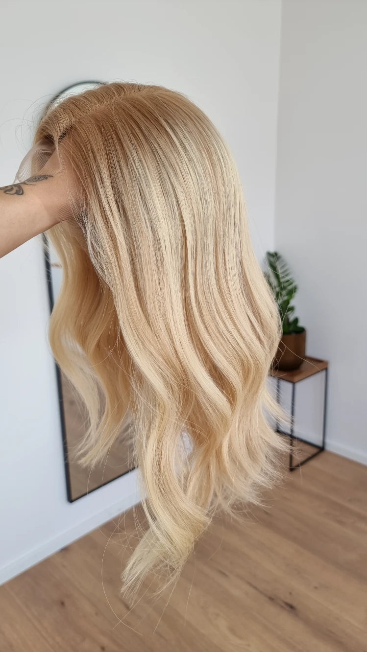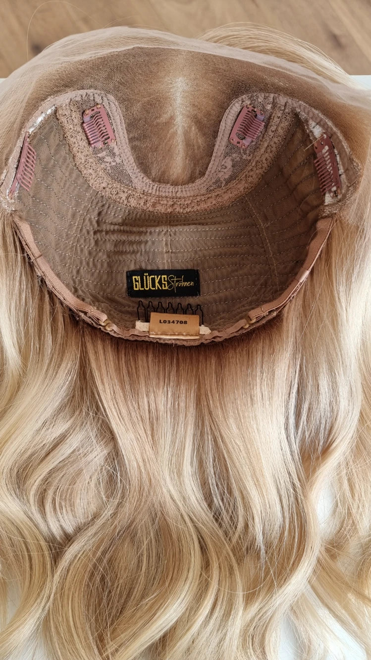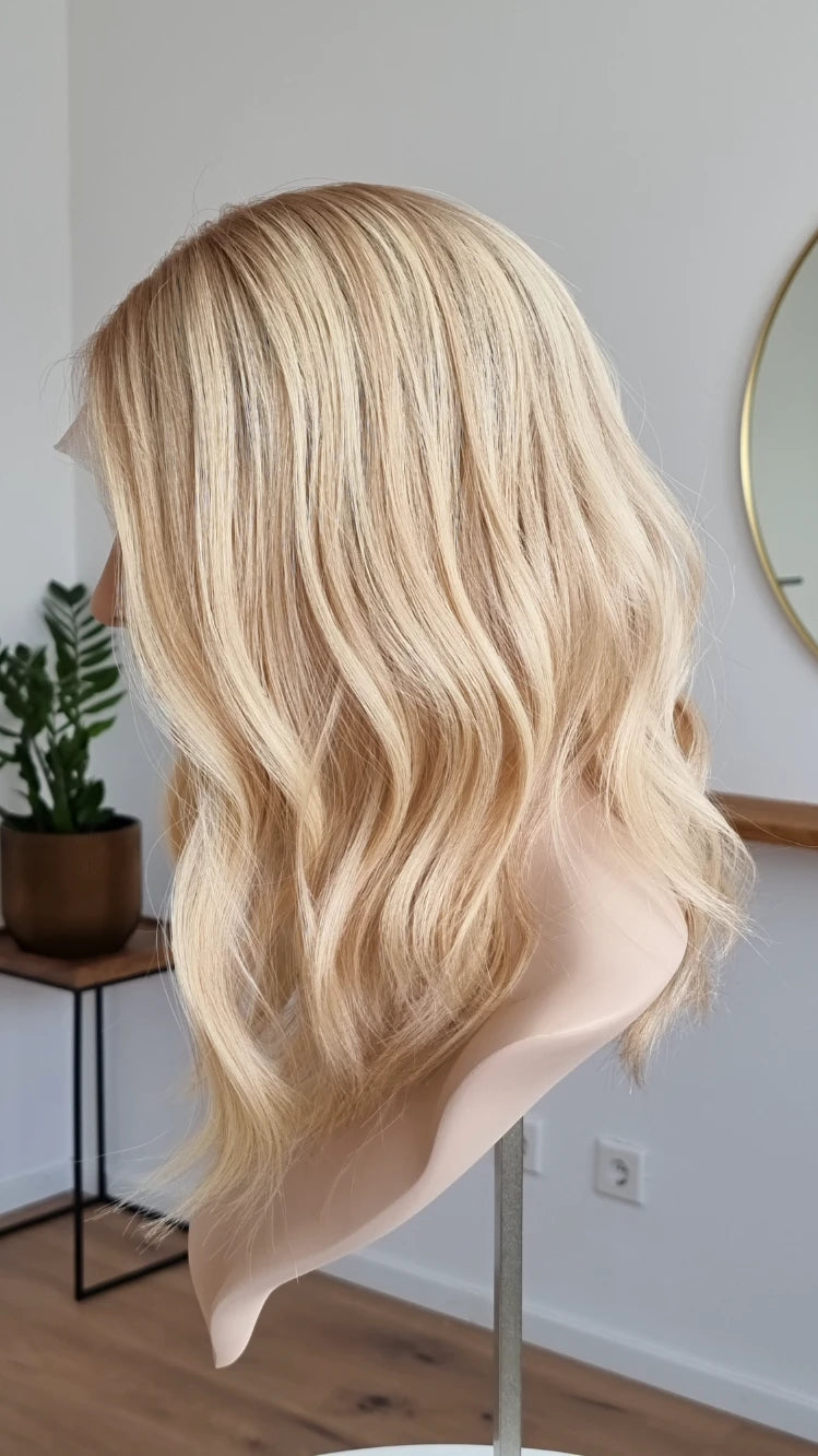 - Farbe Ansatz warmes Mittelblond, Längen Hellblond mit leichten Lowlights