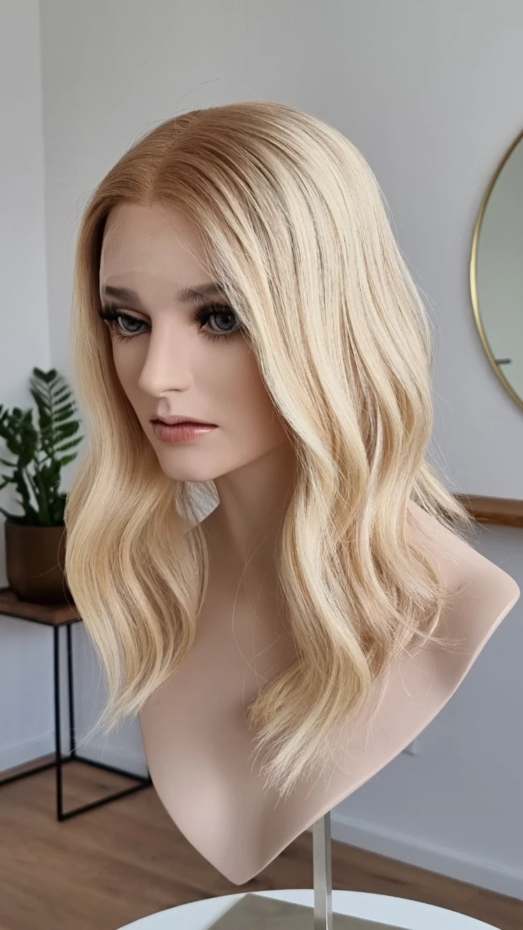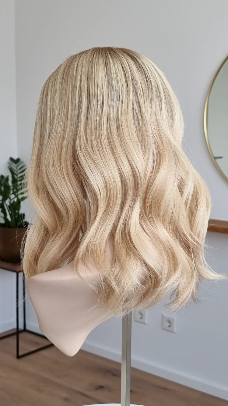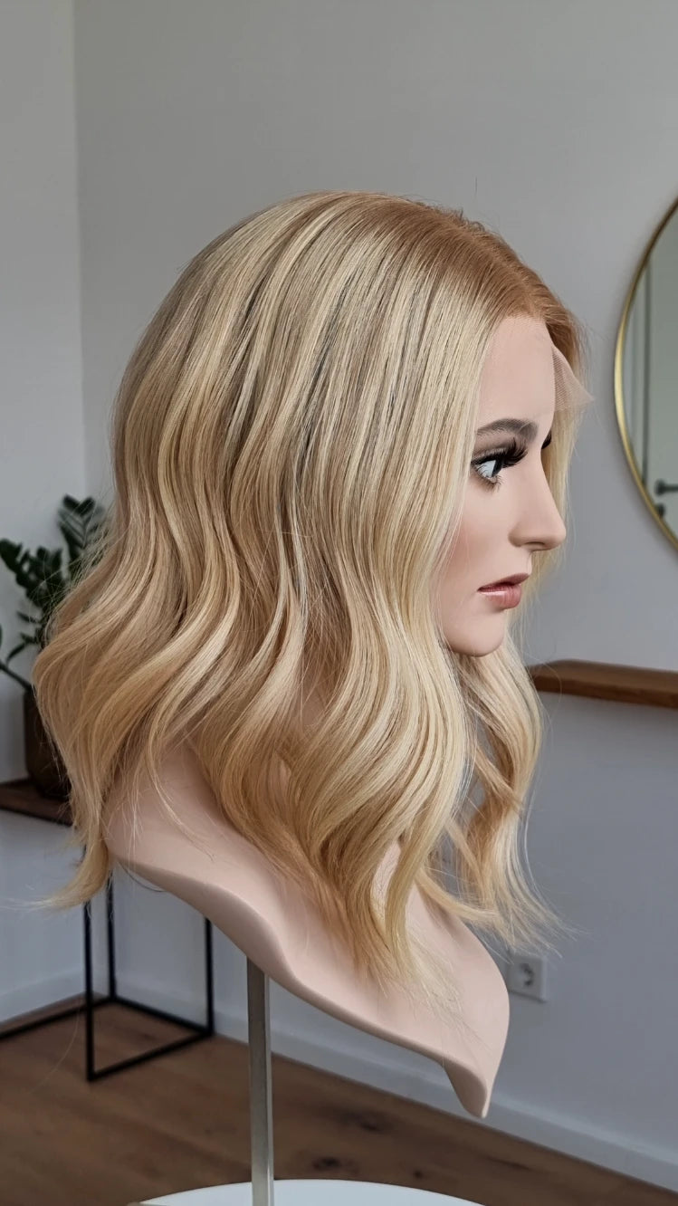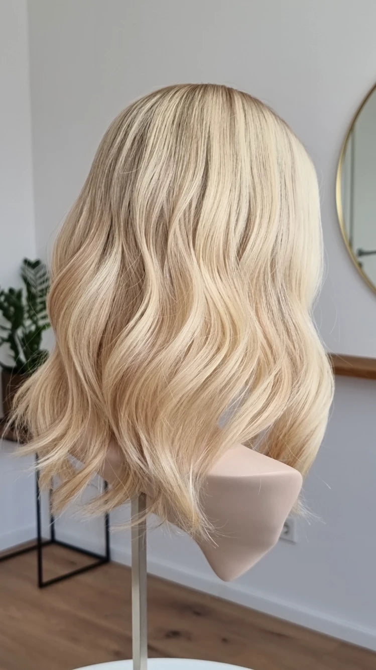 - Farbe Ansatz warmes Mittelblond, Längen Hellblond mit leichten Lowlights