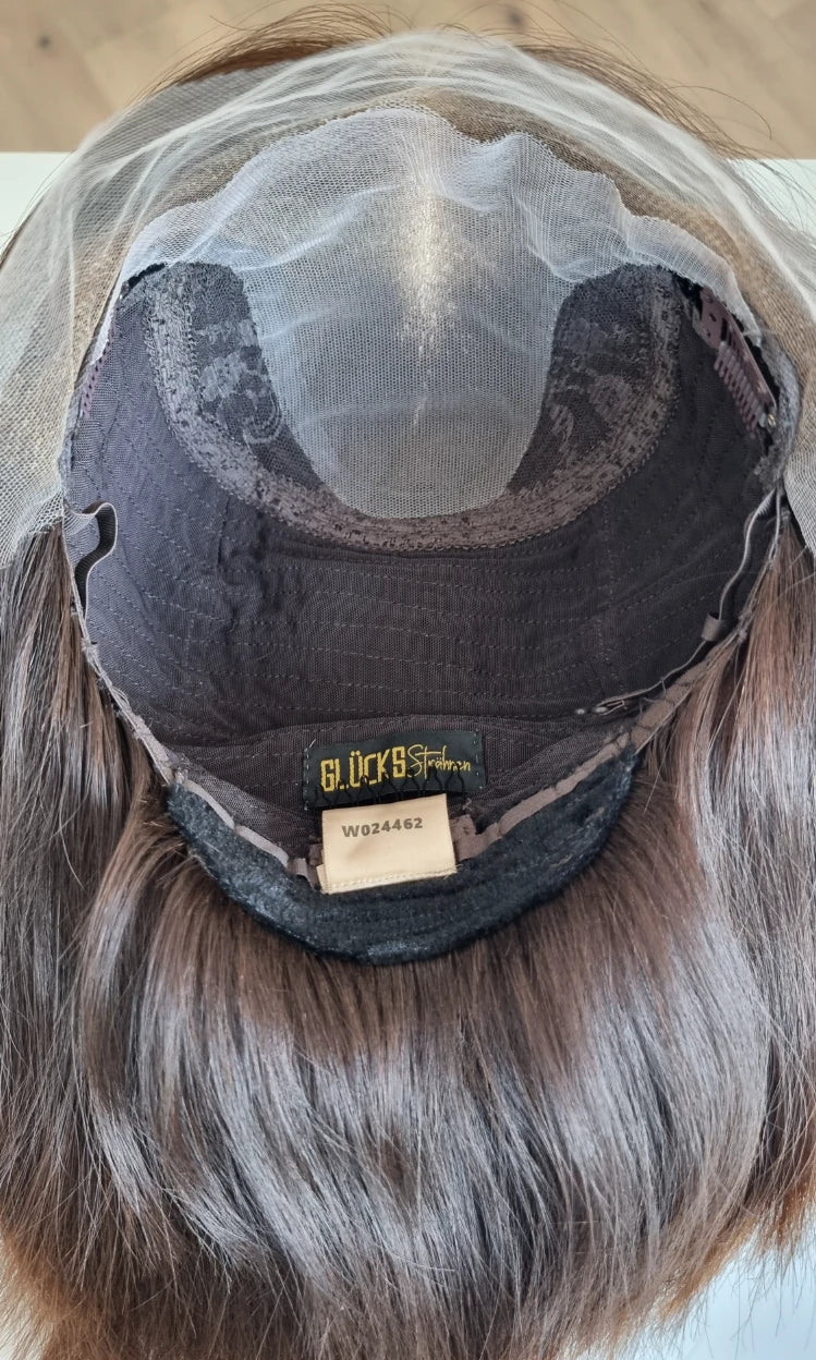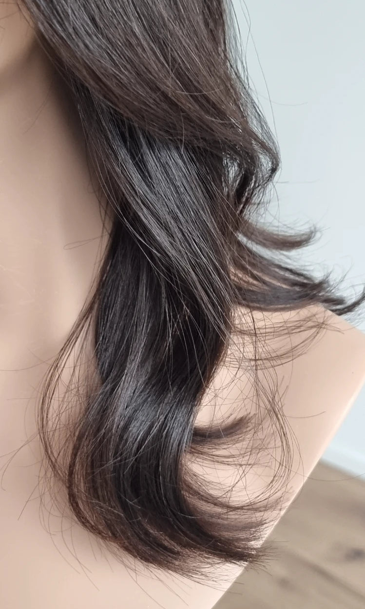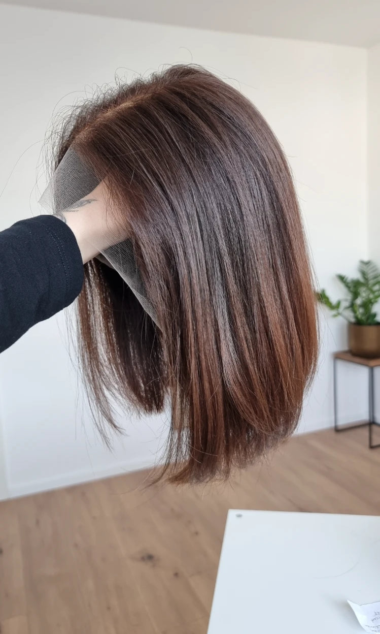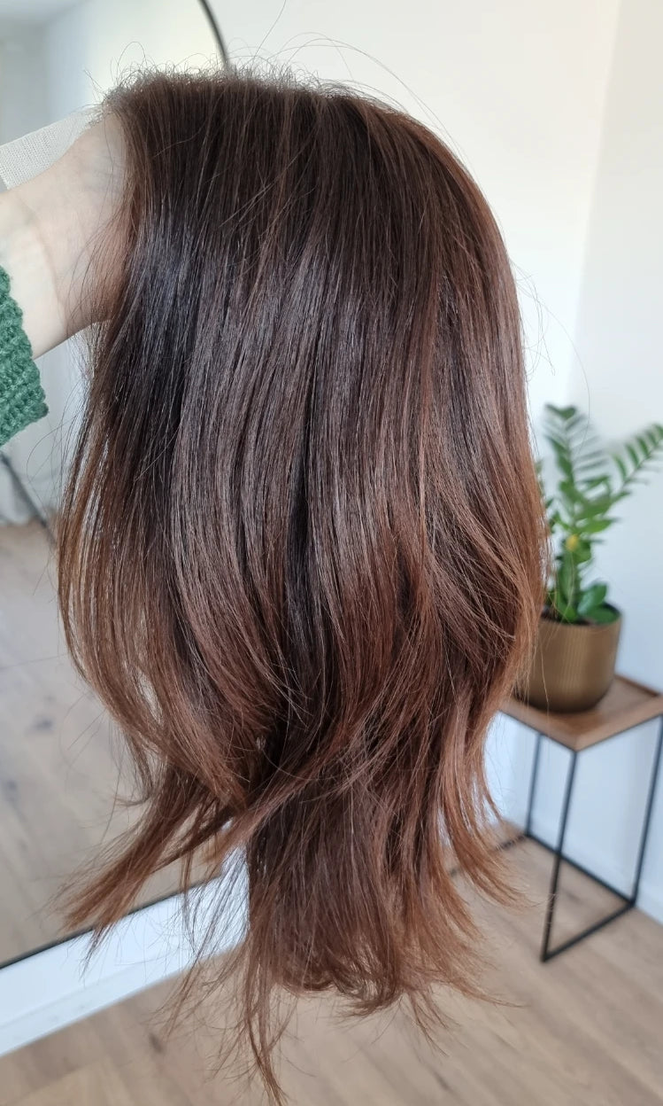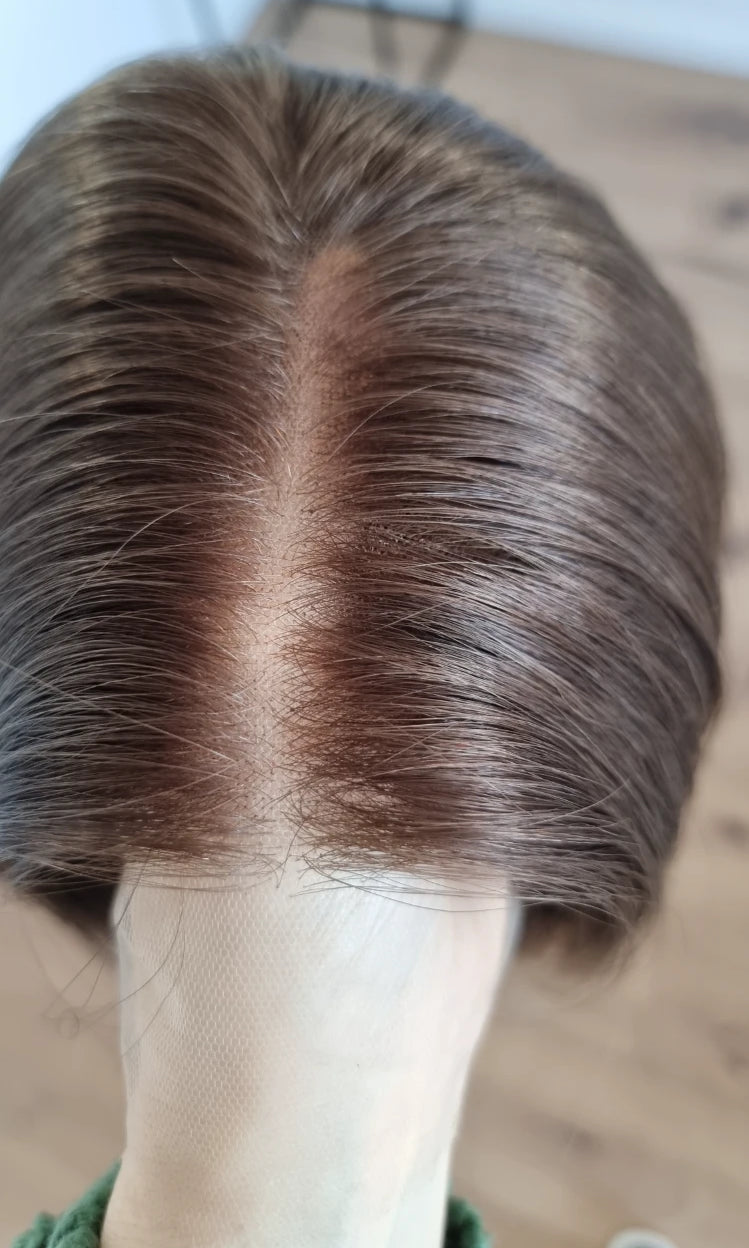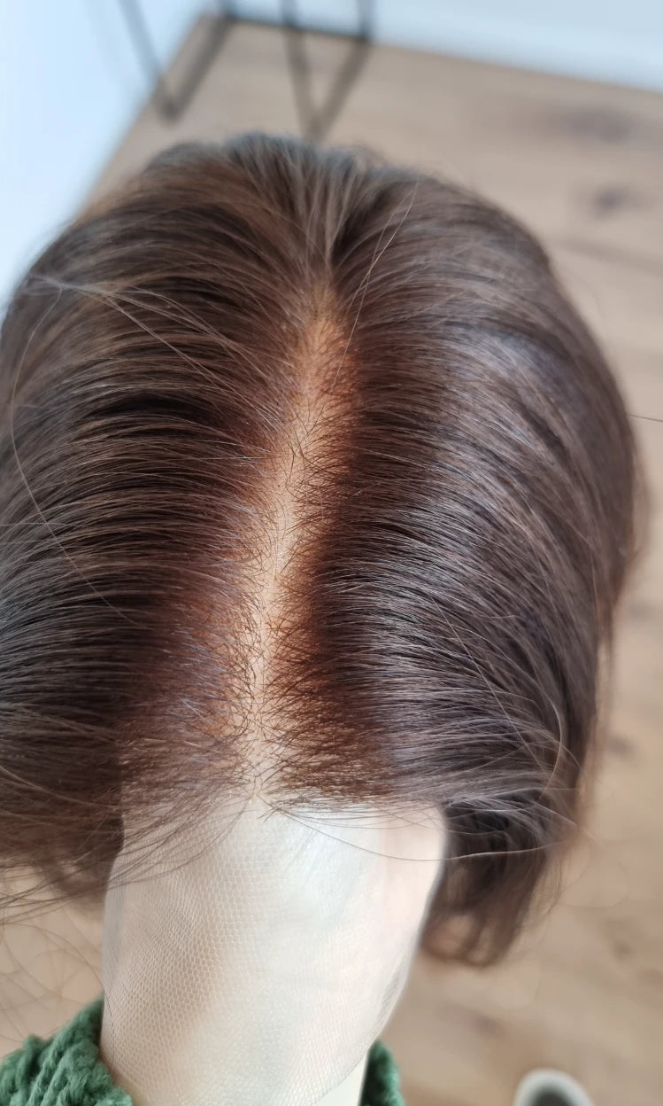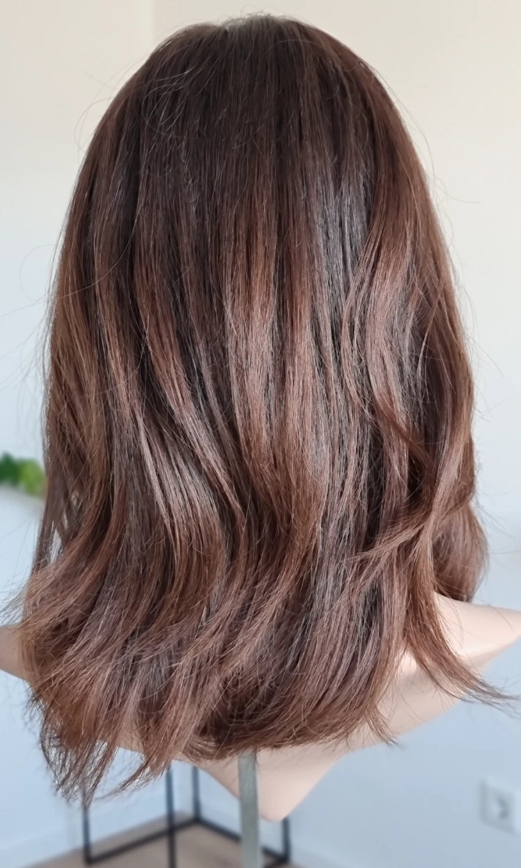 Eine Perücke bedeckt den gesamten Kopf und besteht aus verschiedenen Verarbeitungstechnicken, die gemeinsam für ein natürliches Aussehen sorgen.