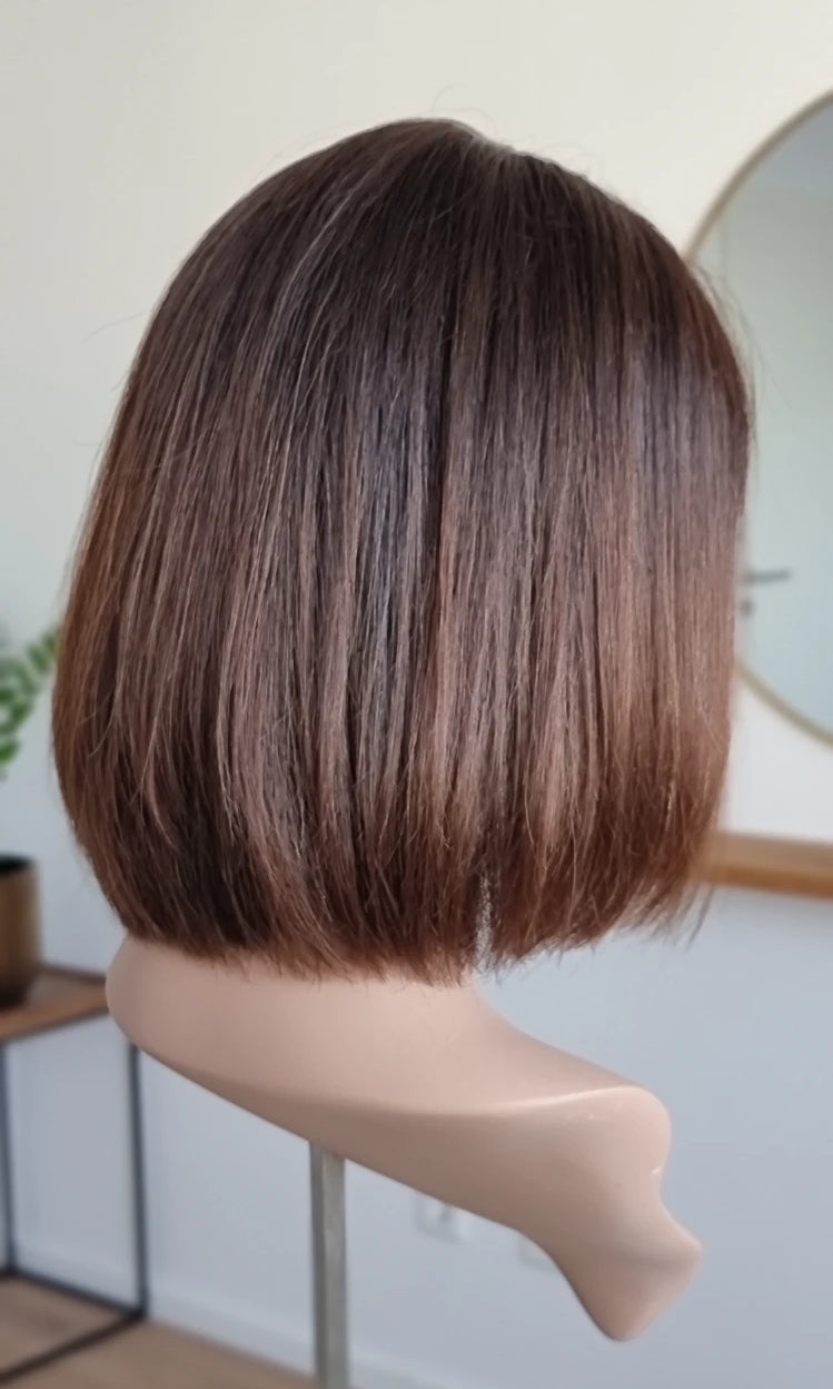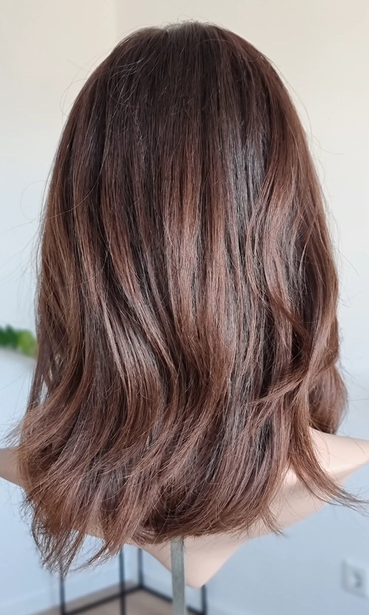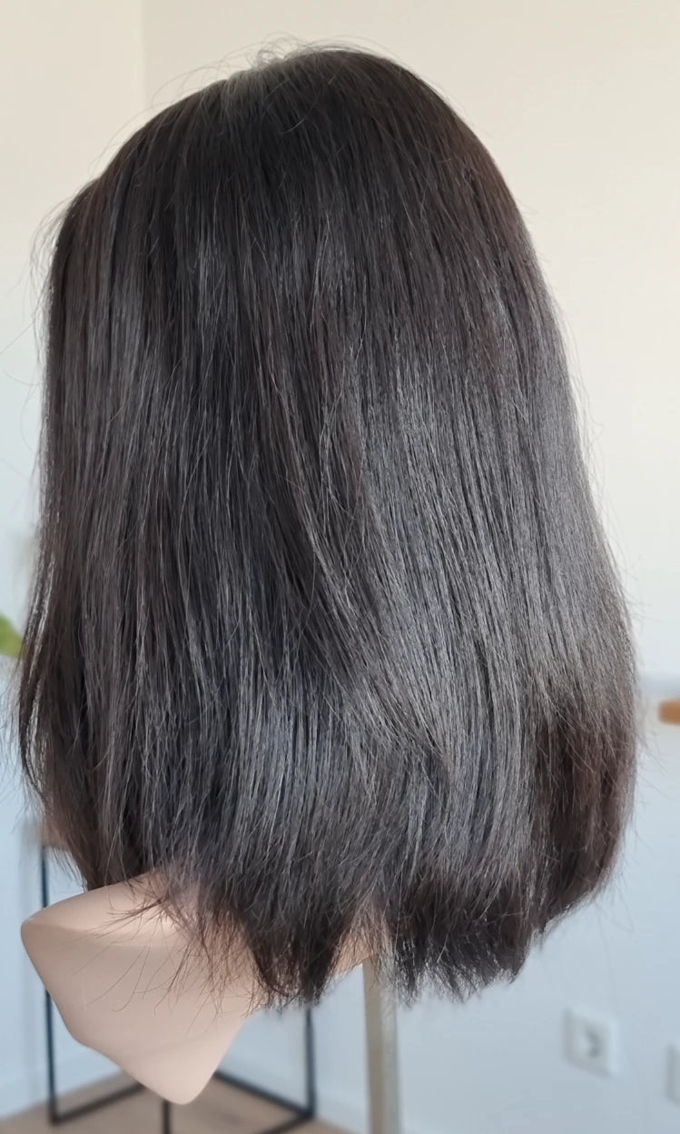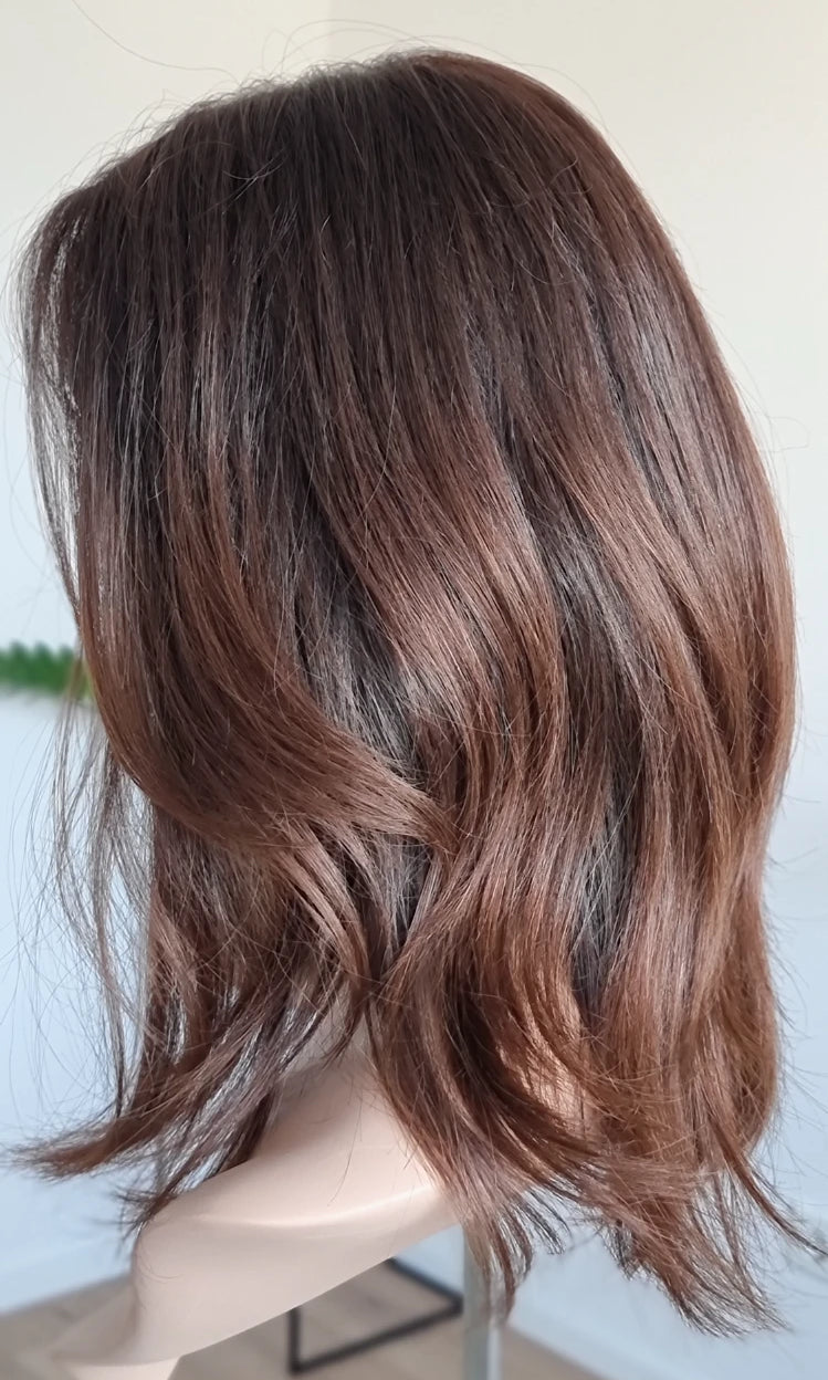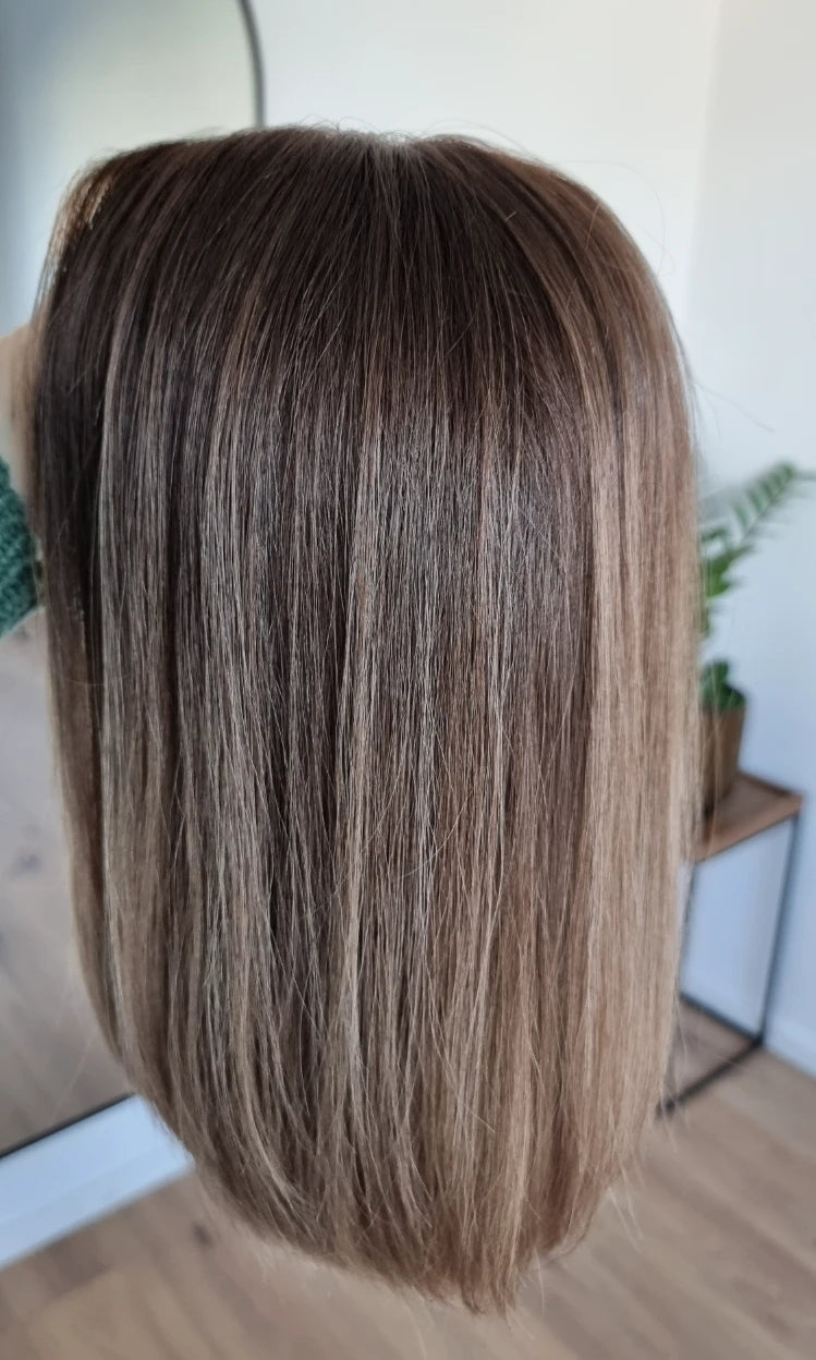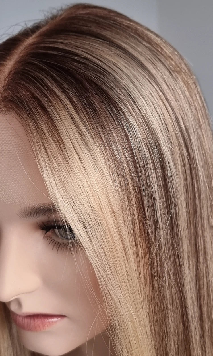 Eine Perücke bedeckt den gesamten Kopf und besteht aus verschiedenen Verarbeitungstechnicken, die gemeinsam für ein natürliches Aussehen sorgen.