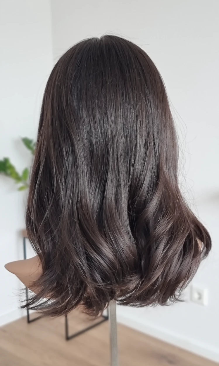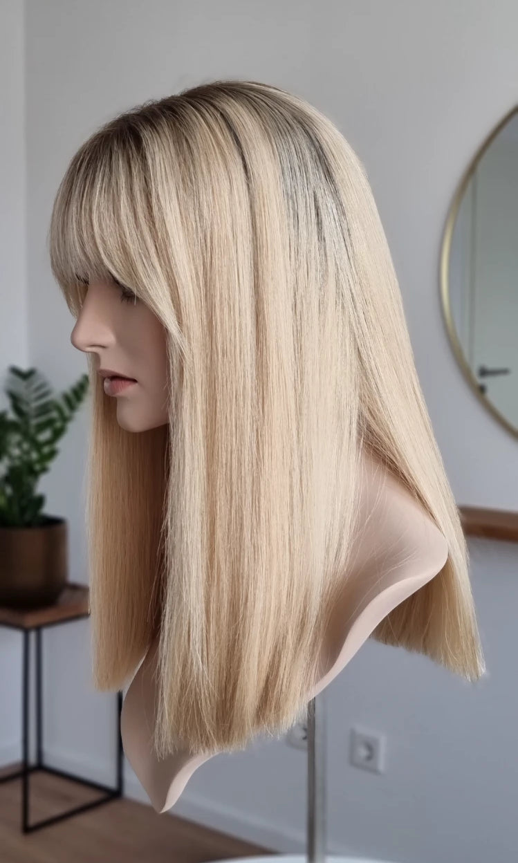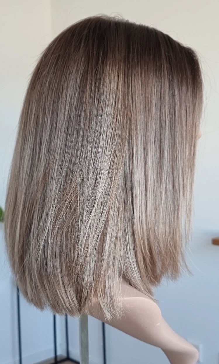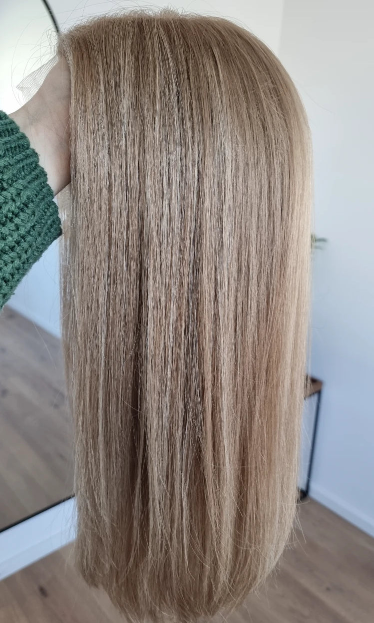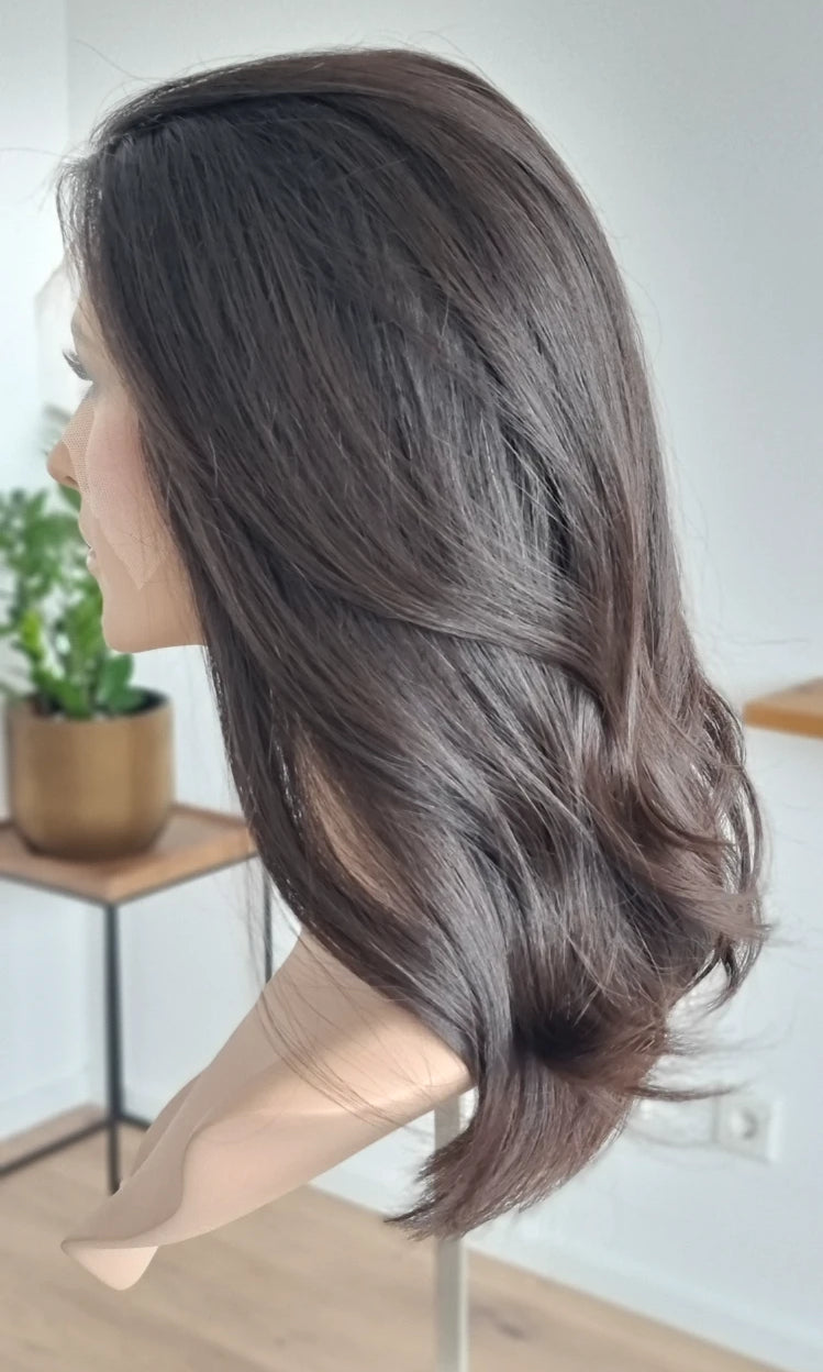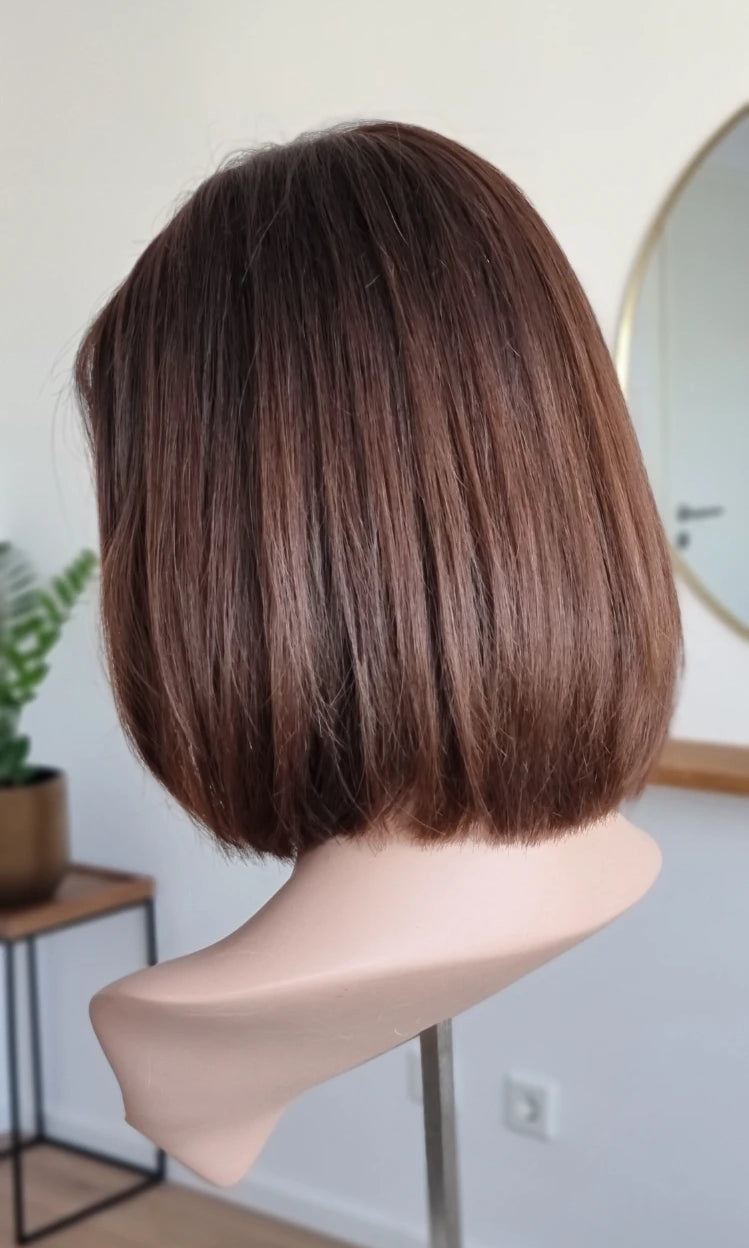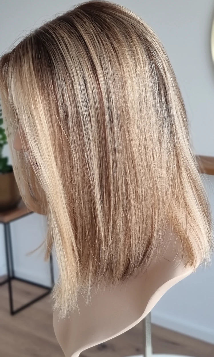 Eine Perücke bedeckt den gesamten Kopf und besteht aus verschiedenen Verarbeitungstechnicken, die gemeinsam für ein natürliches Aussehen sorgen.
