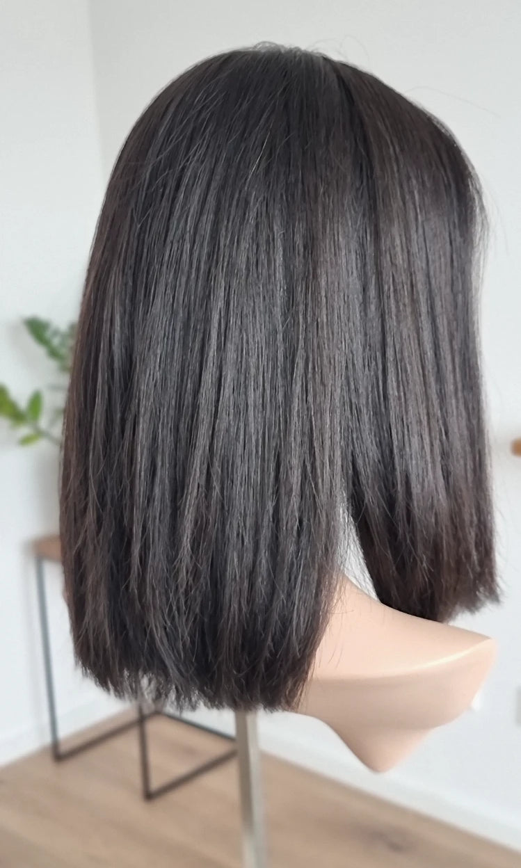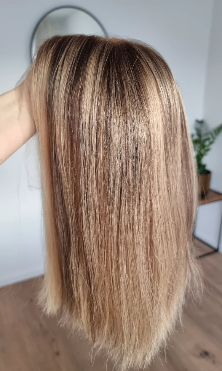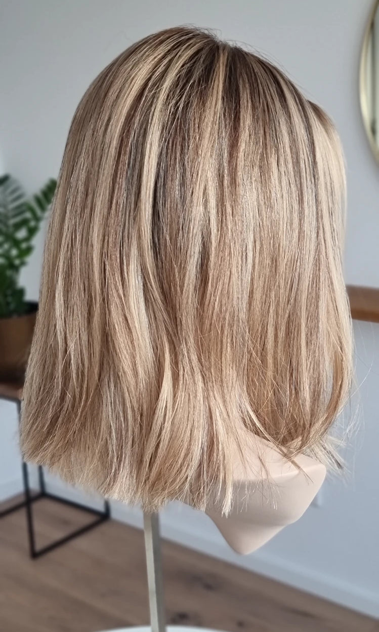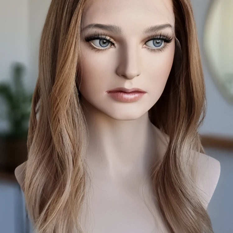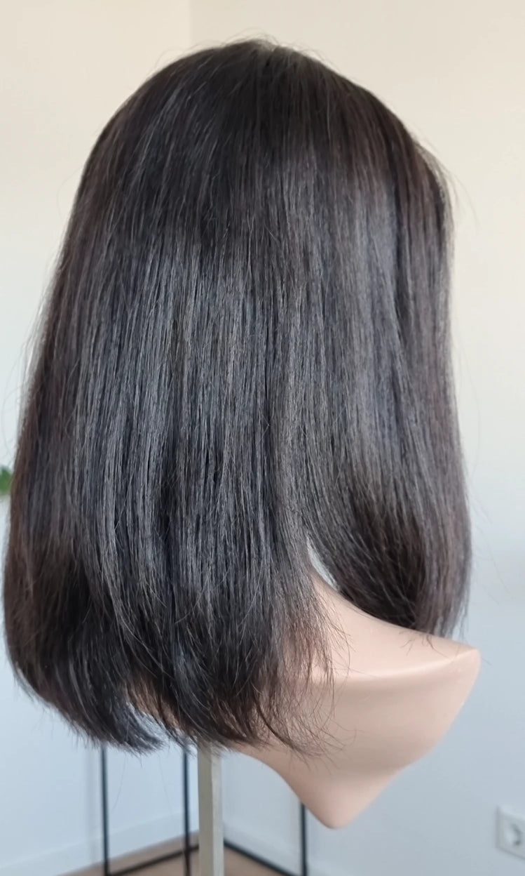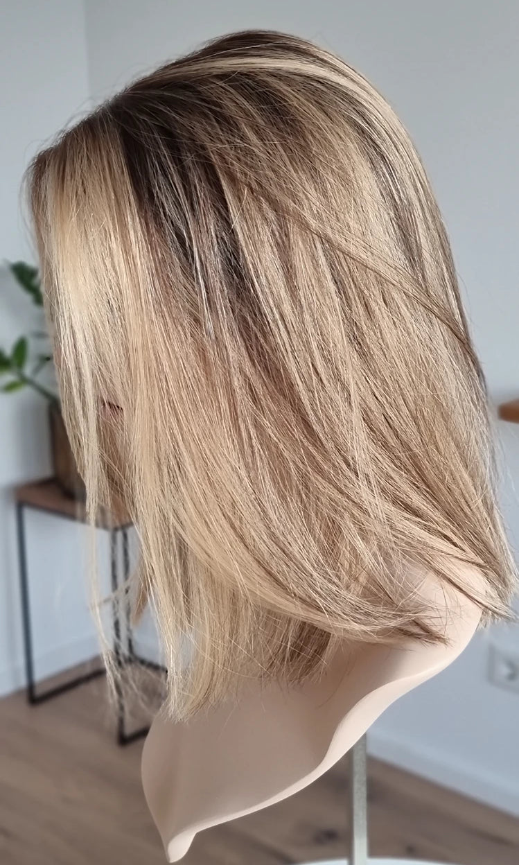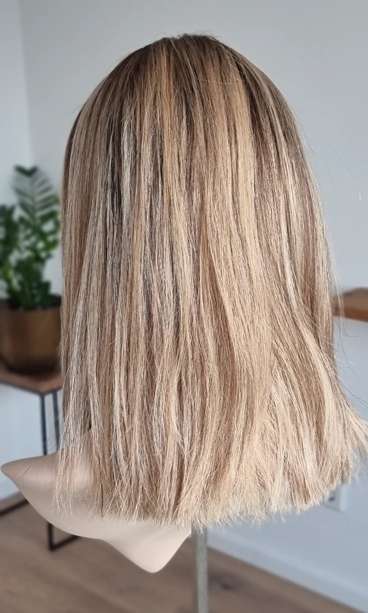 Eine Perücke bedeckt den gesamten Kopf und besteht aus verschiedenen Verarbeitungstechnicken, die gemeinsam für ein natürliches Aussehen sorgen.