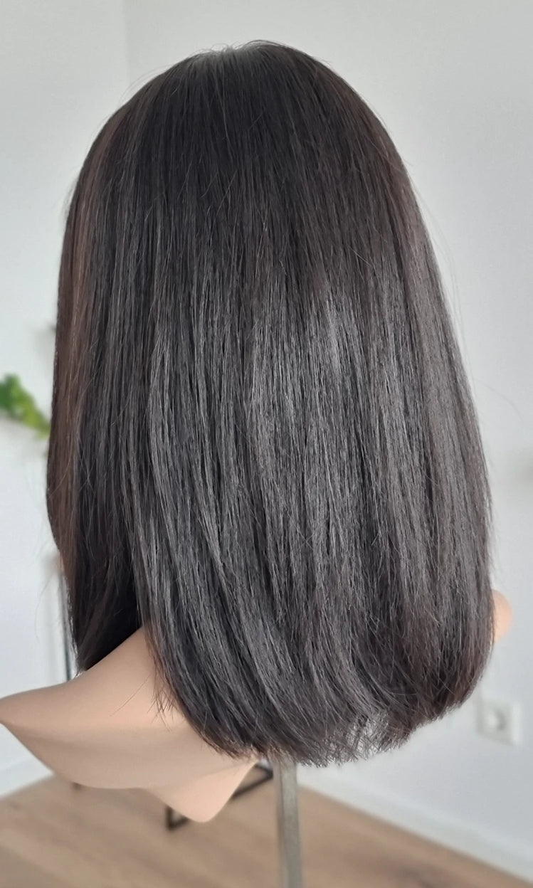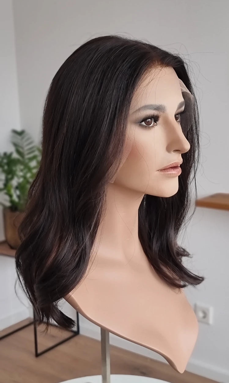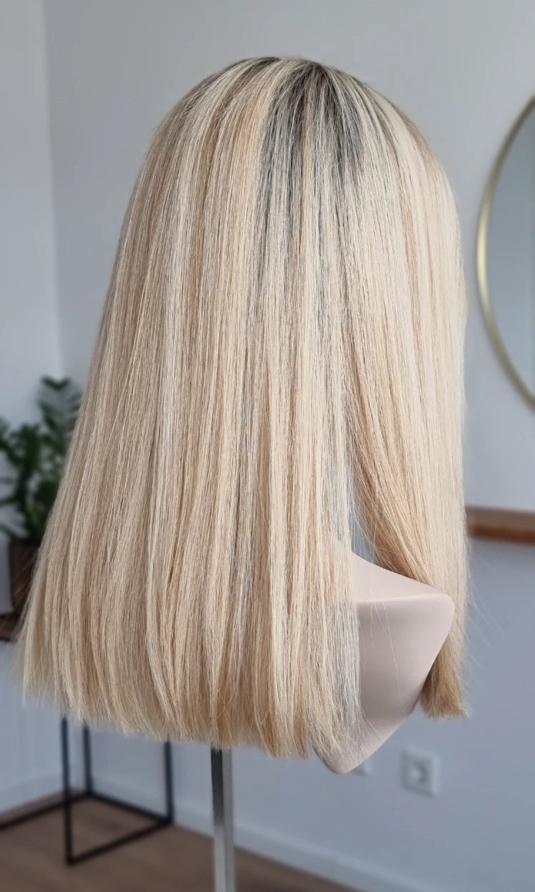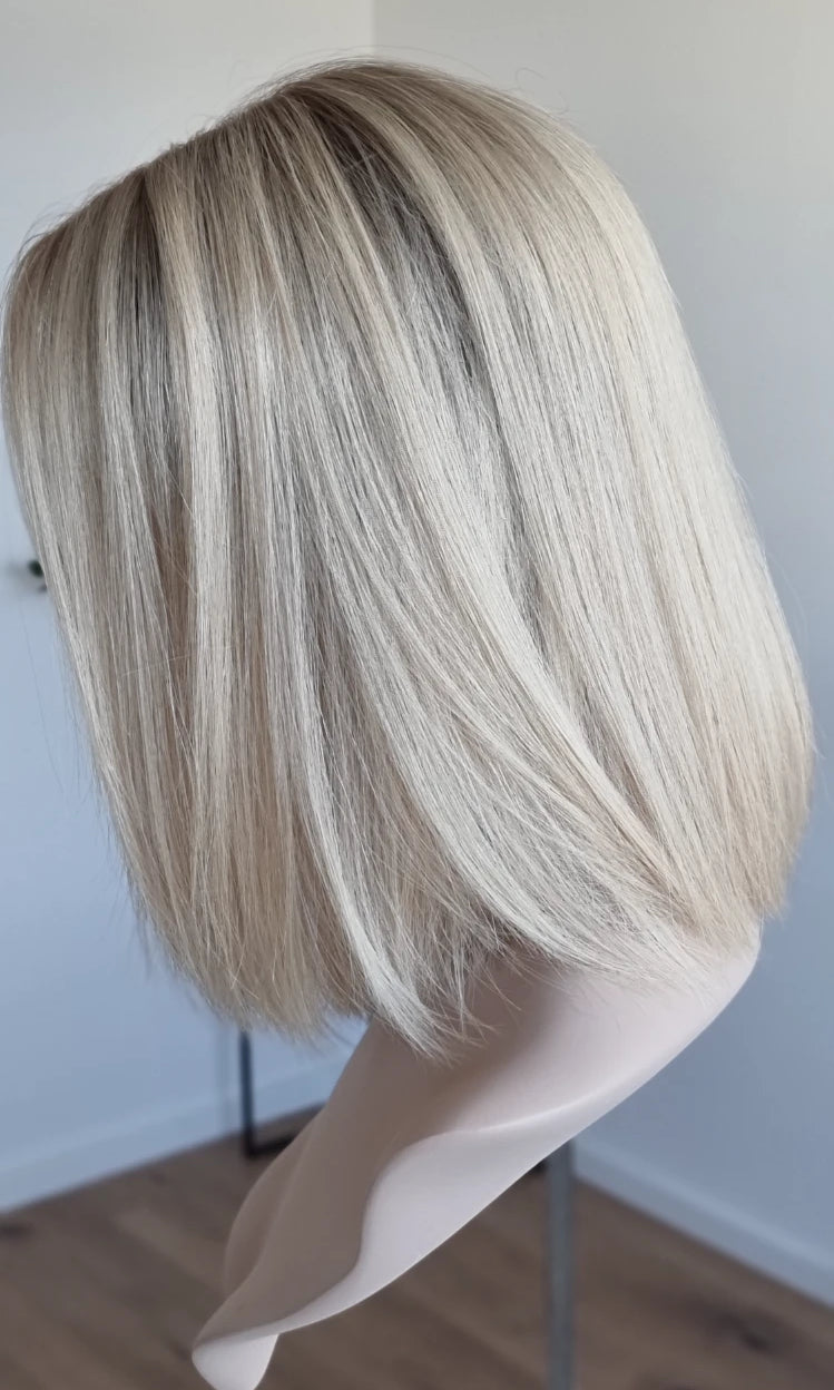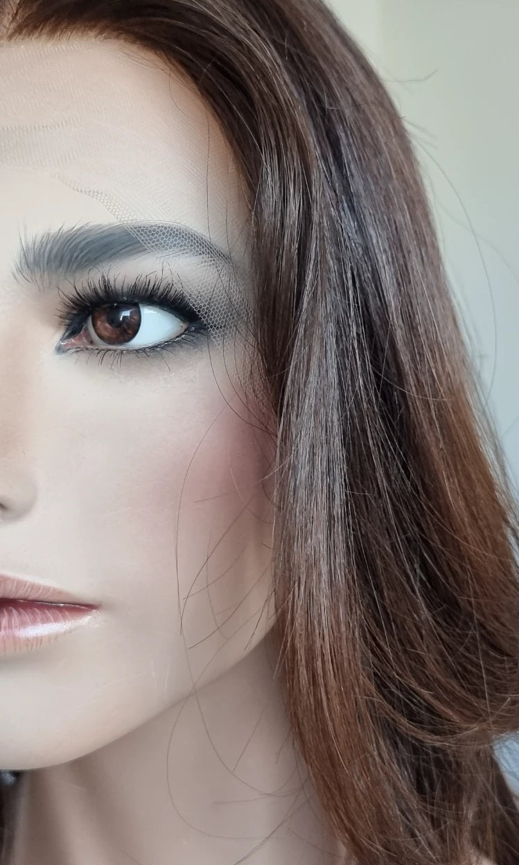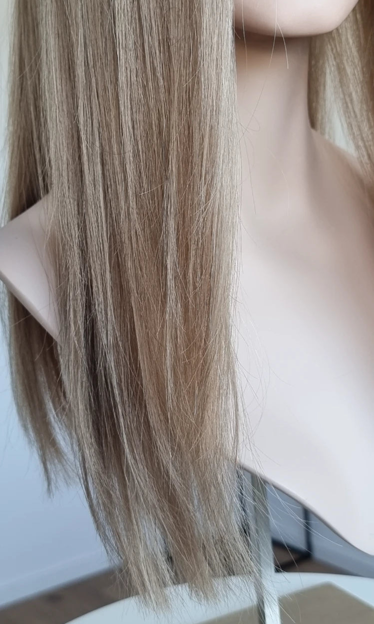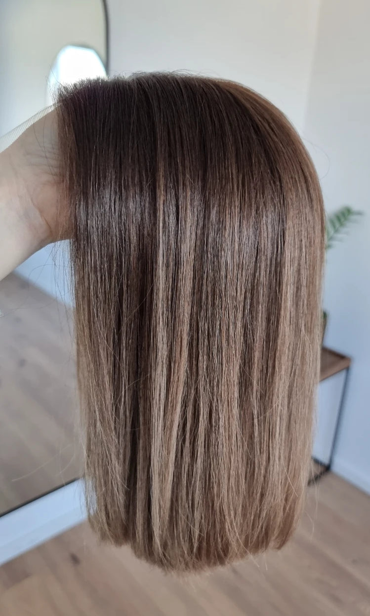Eine Perücke bedeckt den gesamten Kopf und besteht aus verschiedenen Verarbeitungstechnicken, die gemeinsam für ein natürliches Aussehen sorgen.