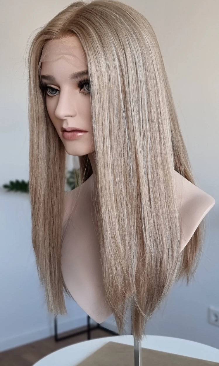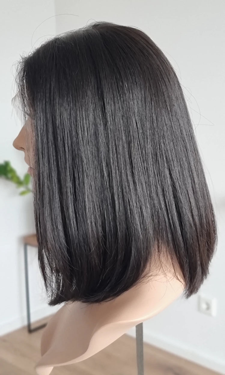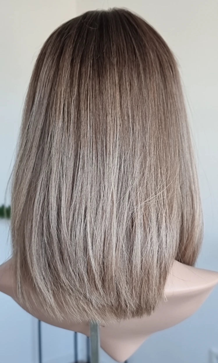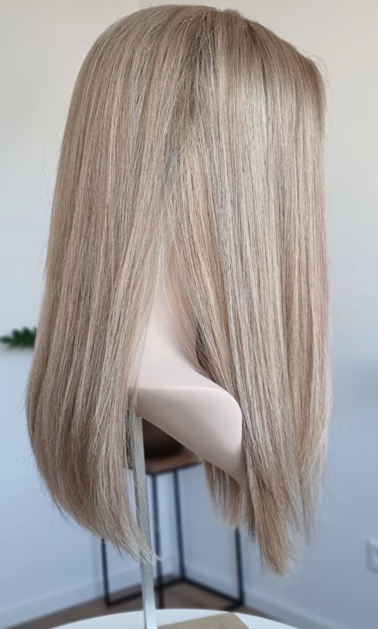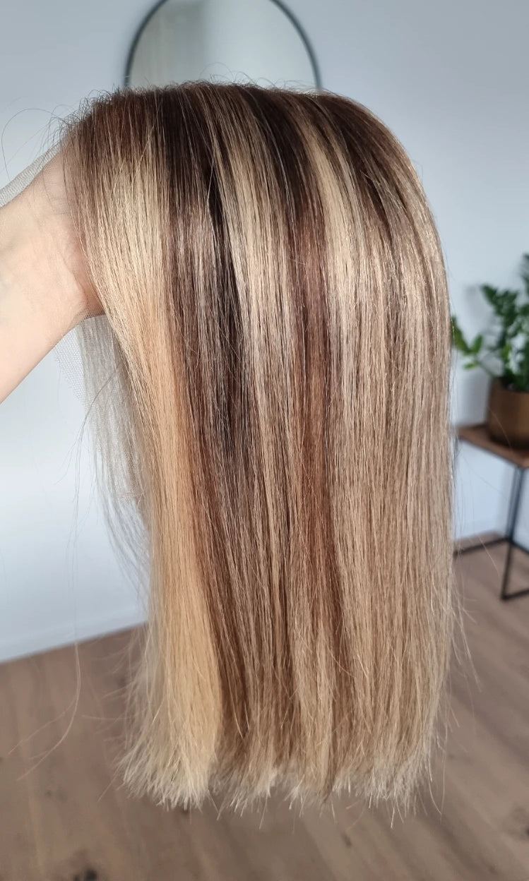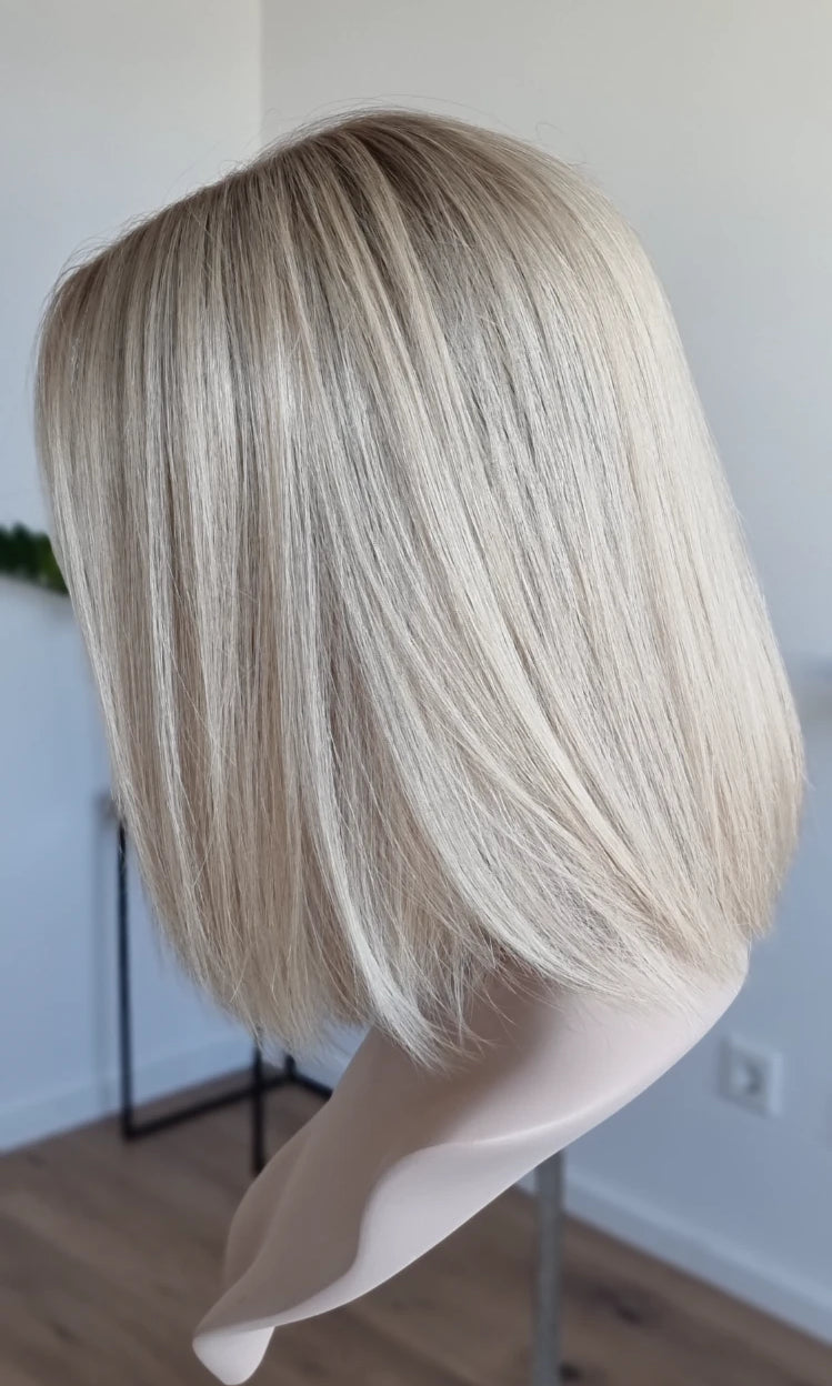 Eine Perücke bedeckt den gesamten Kopf und besteht aus verschiedenen Verarbeitungstechnicken, die gemeinsam für ein natürliches Aussehen sorgen.