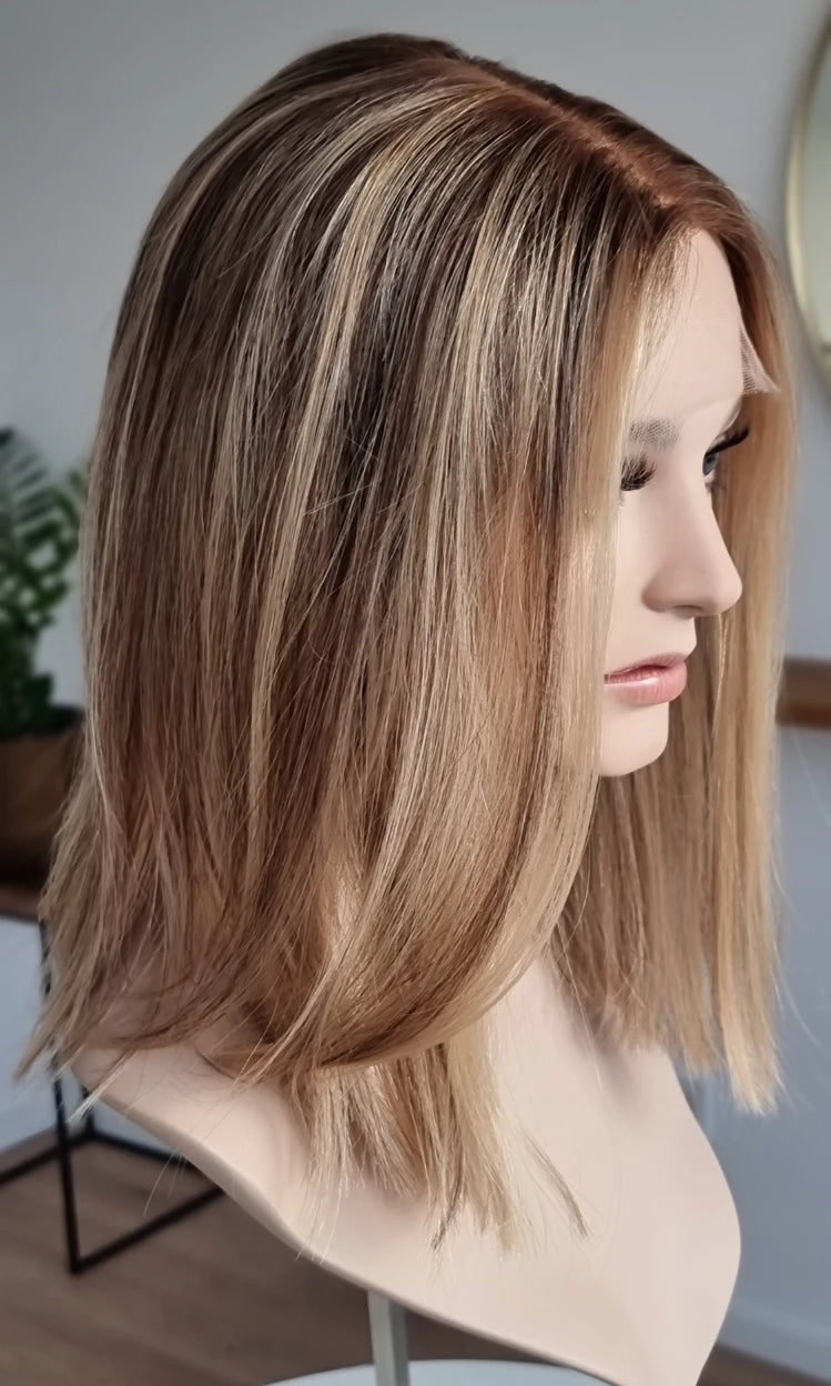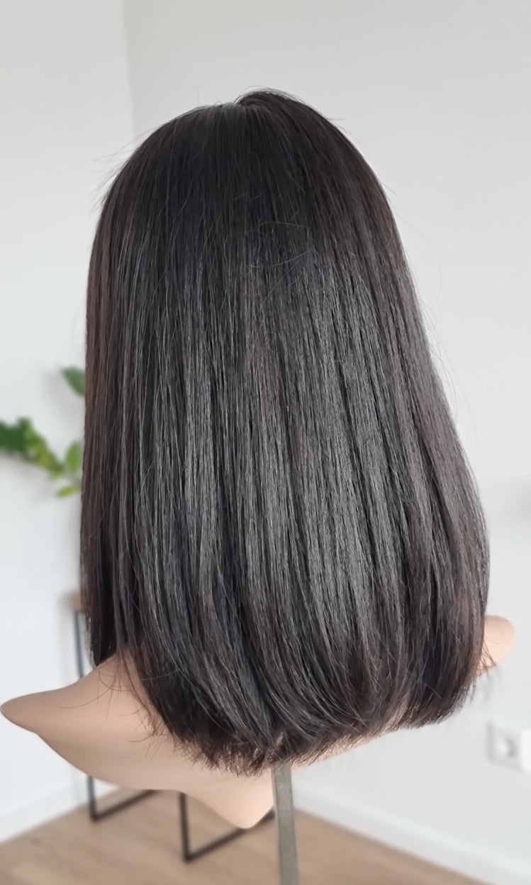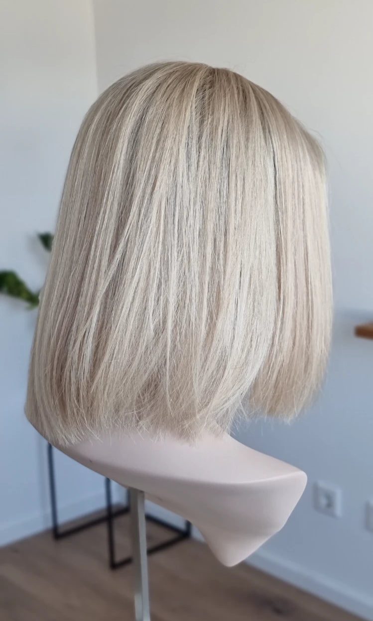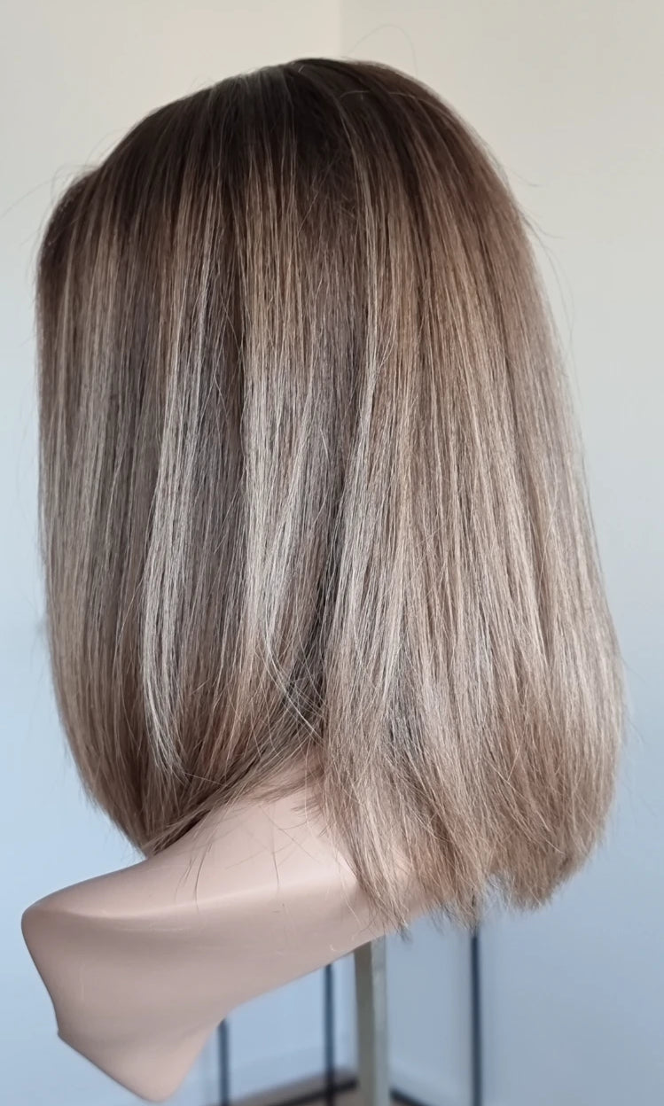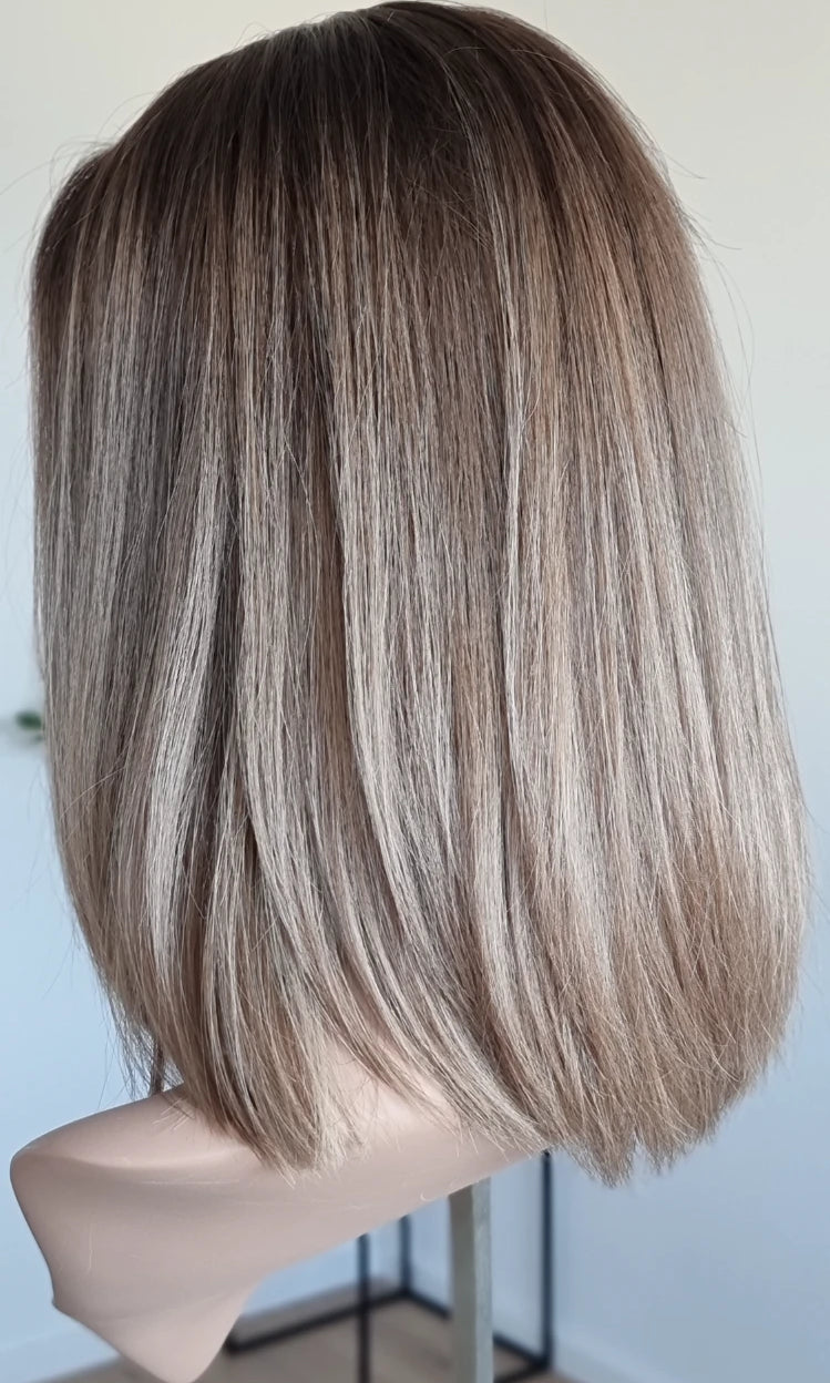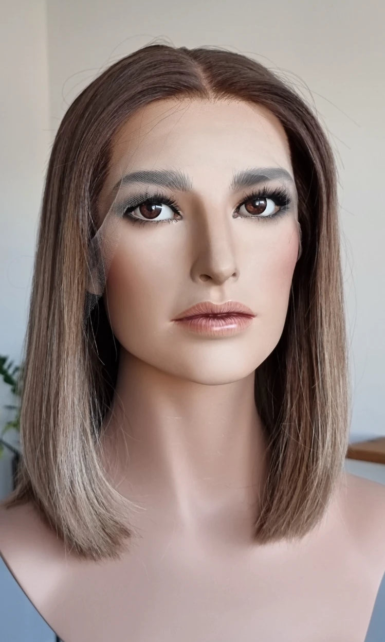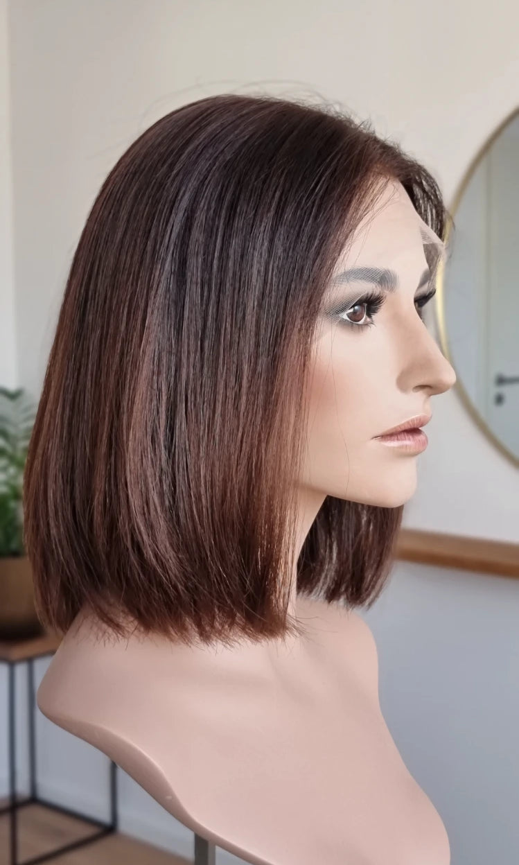 Eine Perücke bedeckt den gesamten Kopf und besteht aus verschiedenen Verarbeitungstechnicken, die gemeinsam für ein natürliches Aussehen sorgen.