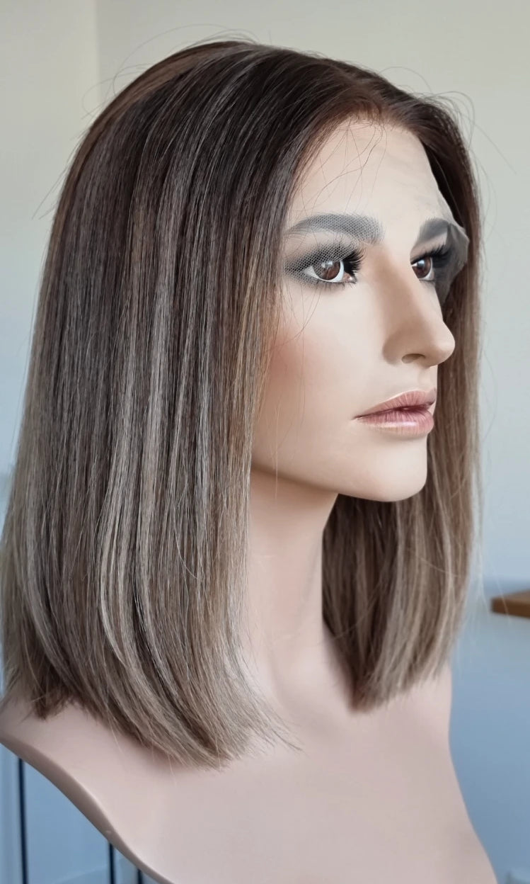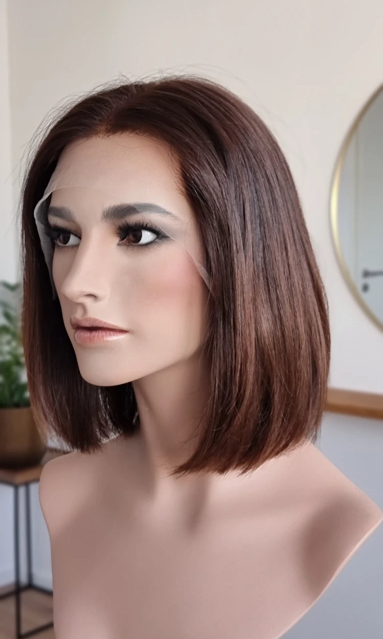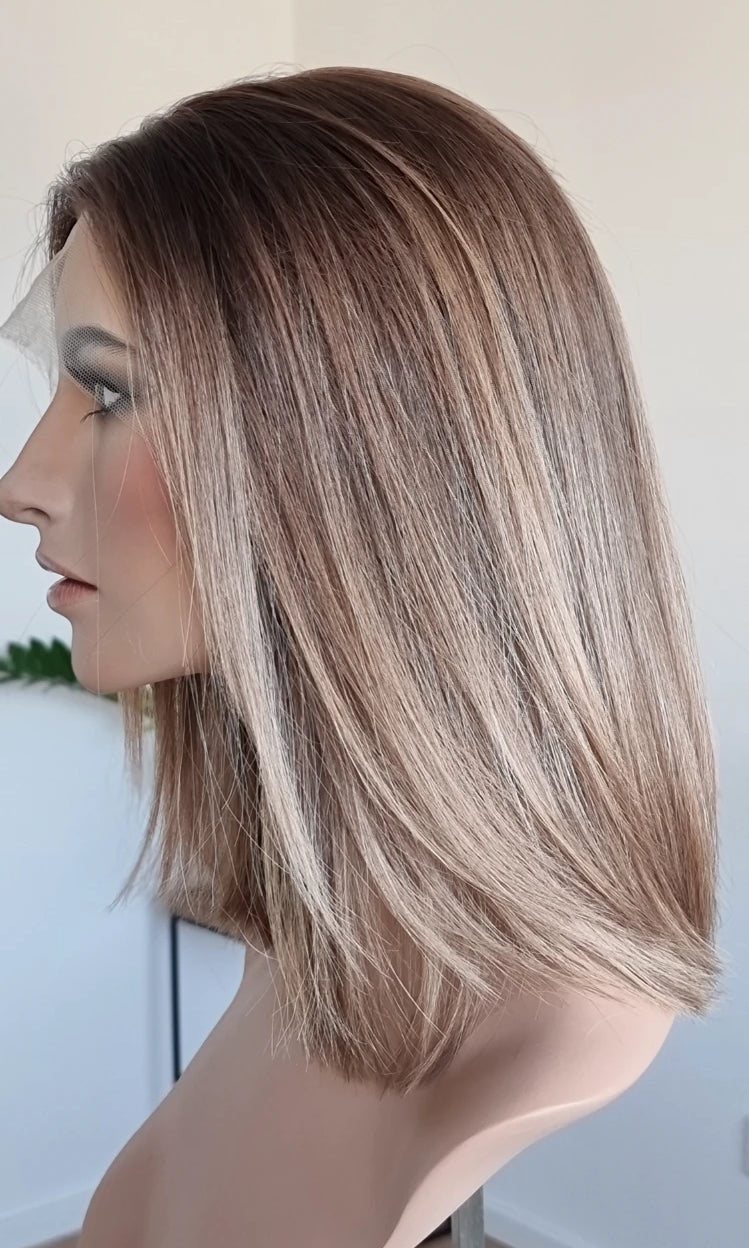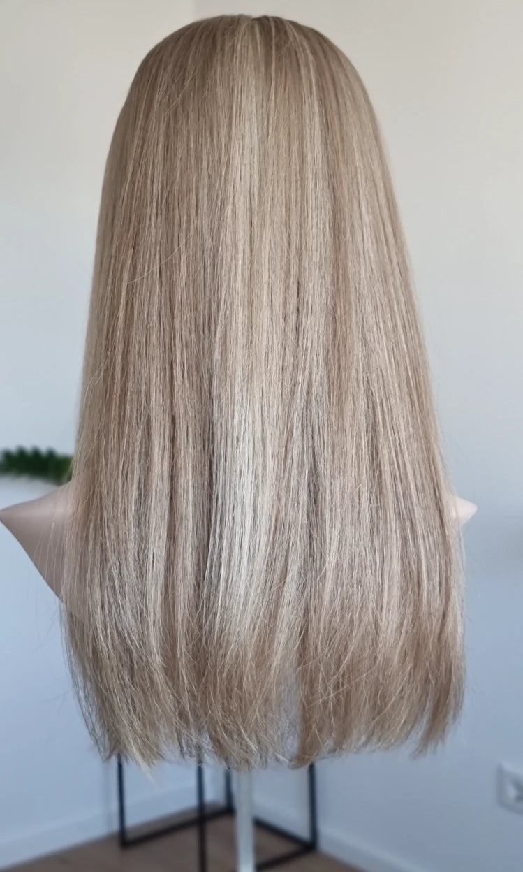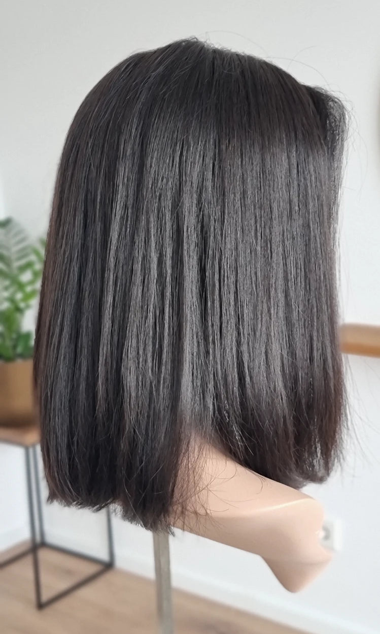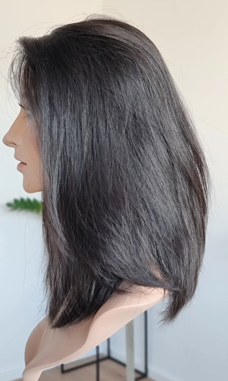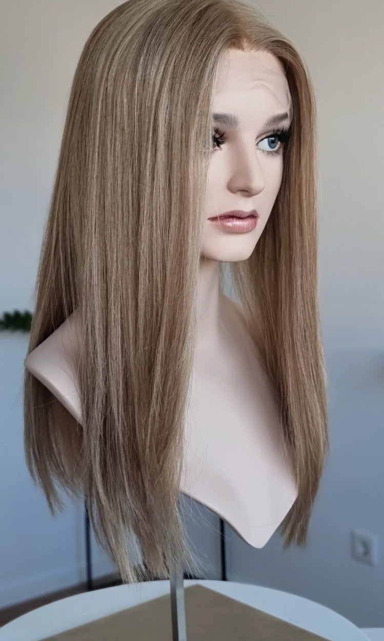 Eine Perücke bedeckt den gesamten Kopf und besteht aus verschiedenen Verarbeitungstechnicken, die gemeinsam für ein natürliches Aussehen sorgen.