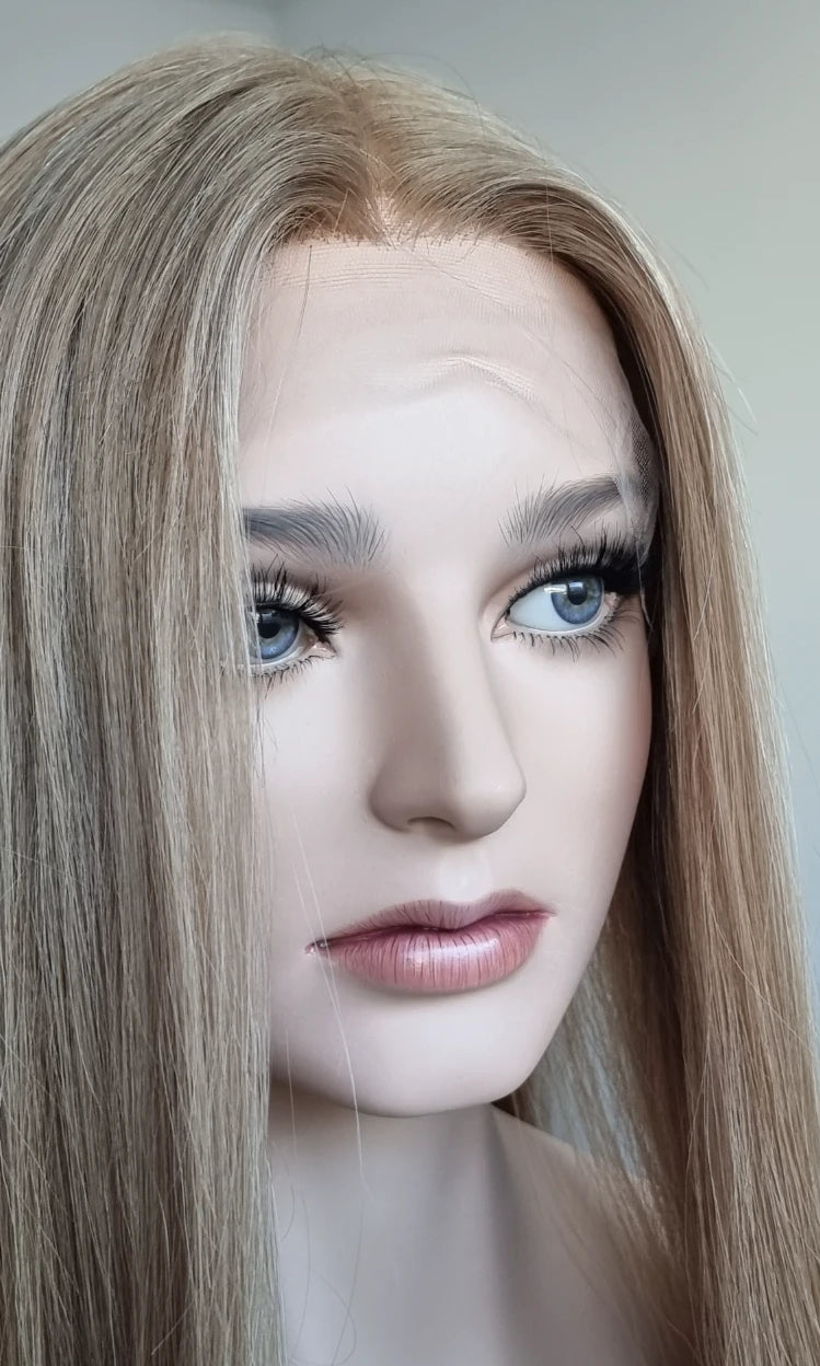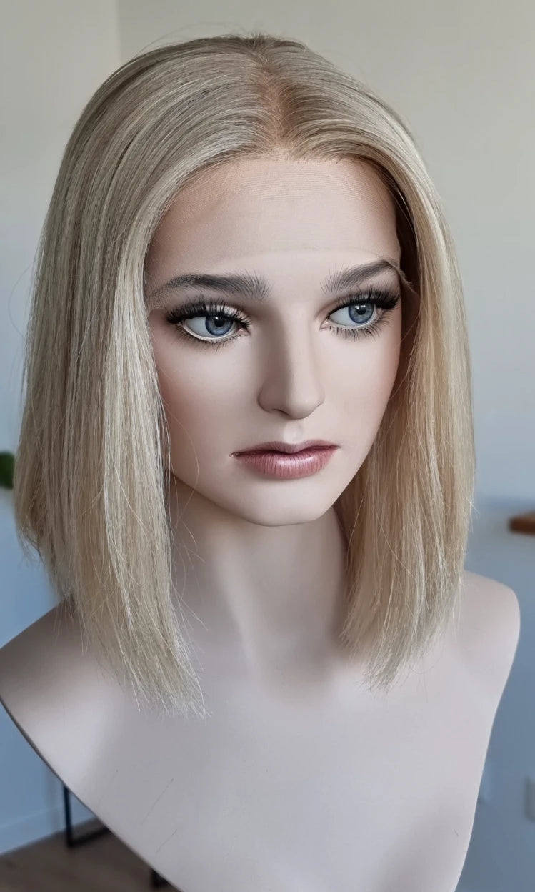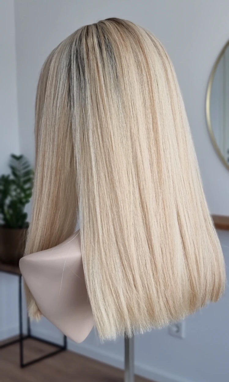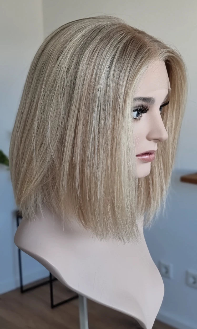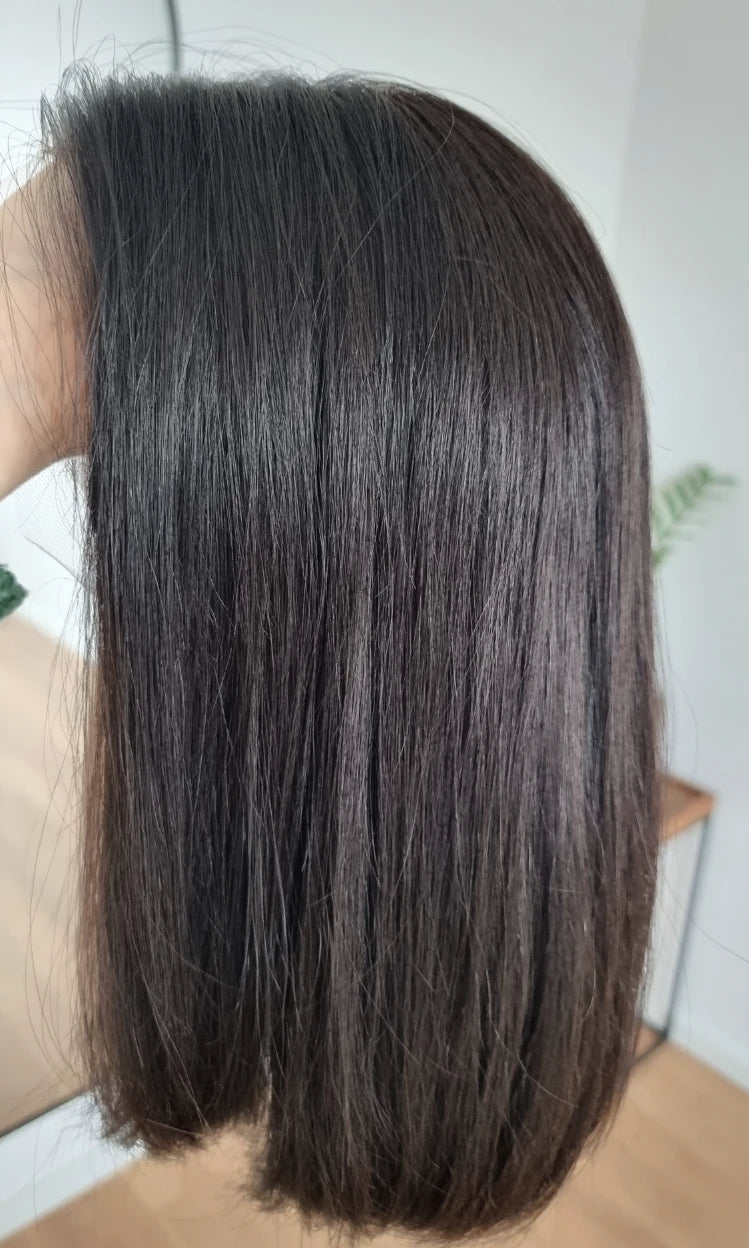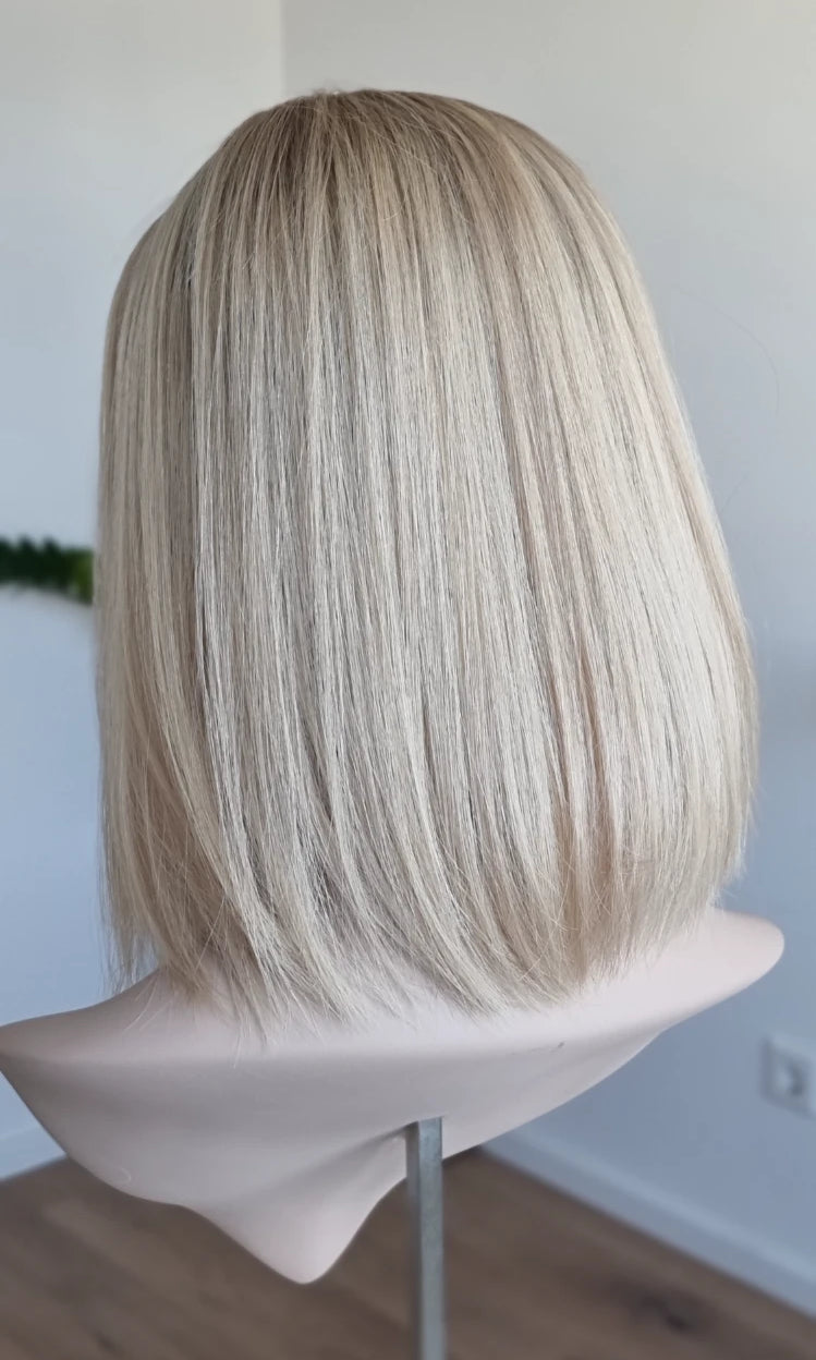 Eine Perücke bedeckt den gesamten Kopf und besteht aus verschiedenen Verarbeitungstechnicken, die gemeinsam für ein natürliches Aussehen sorgen.