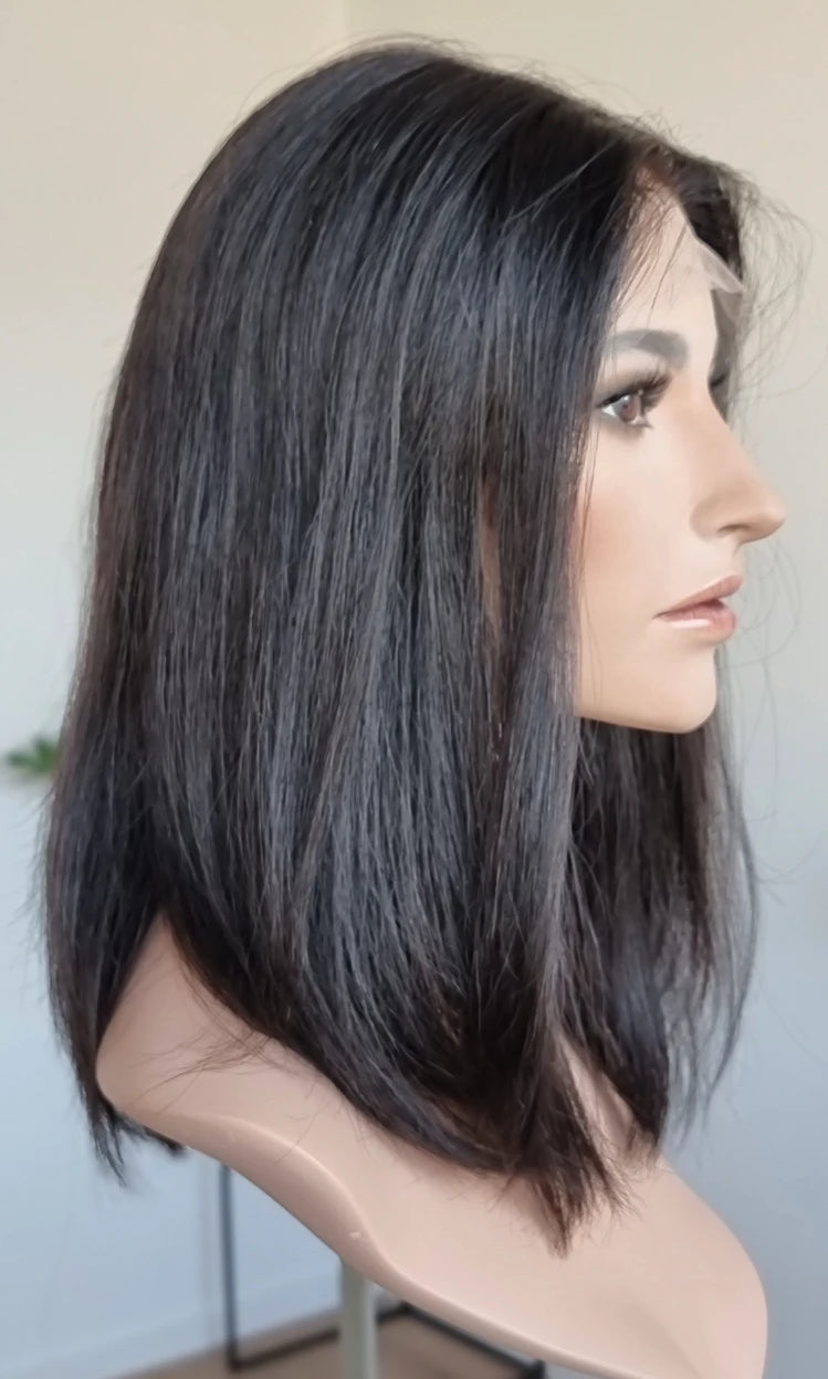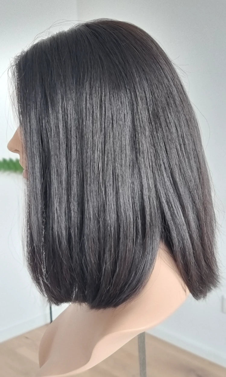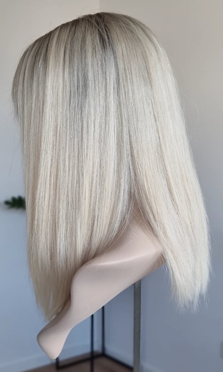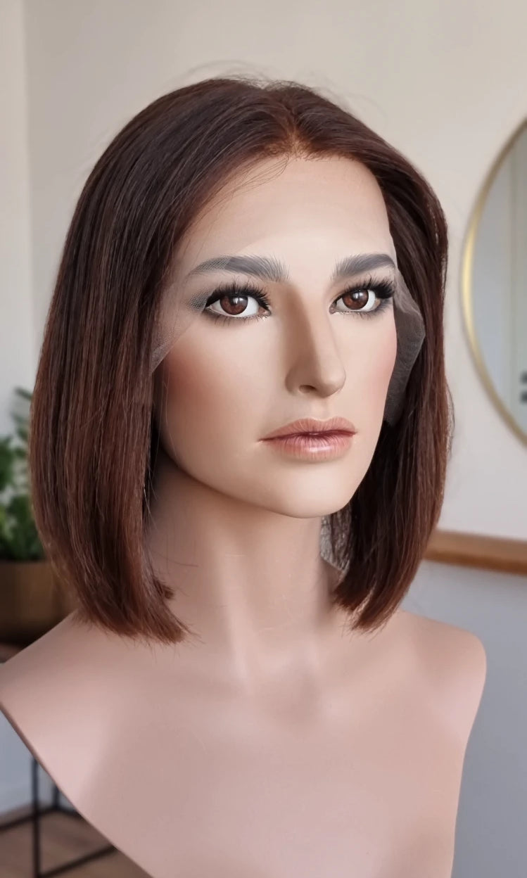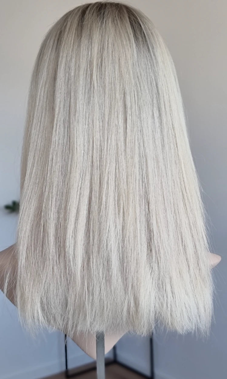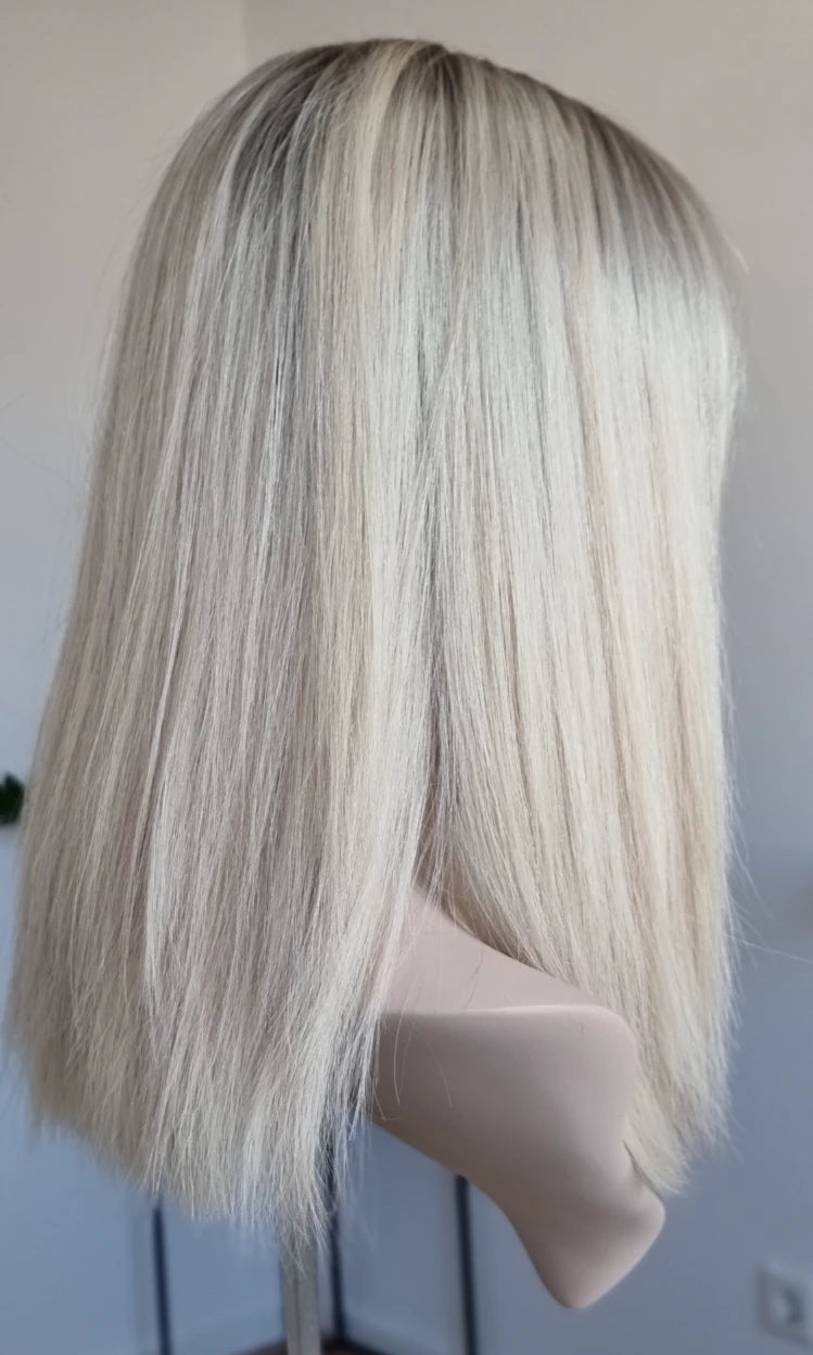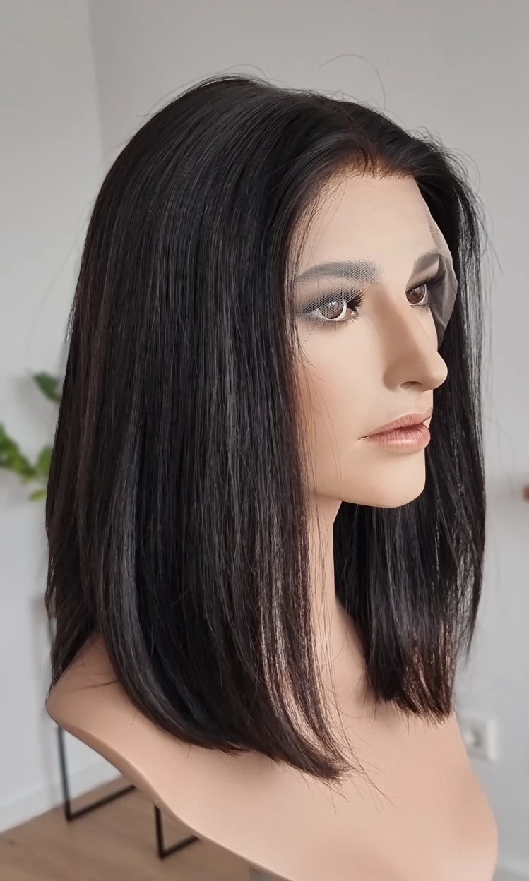 Eine Perücke bedeckt den gesamten Kopf und besteht aus verschiedenen Verarbeitungstechnicken, die gemeinsam für ein natürliches Aussehen sorgen.