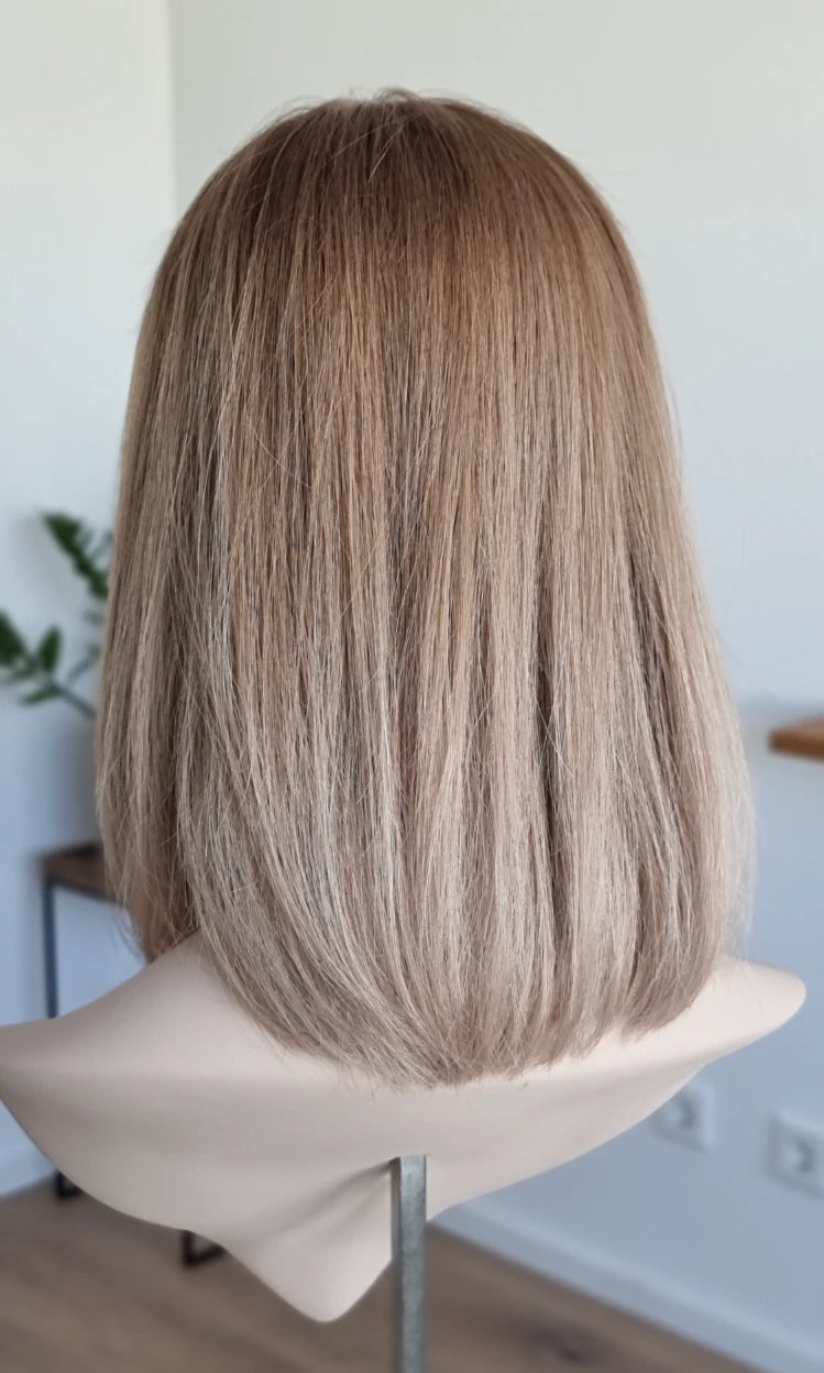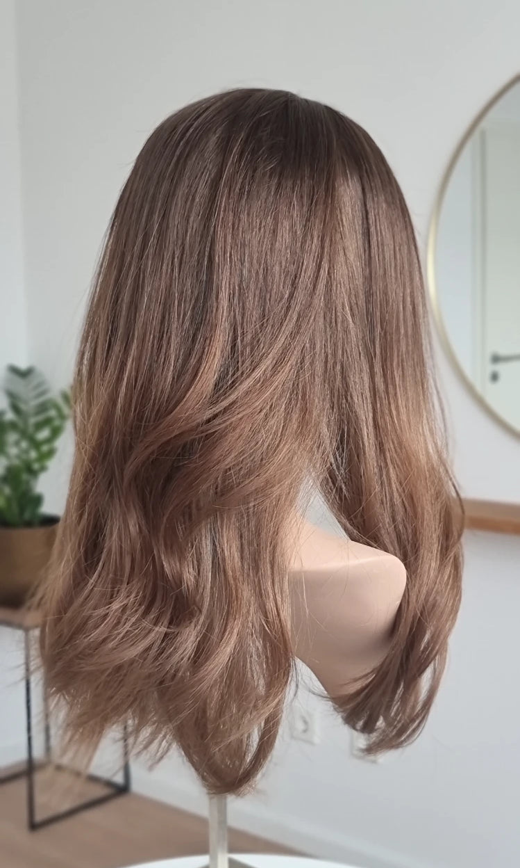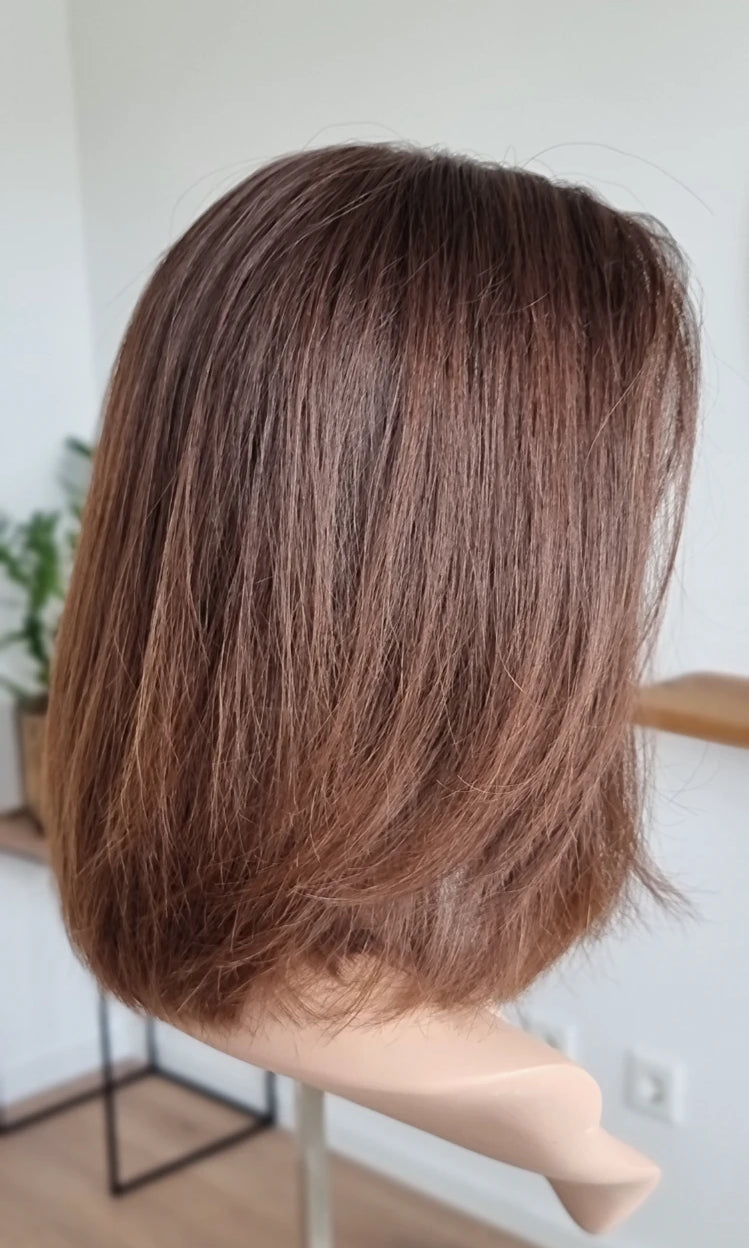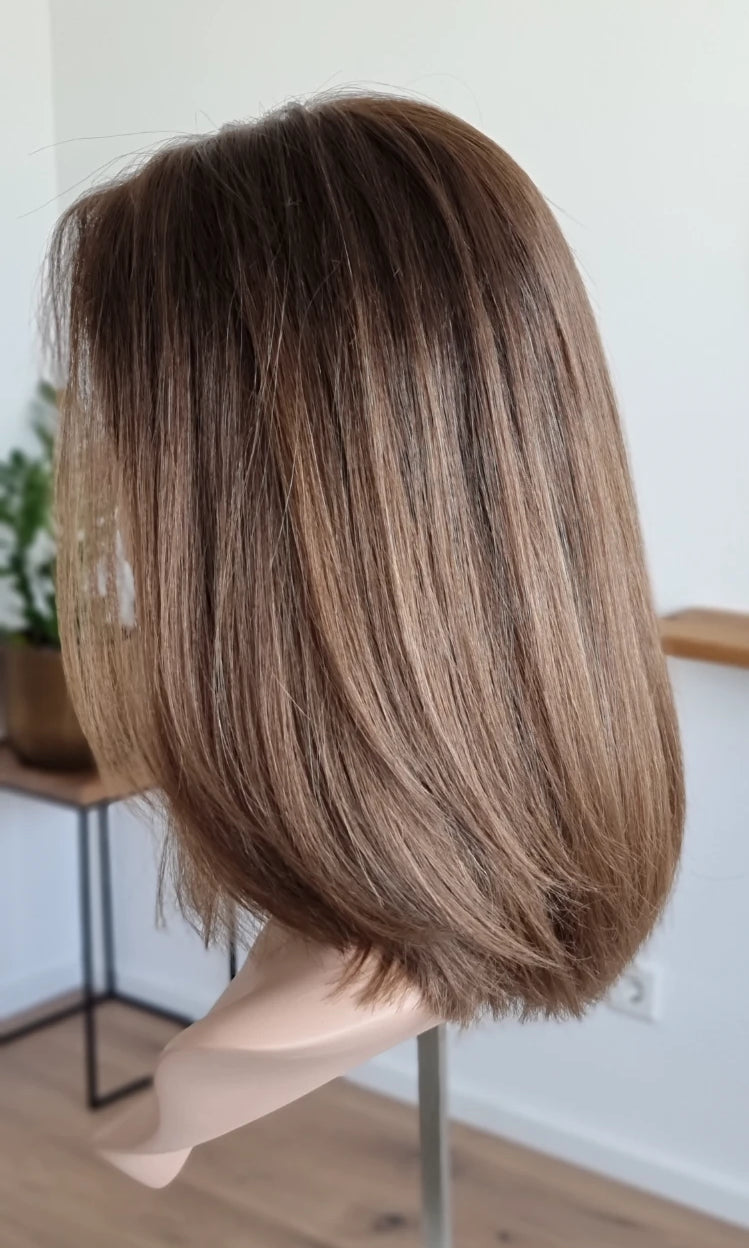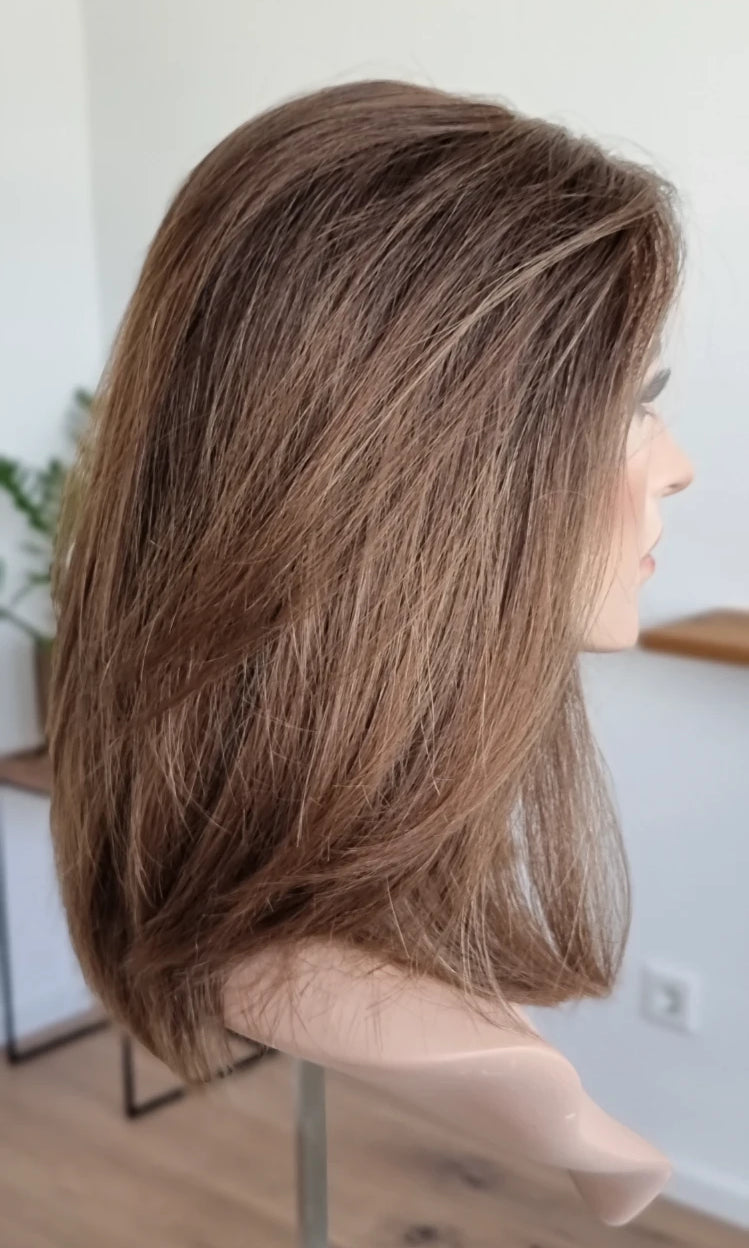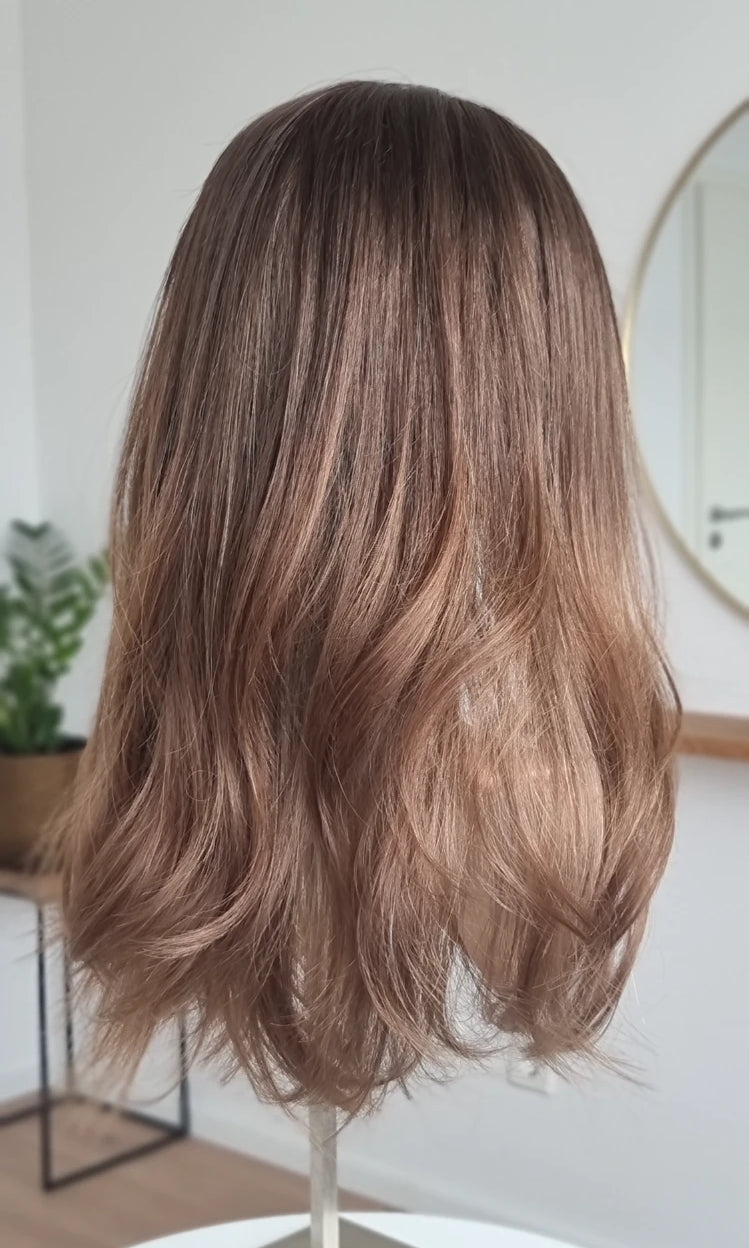 Eine Perücke bedeckt den gesamten Kopf und besteht aus verschiedenen Verarbeitungstechnicken, die gemeinsam für ein natürliches Aussehen sorgen.
