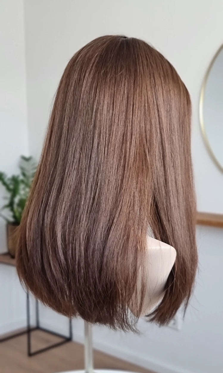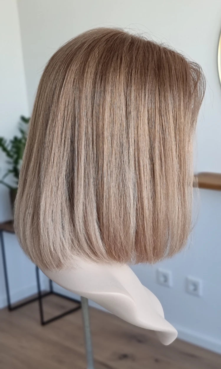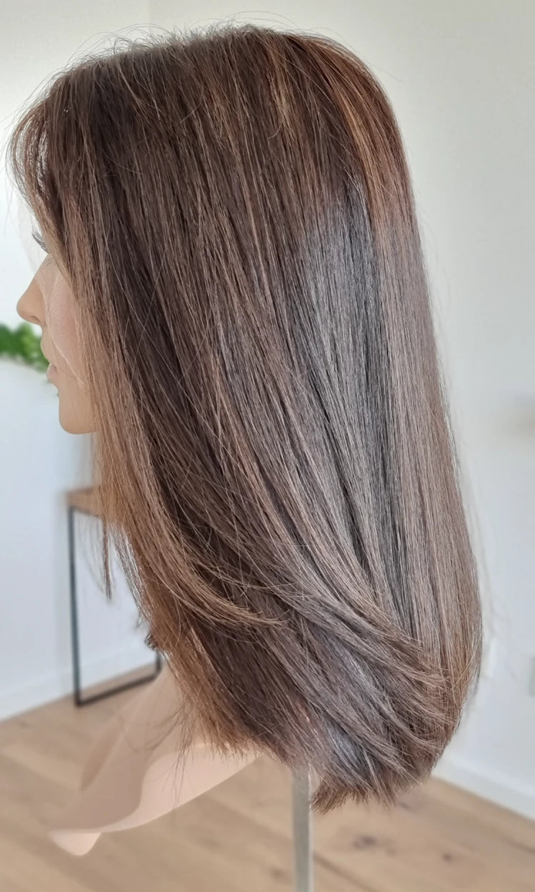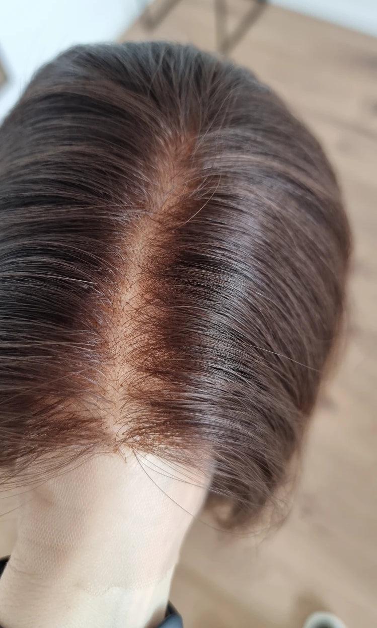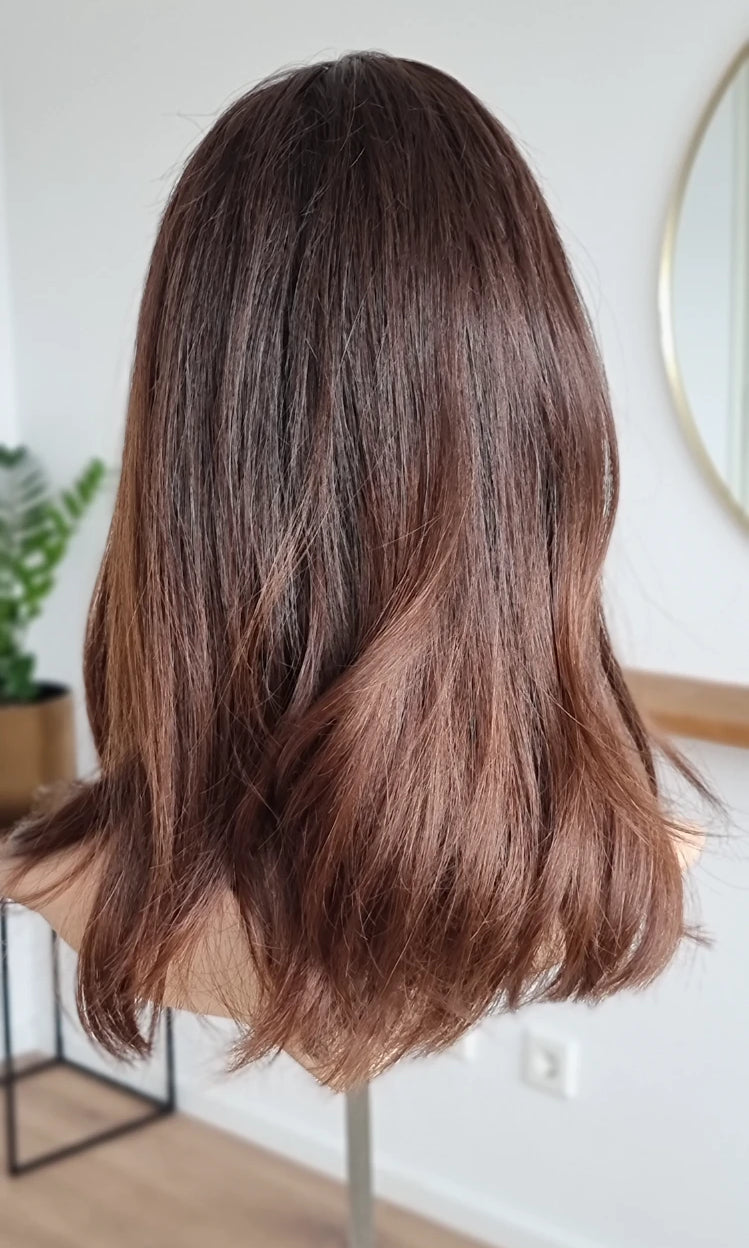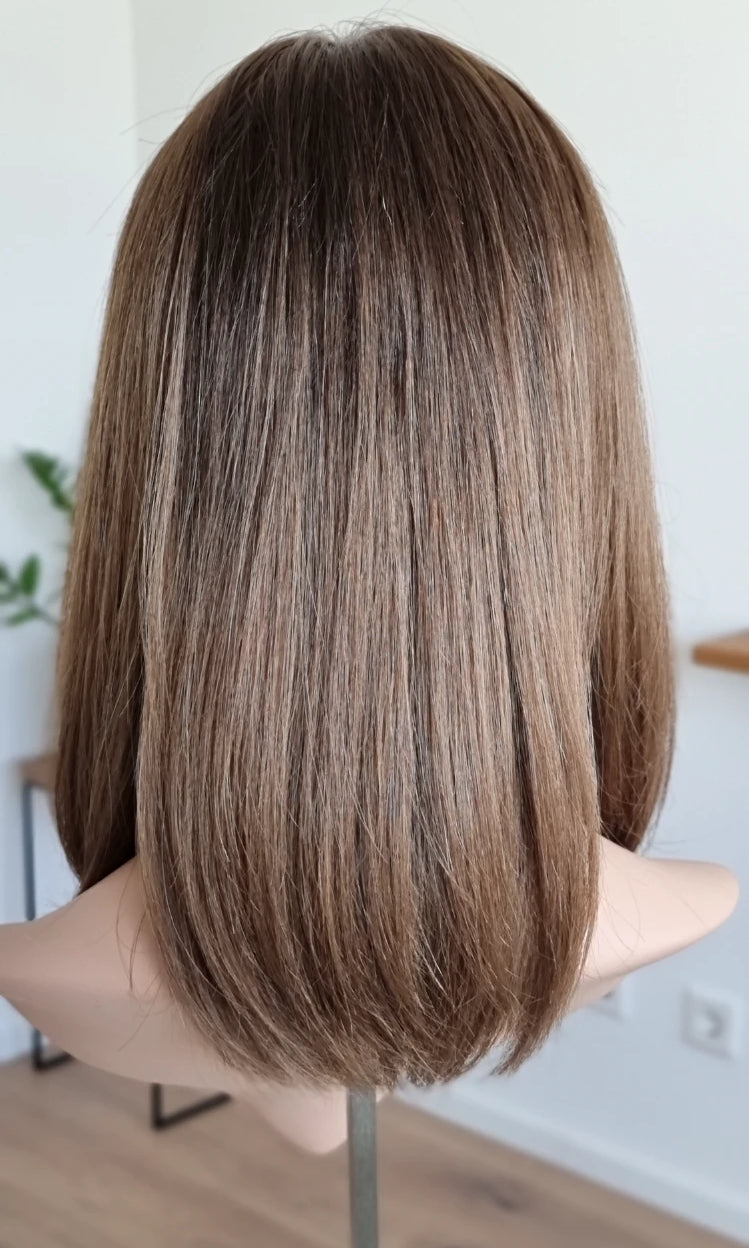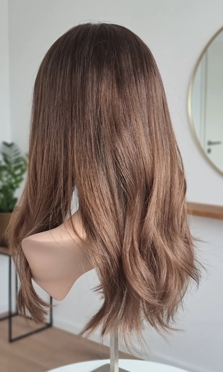Eine Perücke bedeckt den gesamten Kopf und besteht aus verschiedenen Verarbeitungstechnicken, die gemeinsam für ein natürliches Aussehen sorgen.
