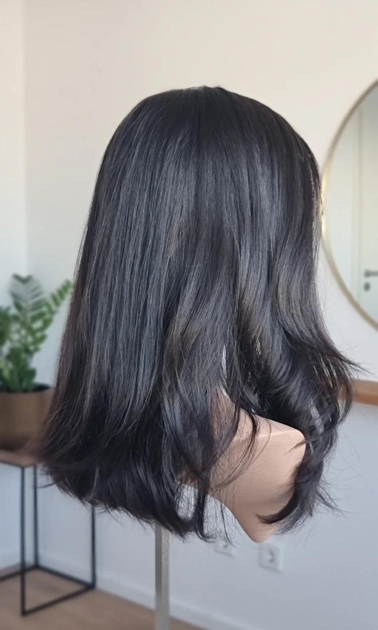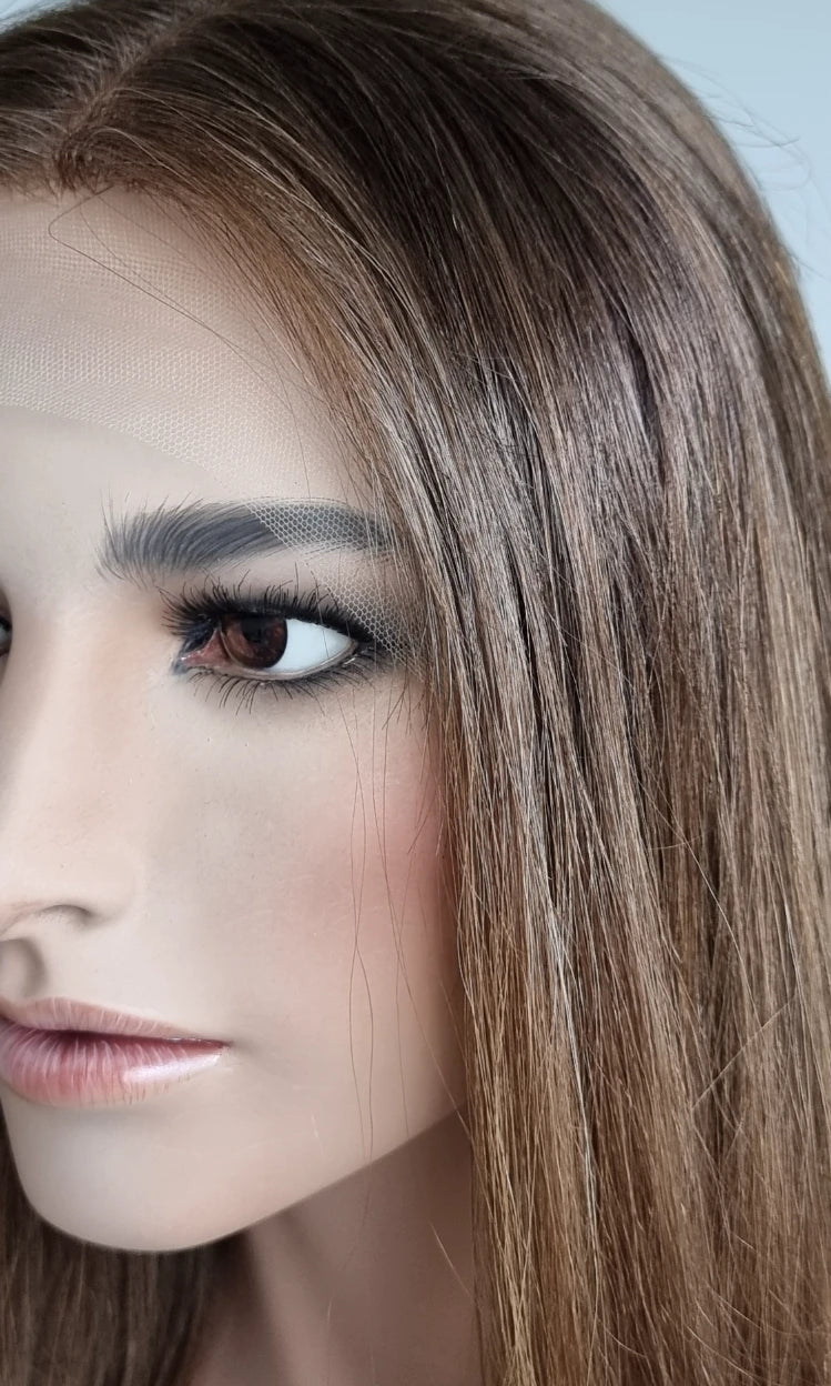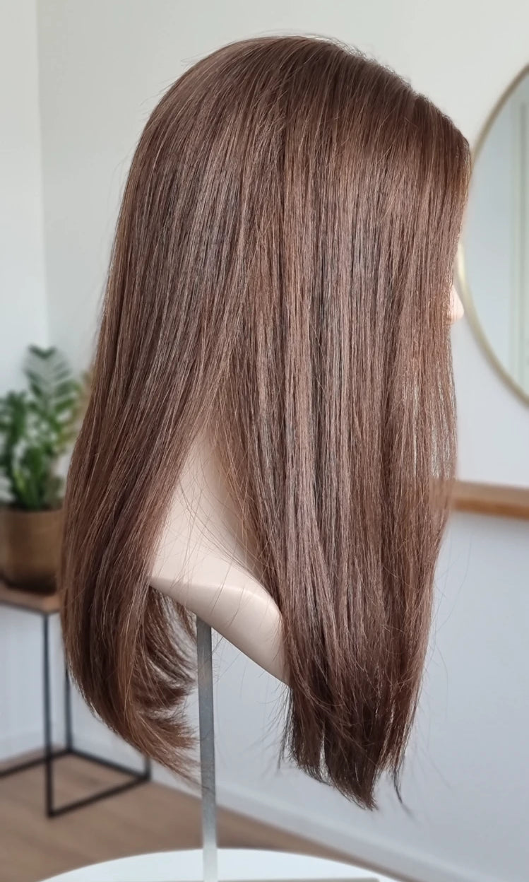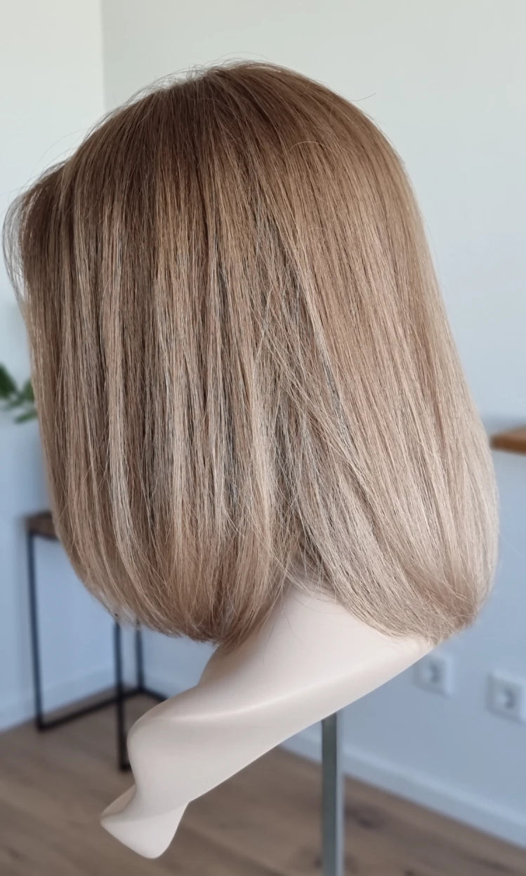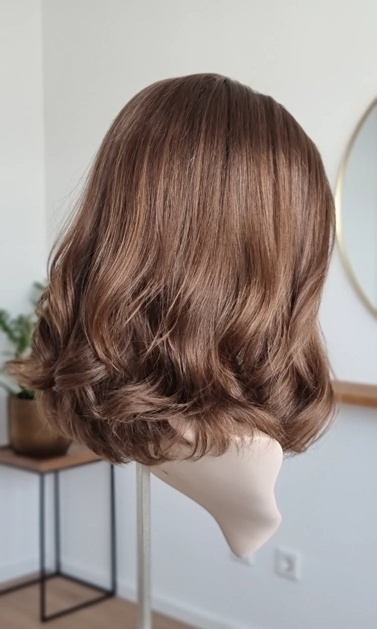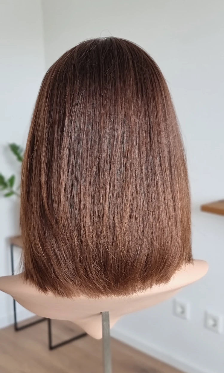 Eine Perücke bedeckt den gesamten Kopf und besteht aus verschiedenen Verarbeitungstechnicken, die gemeinsam für ein natürliches Aussehen sorgen.