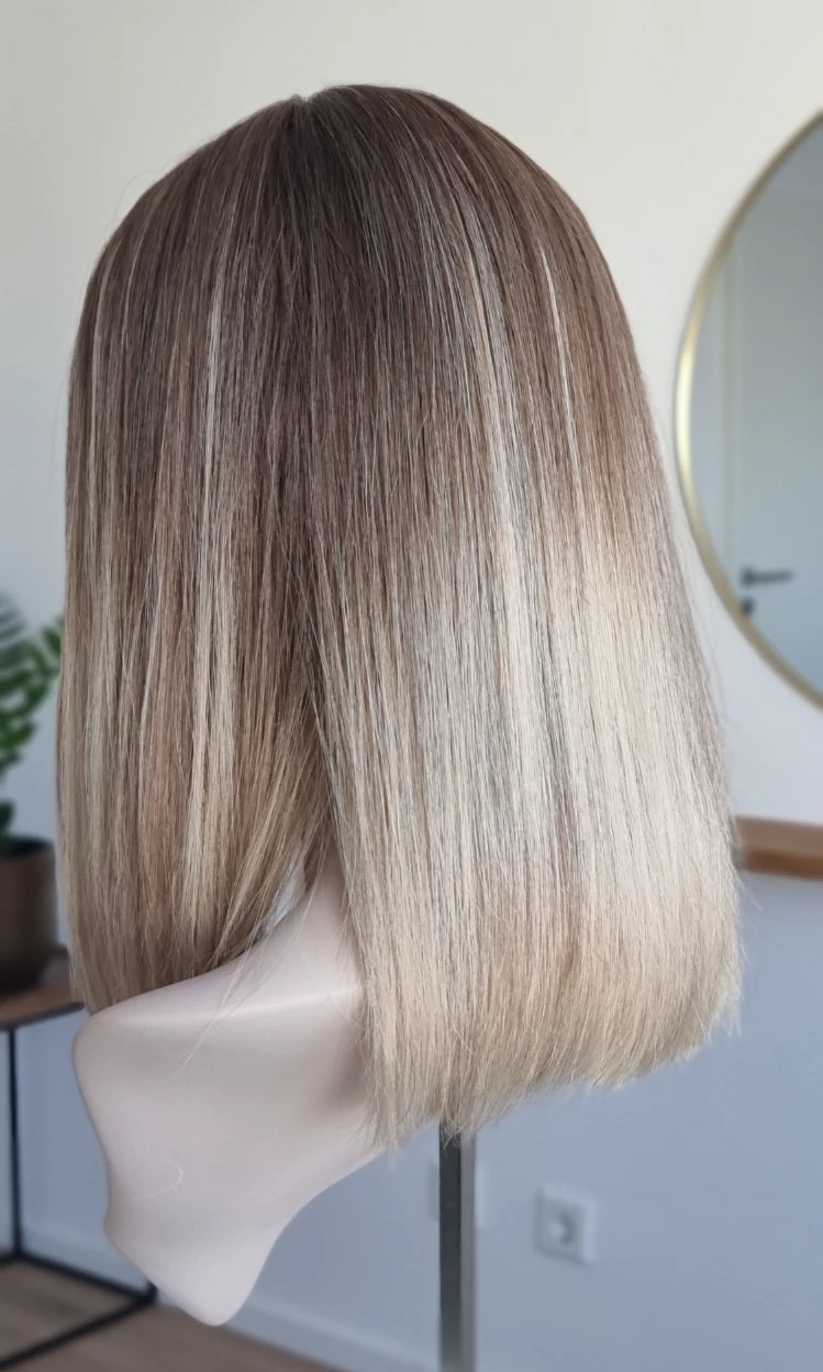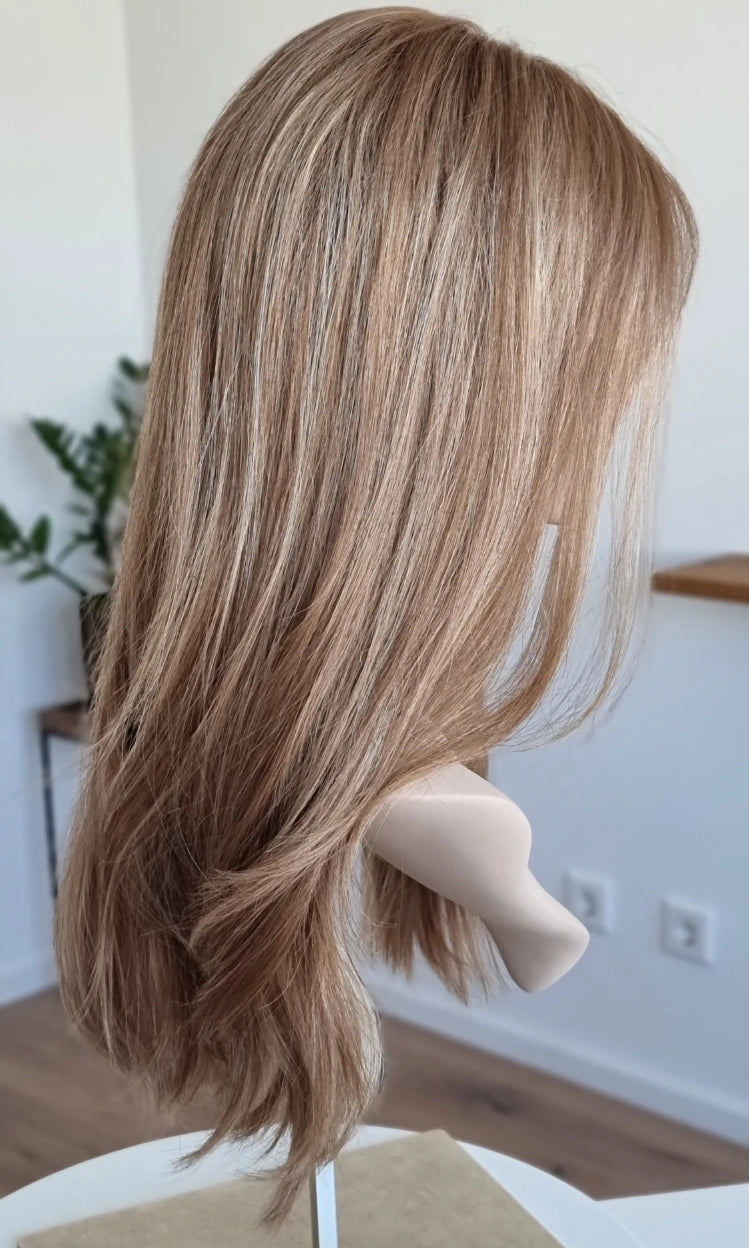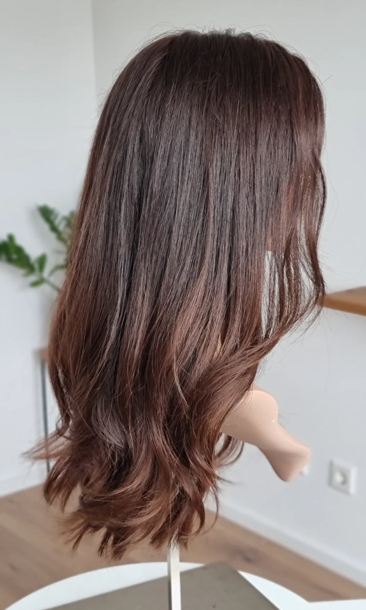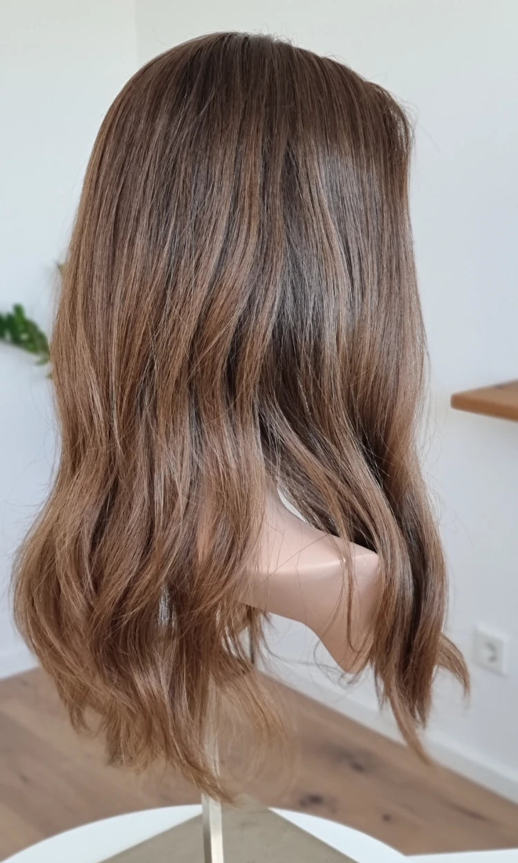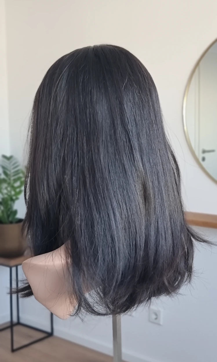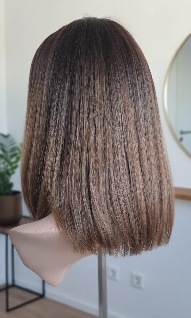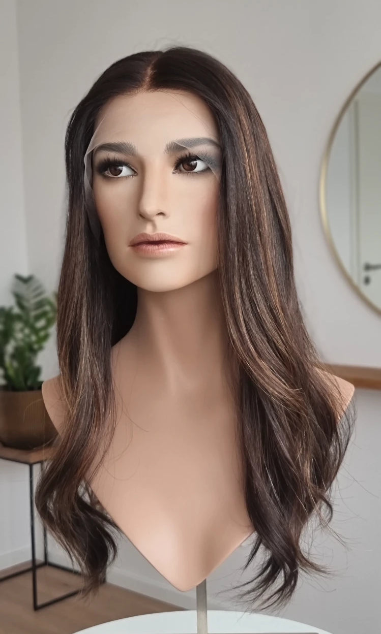 Eine Perücke bedeckt den gesamten Kopf und besteht aus verschiedenen Verarbeitungstechnicken, die gemeinsam für ein natürliches Aussehen sorgen.
