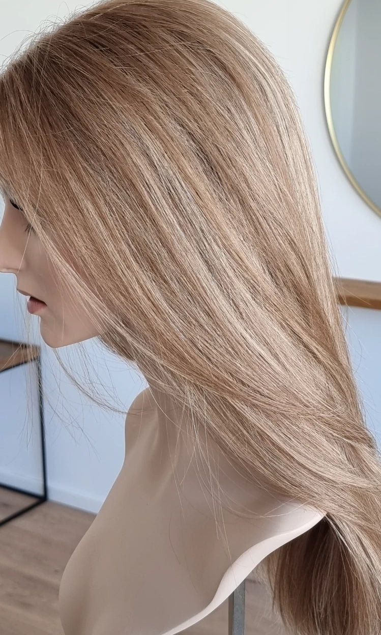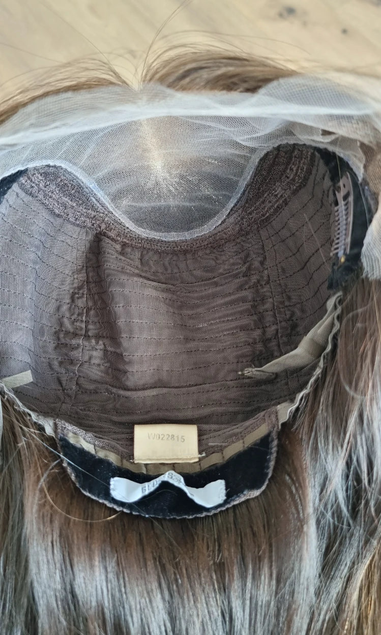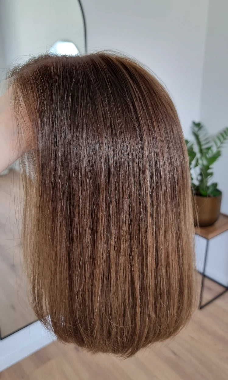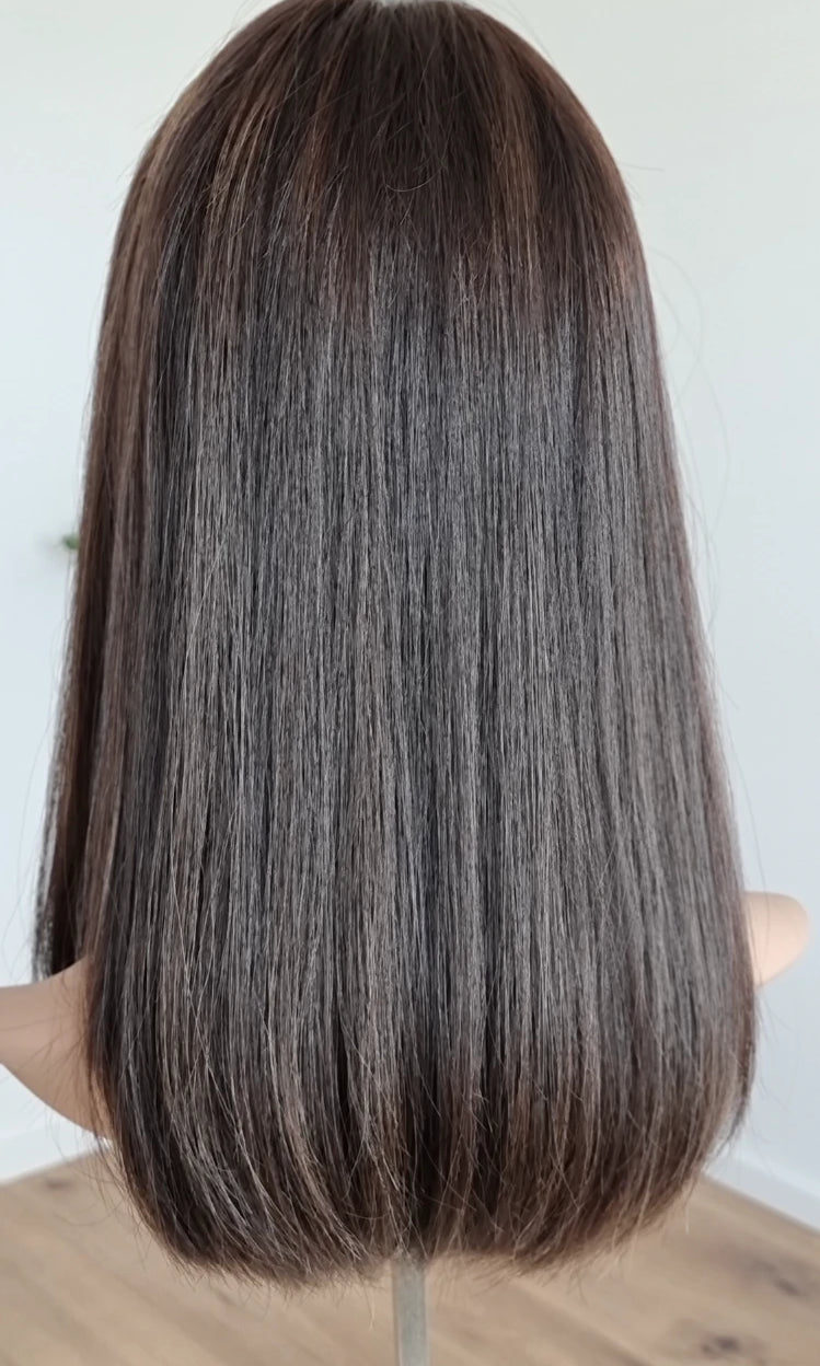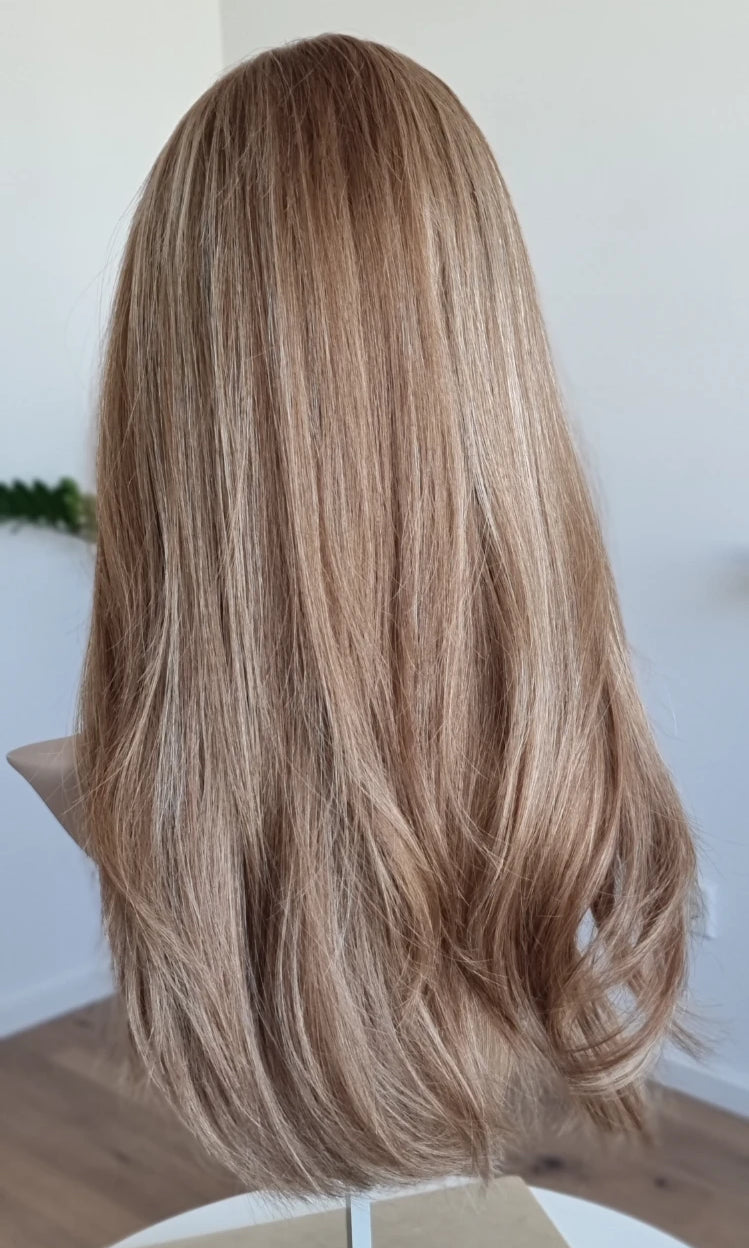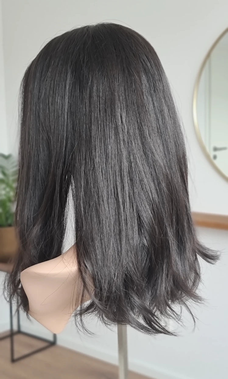 Eine Perücke bedeckt den gesamten Kopf und besteht aus verschiedenen Verarbeitungstechnicken, die gemeinsam für ein natürliches Aussehen sorgen.