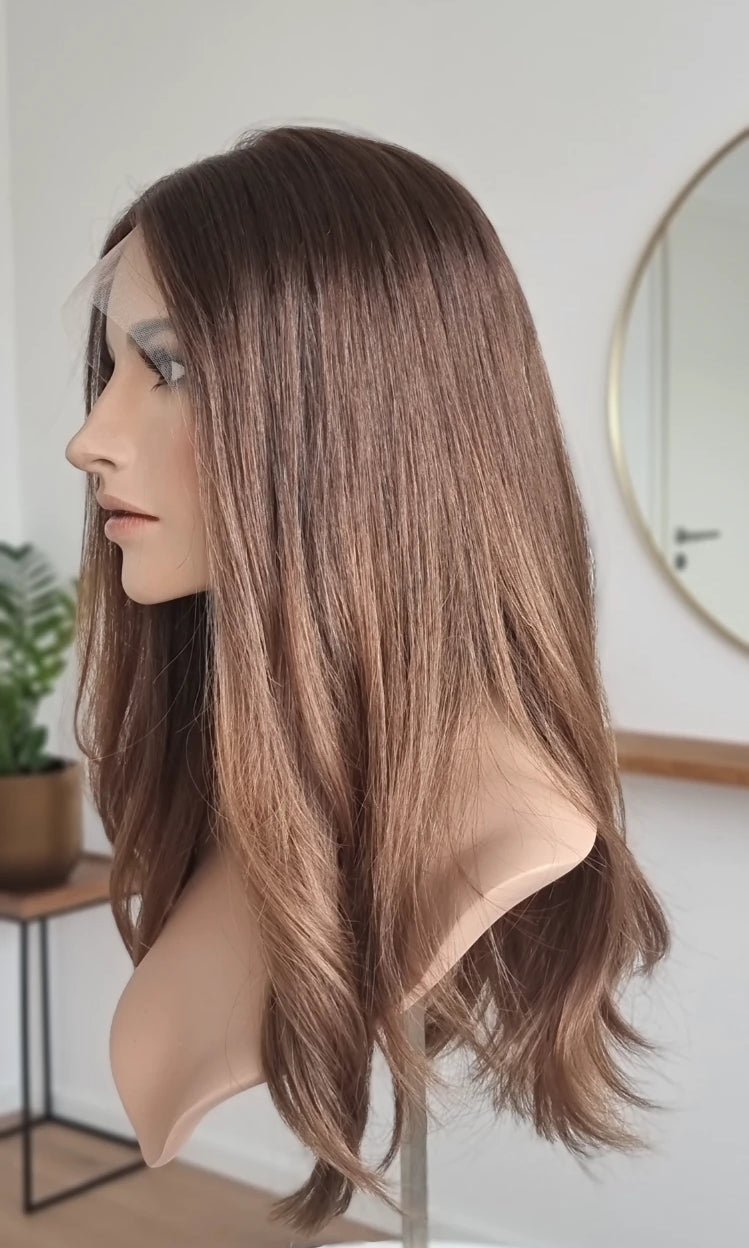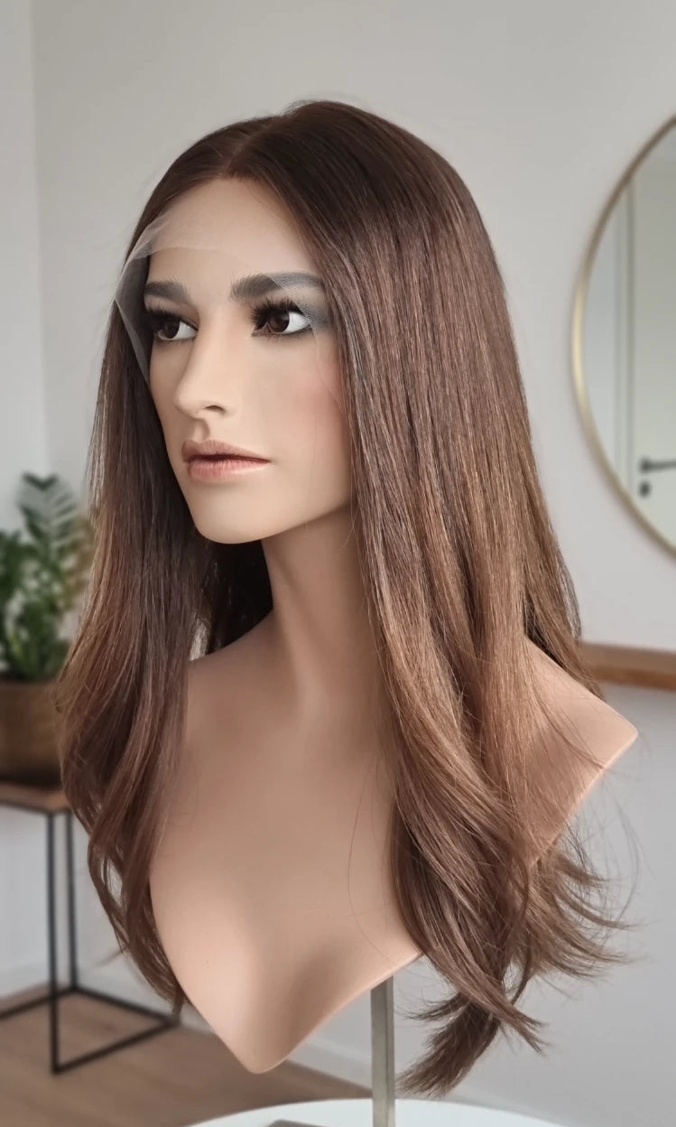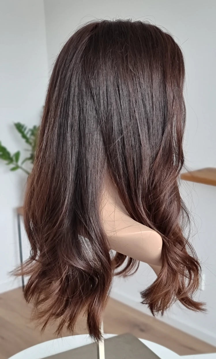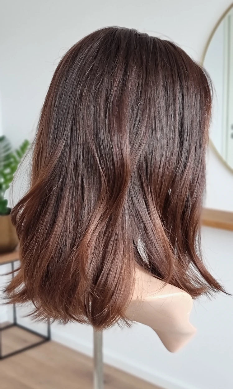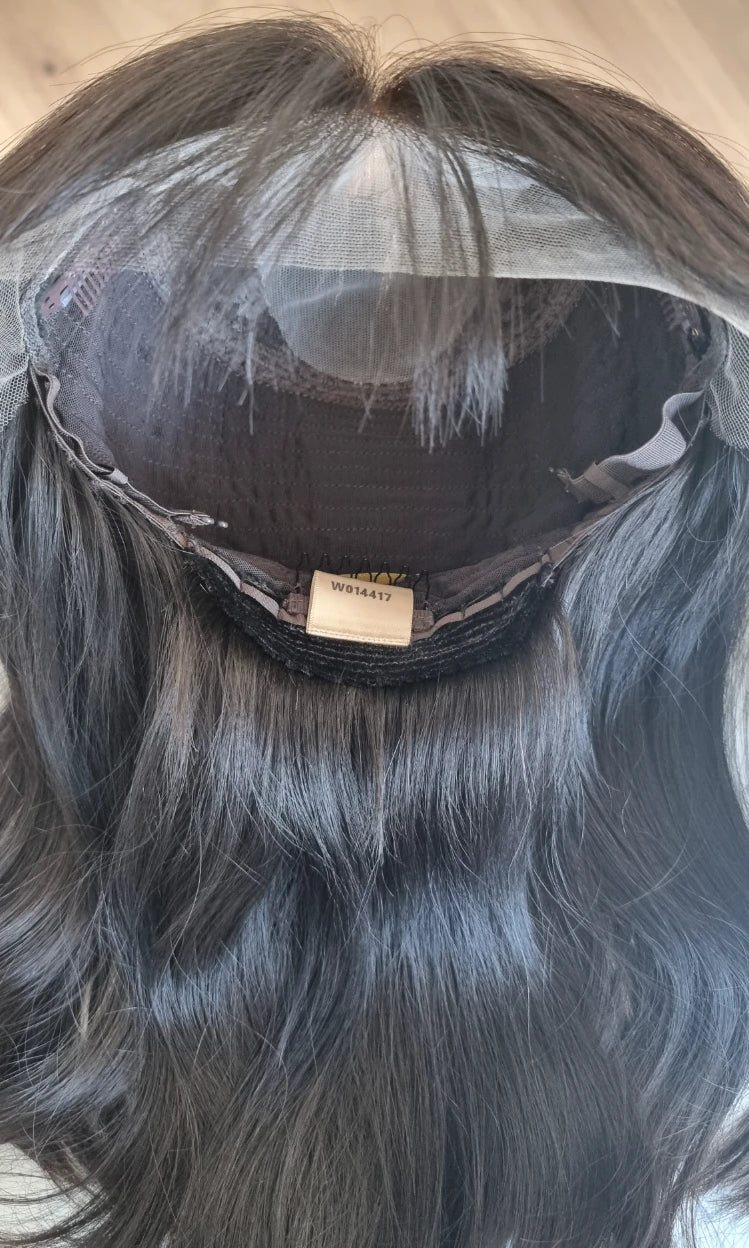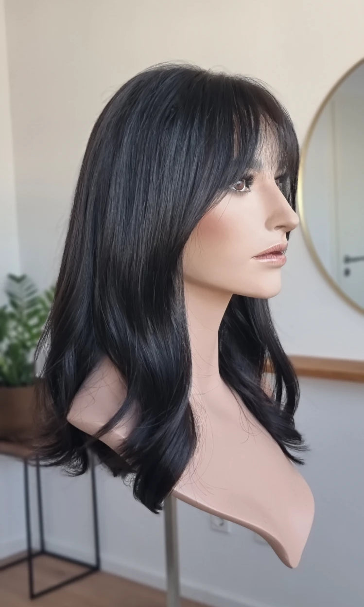 Eine Perücke bedeckt den gesamten Kopf und besteht aus verschiedenen Verarbeitungstechnicken, die gemeinsam für ein natürliches Aussehen sorgen.