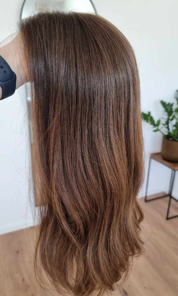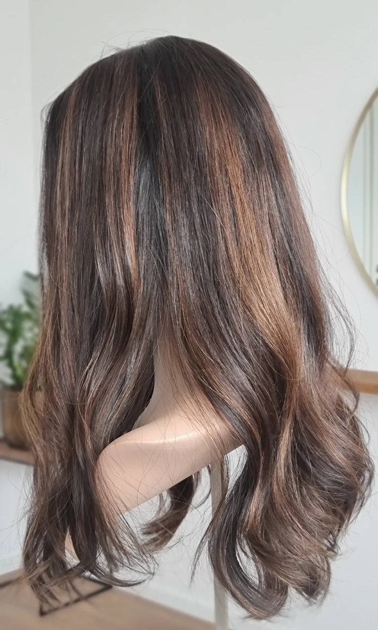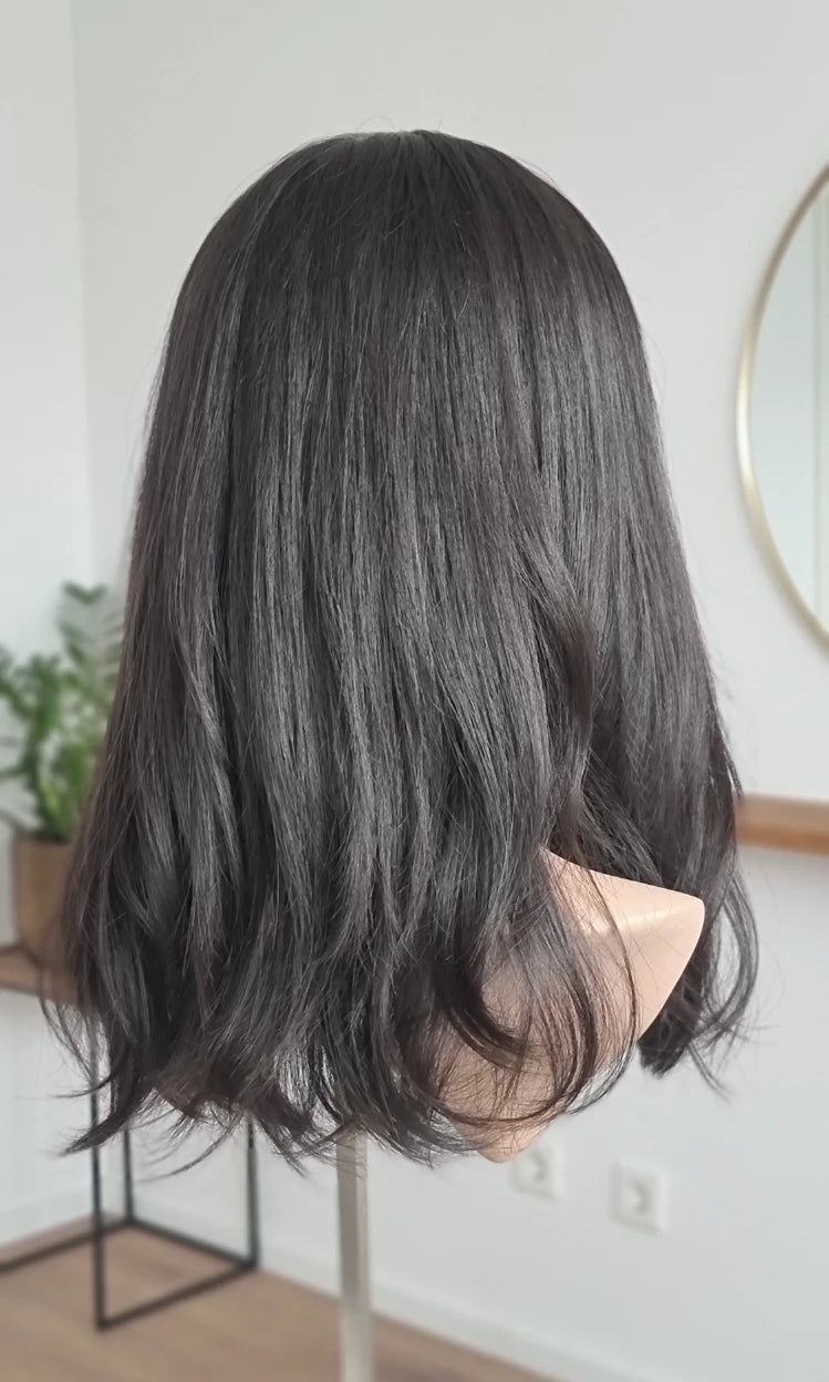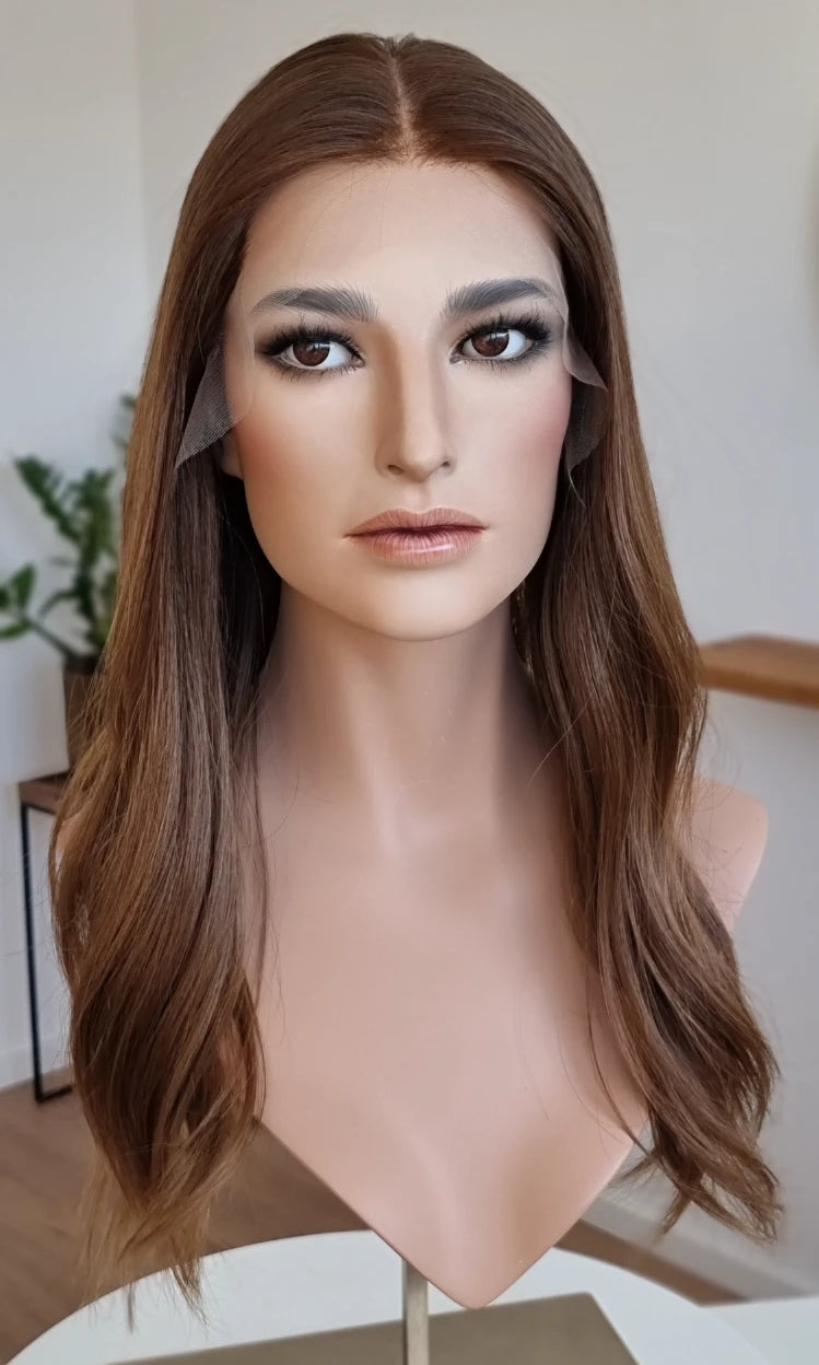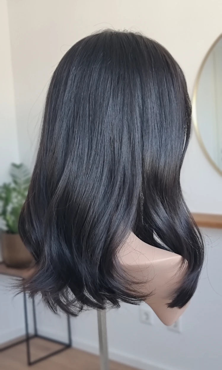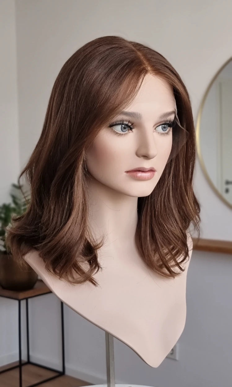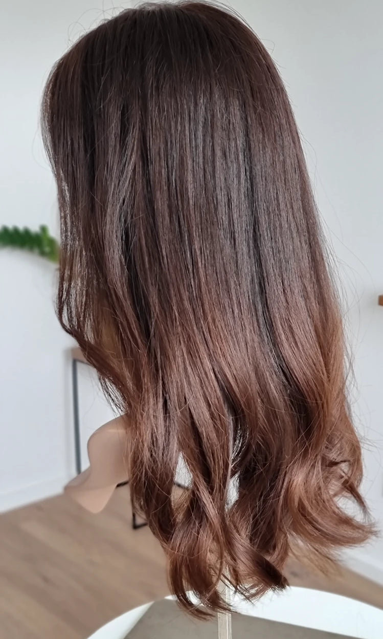 Eine Perücke bedeckt den gesamten Kopf und besteht aus verschiedenen Verarbeitungstechnicken, die gemeinsam für ein natürliches Aussehen sorgen.