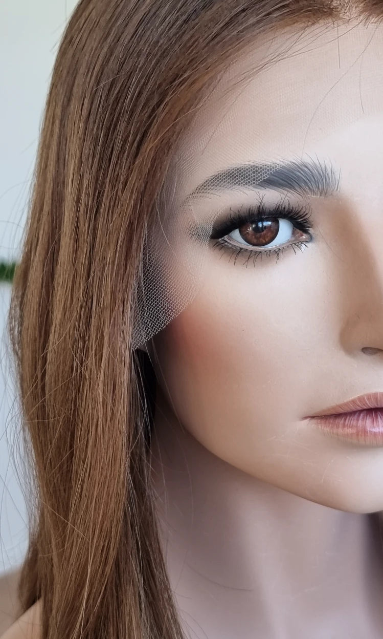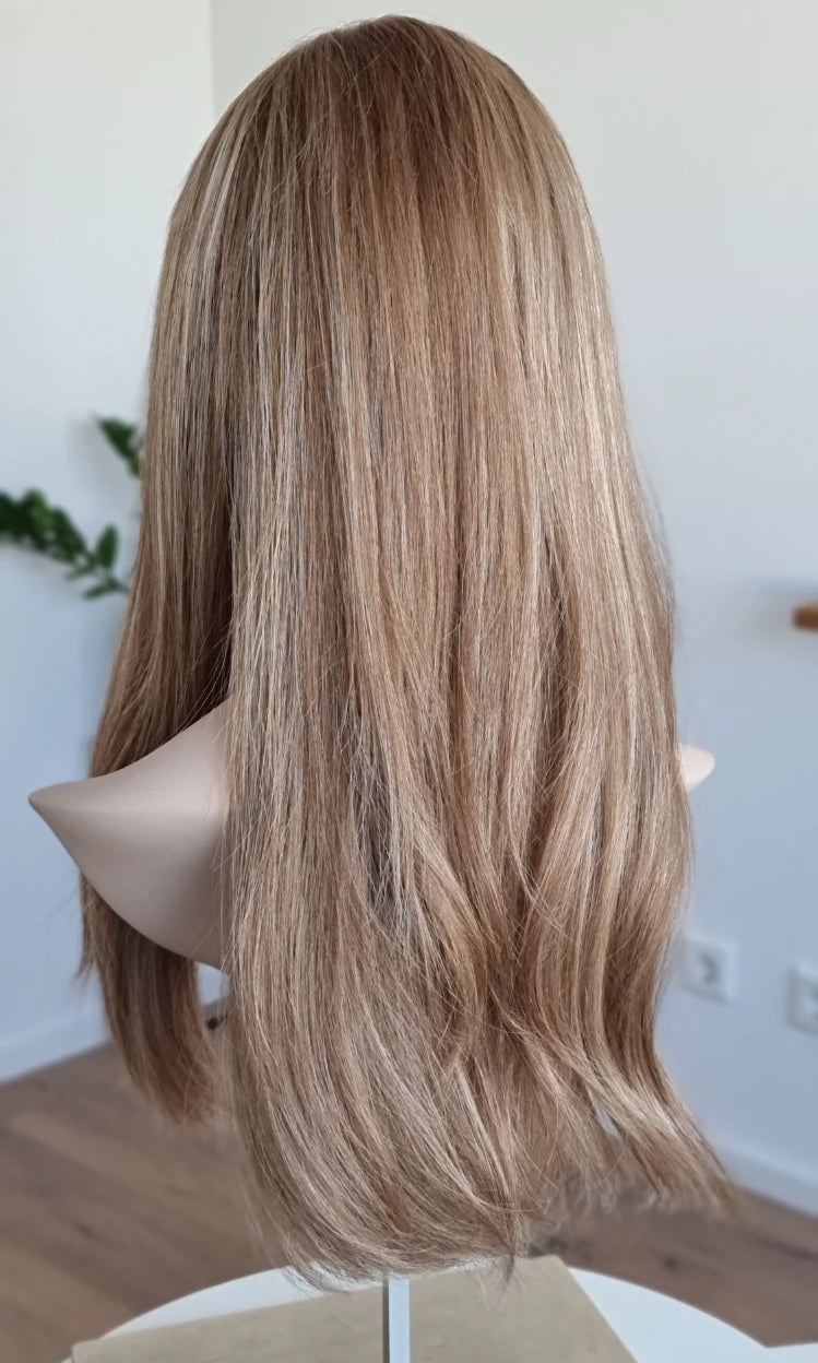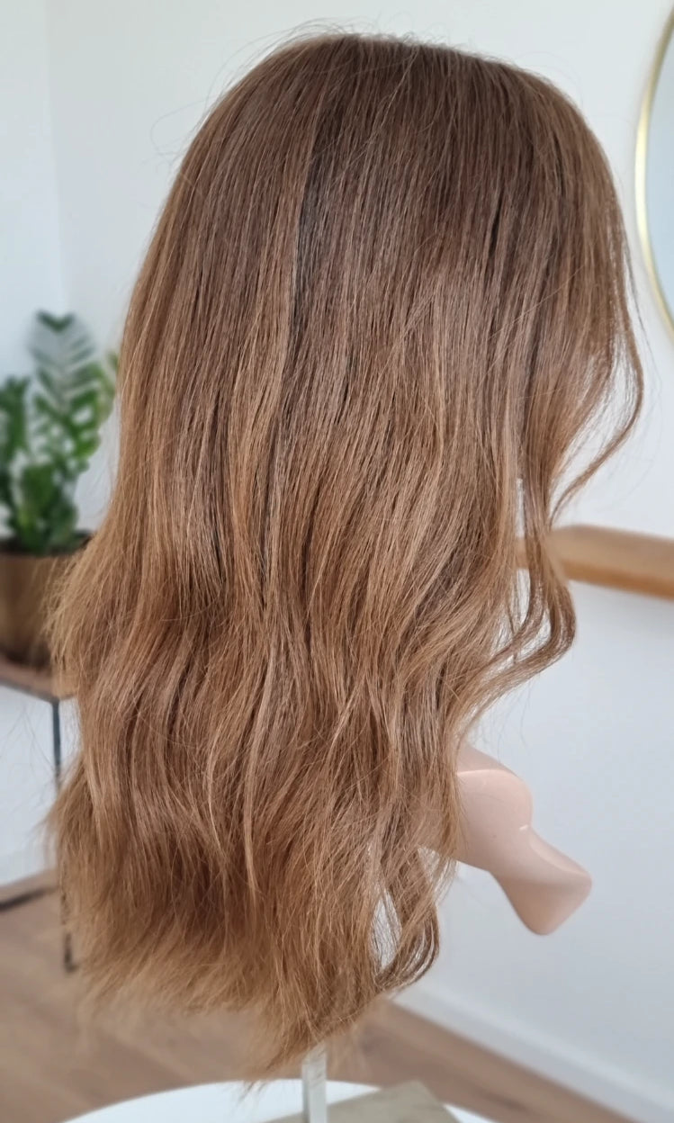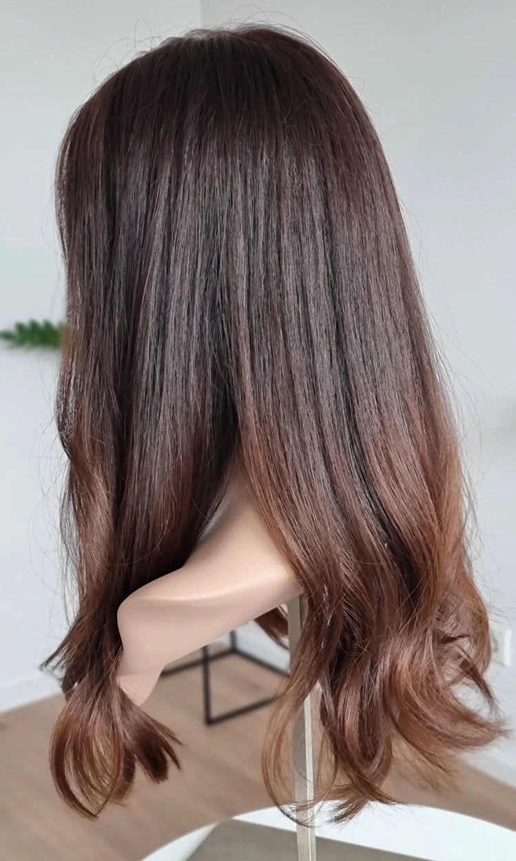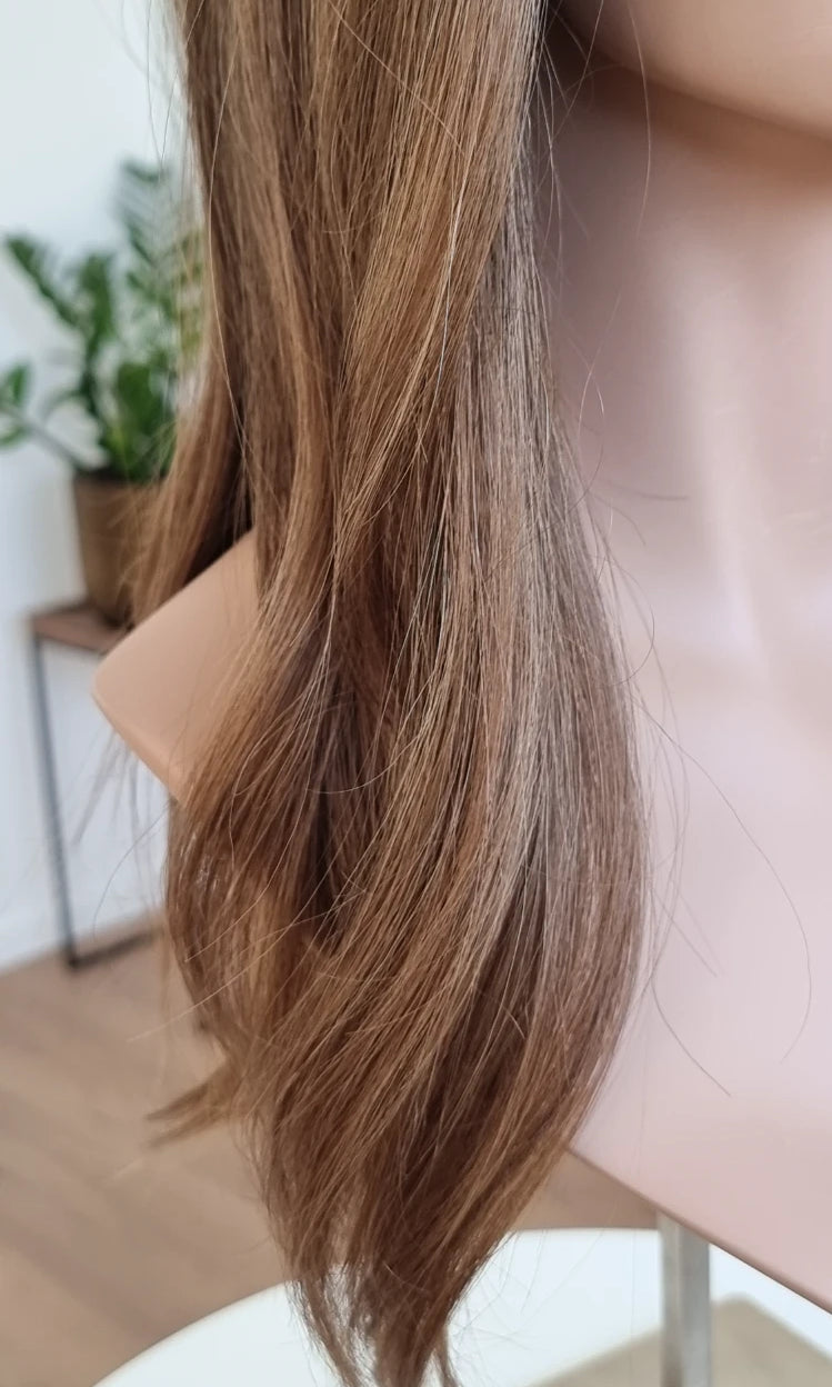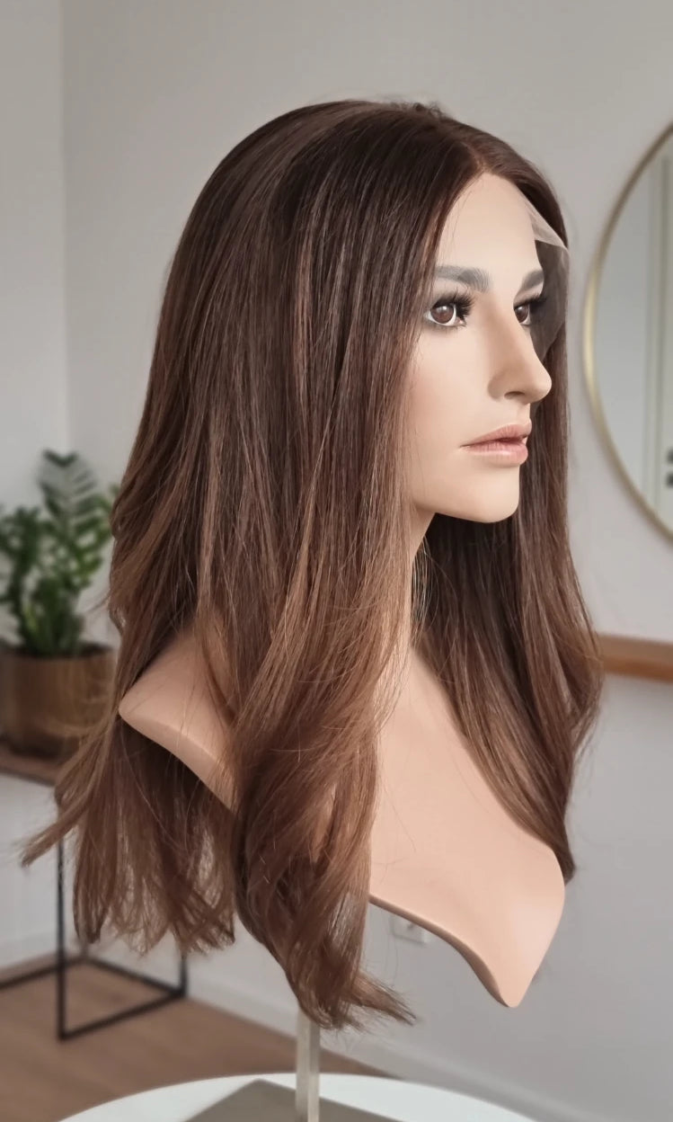 Eine Perücke bedeckt den gesamten Kopf und besteht aus verschiedenen Verarbeitungstechnicken, die gemeinsam für ein natürliches Aussehen sorgen.