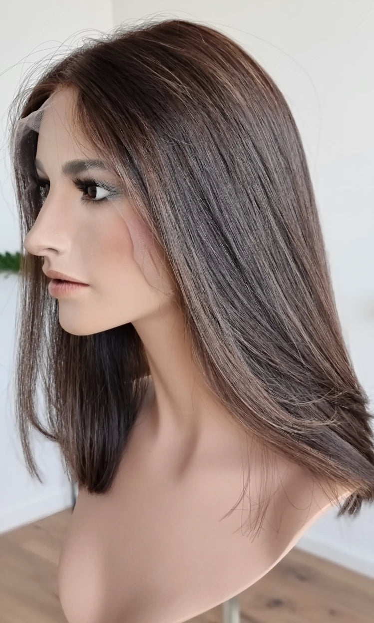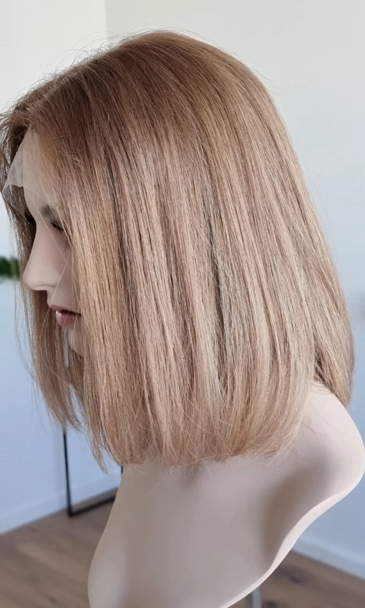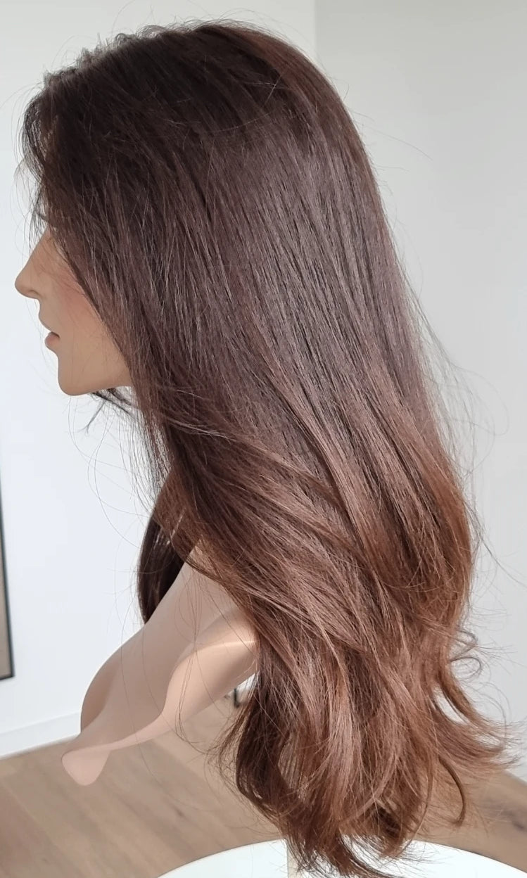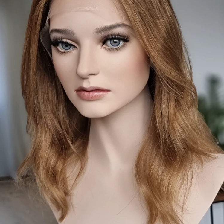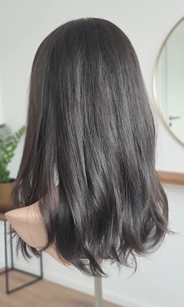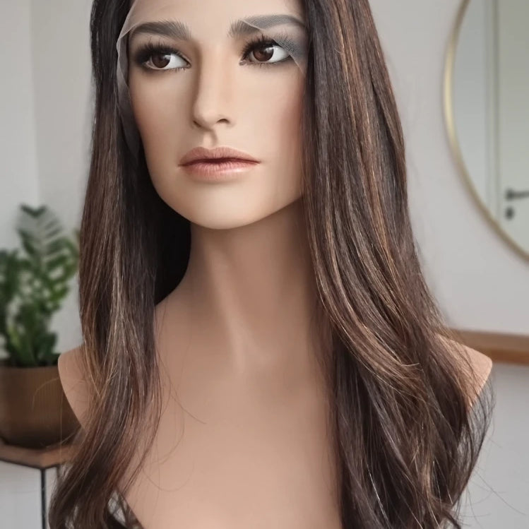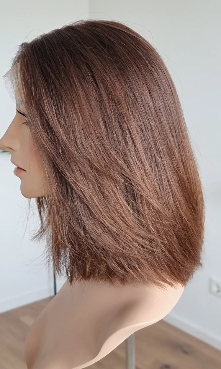 Eine Perücke bedeckt den gesamten Kopf und besteht aus verschiedenen Verarbeitungstechnicken, die gemeinsam für ein natürliches Aussehen sorgen.