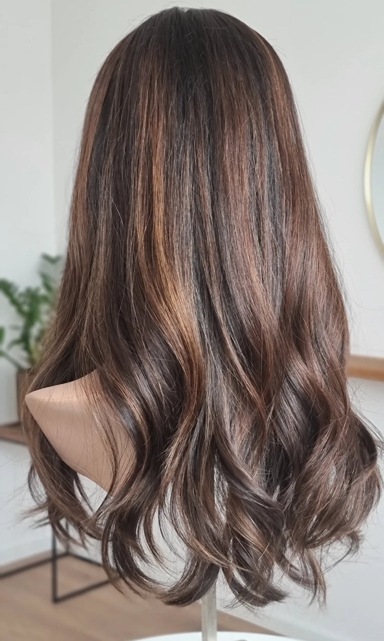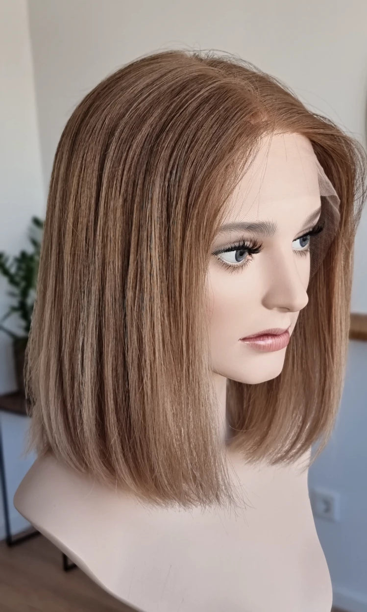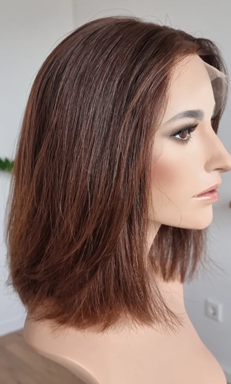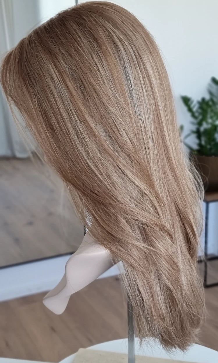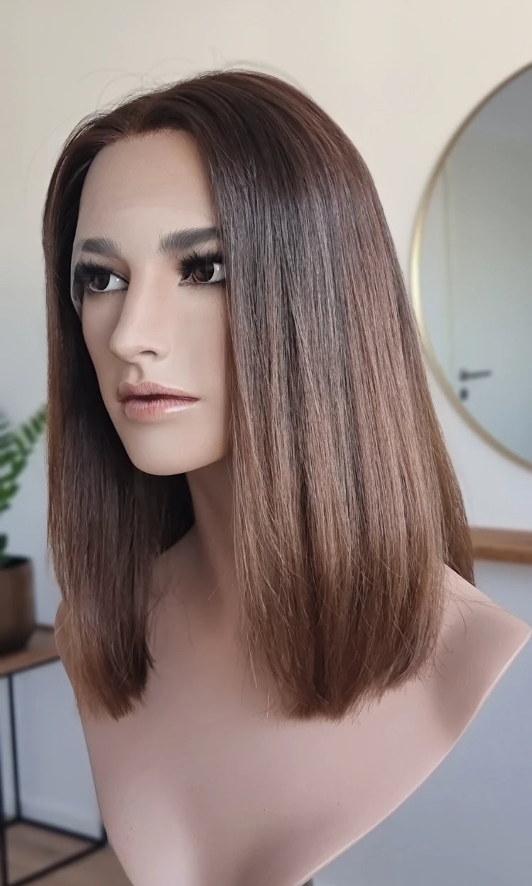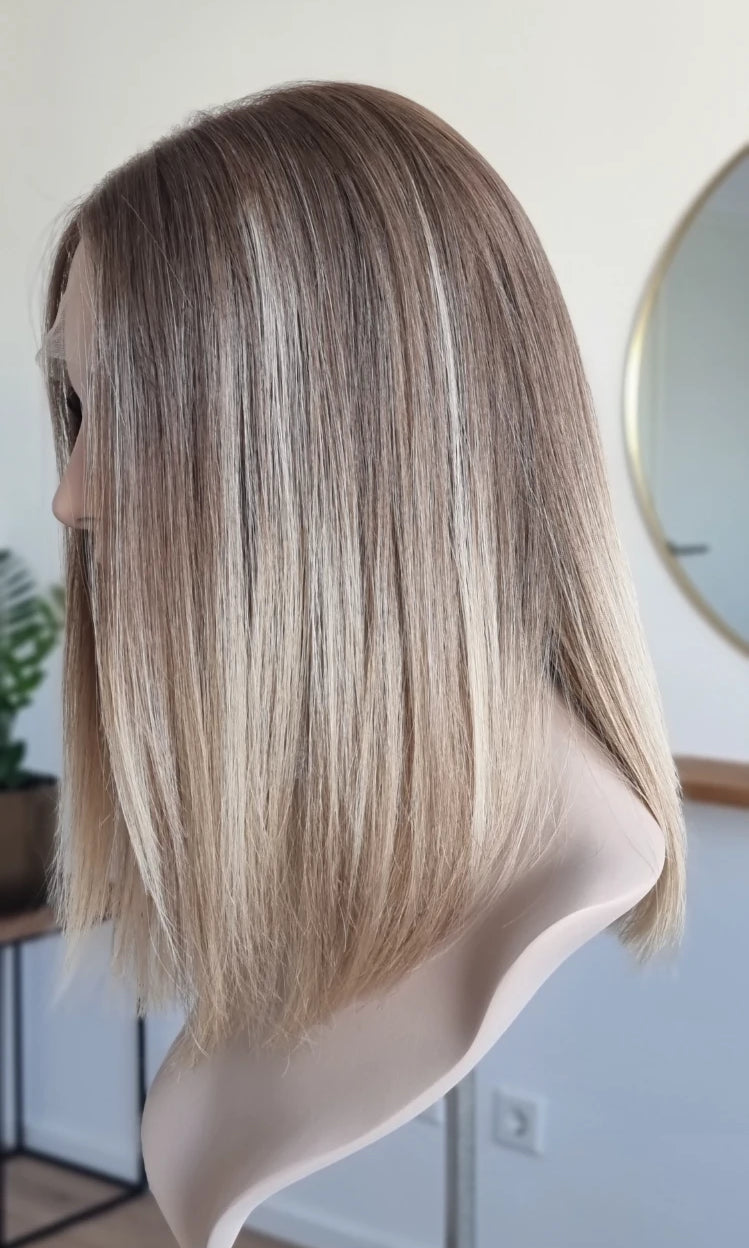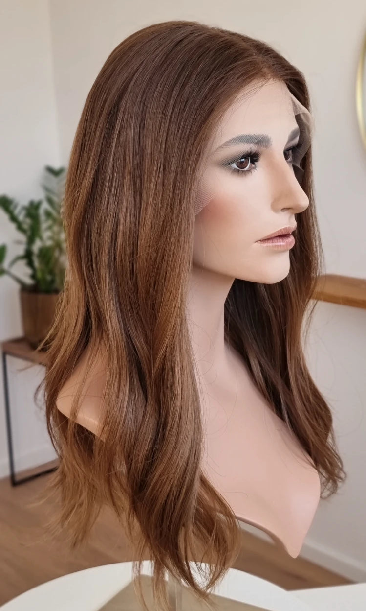 Eine Perücke bedeckt den gesamten Kopf und besteht aus verschiedenen Verarbeitungstechnicken, die gemeinsam für ein natürliches Aussehen sorgen.
