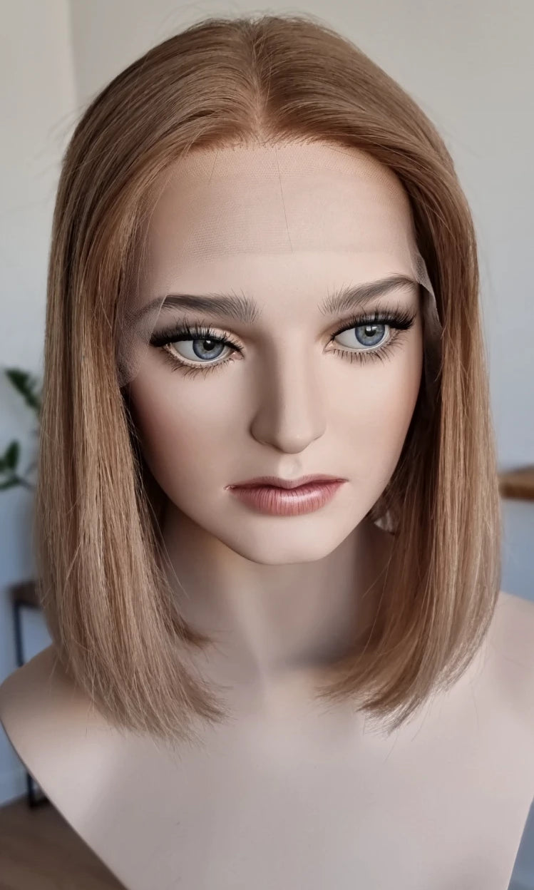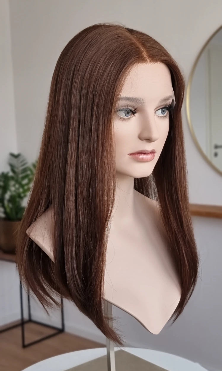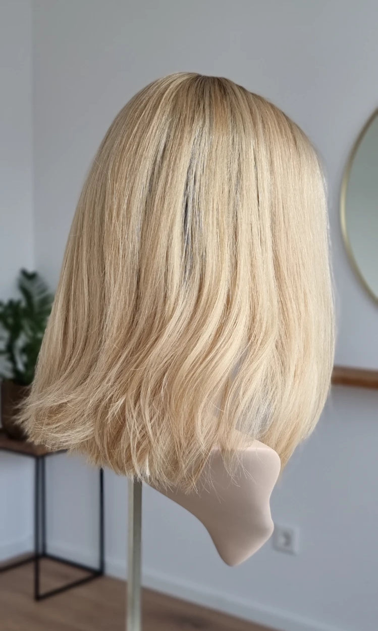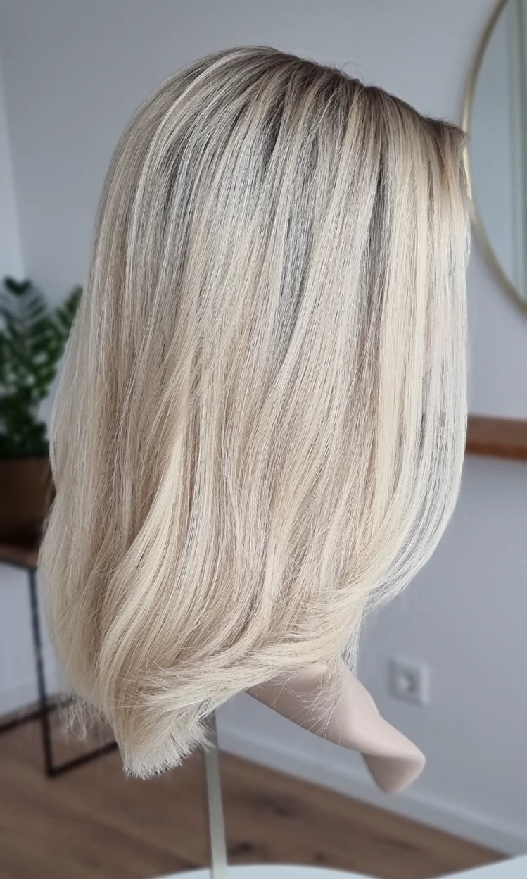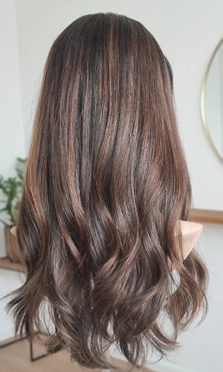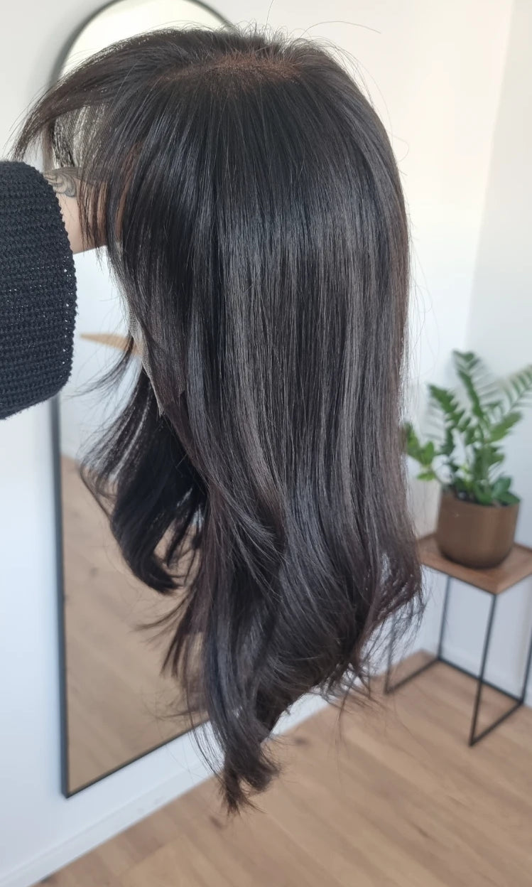 Eine Perücke bedeckt den gesamten Kopf und besteht aus verschiedenen Verarbeitungstechnicken, die gemeinsam für ein natürliches Aussehen sorgen.