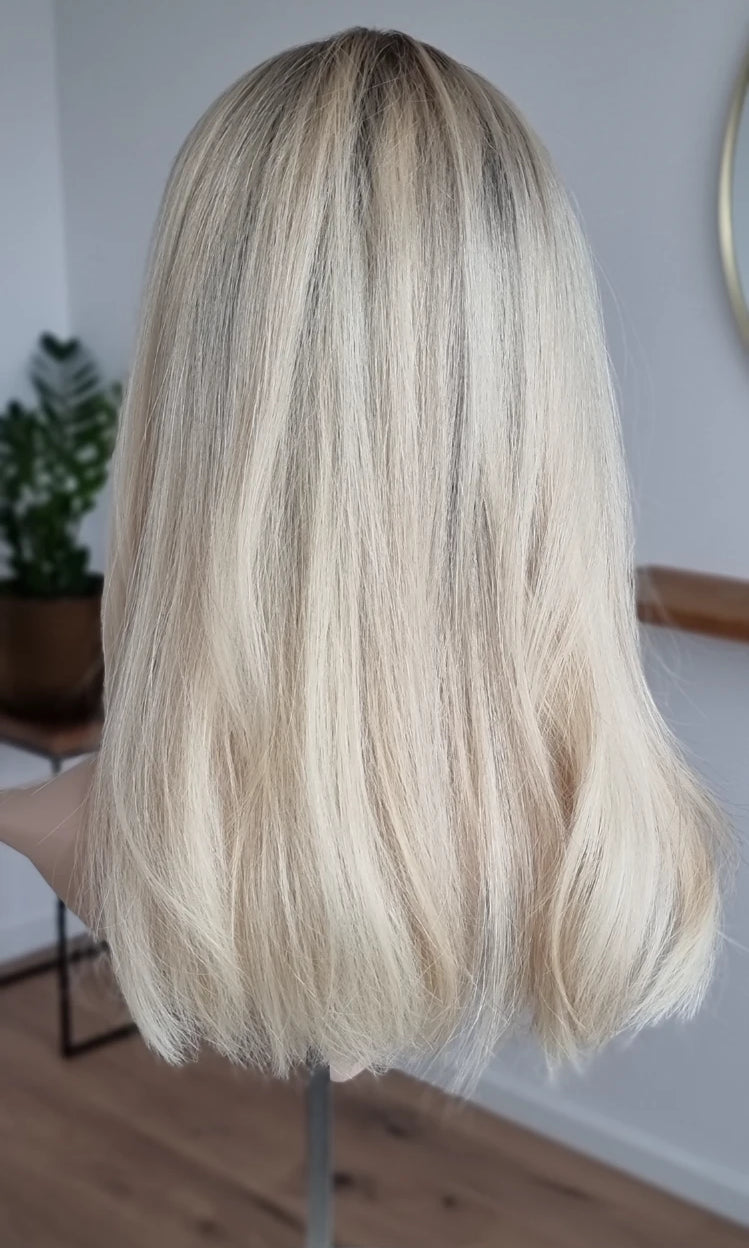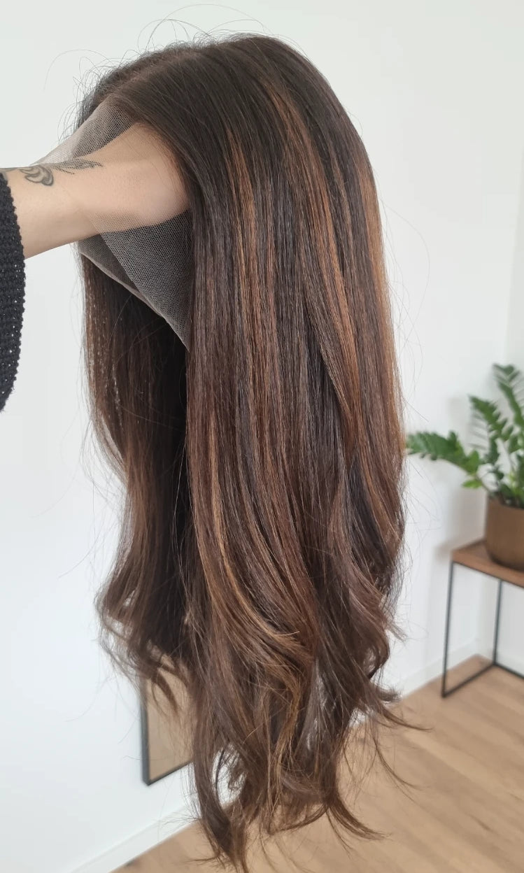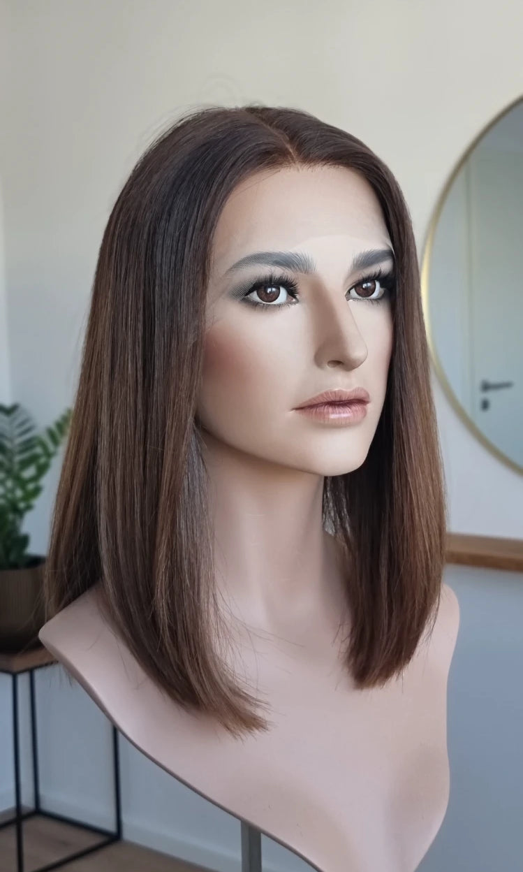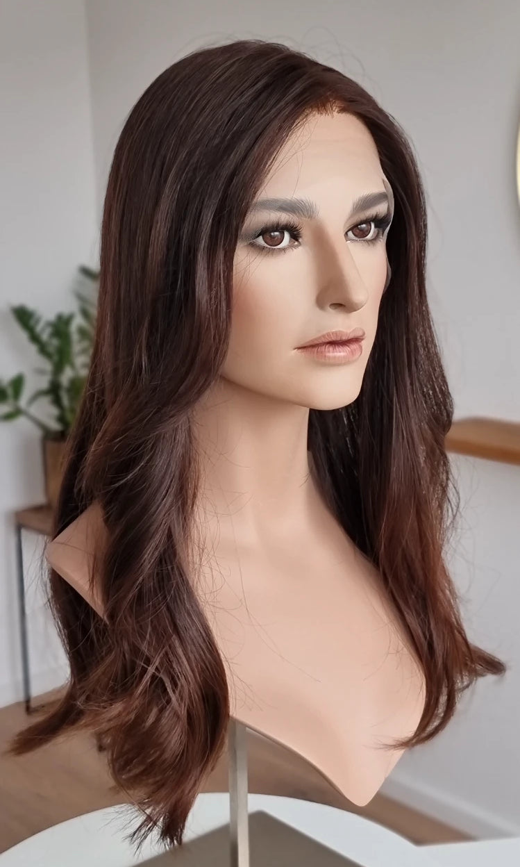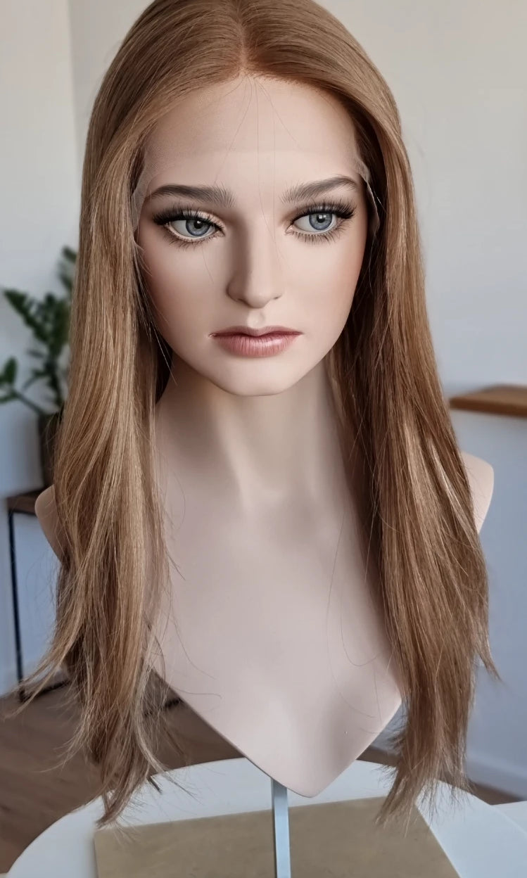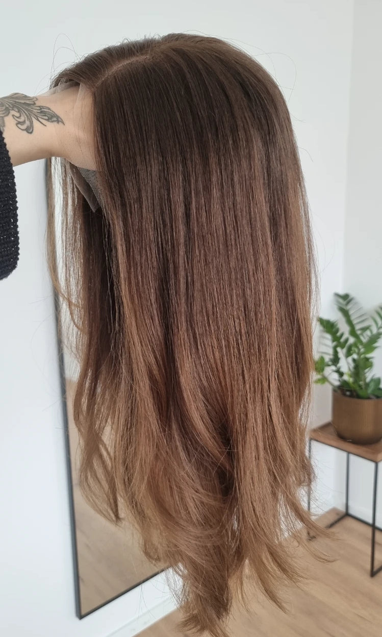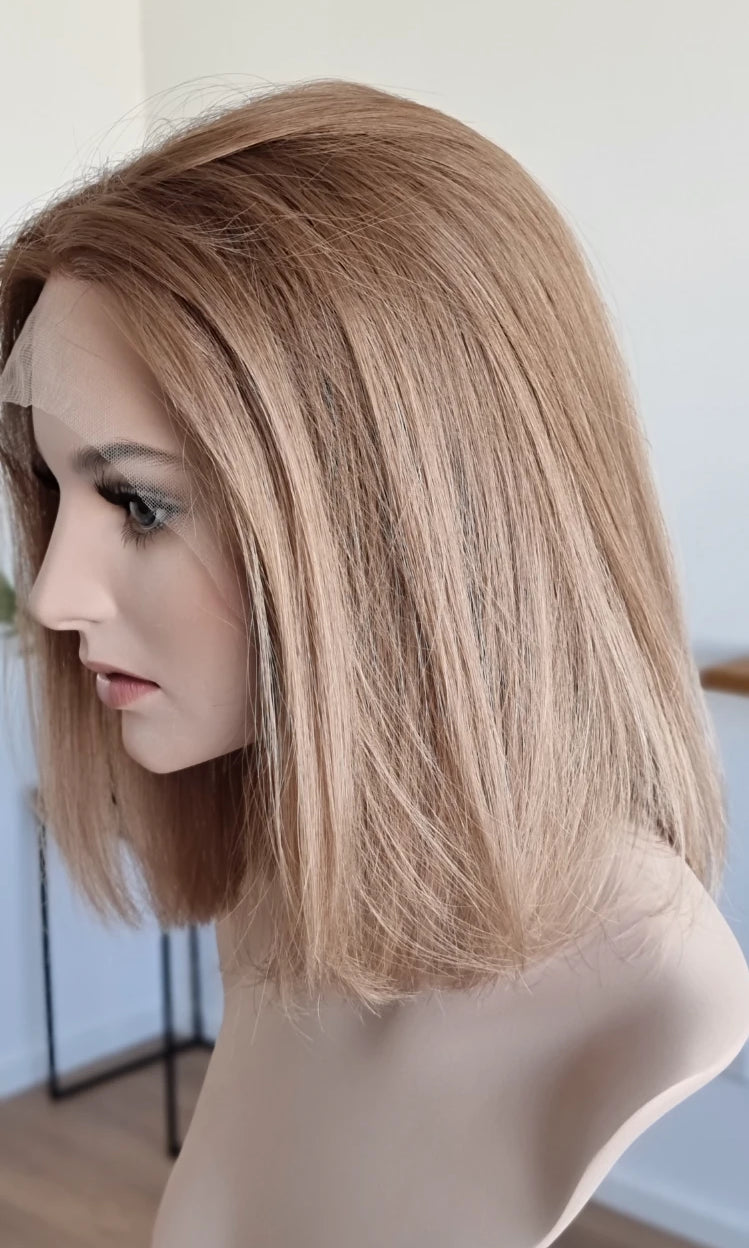 Eine Perücke bedeckt den gesamten Kopf und besteht aus verschiedenen Verarbeitungstechnicken, die gemeinsam für ein natürliches Aussehen sorgen.