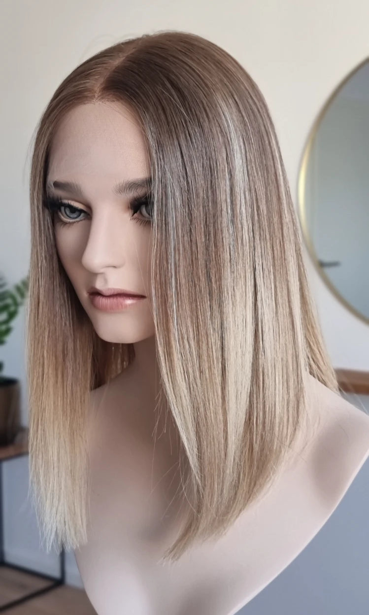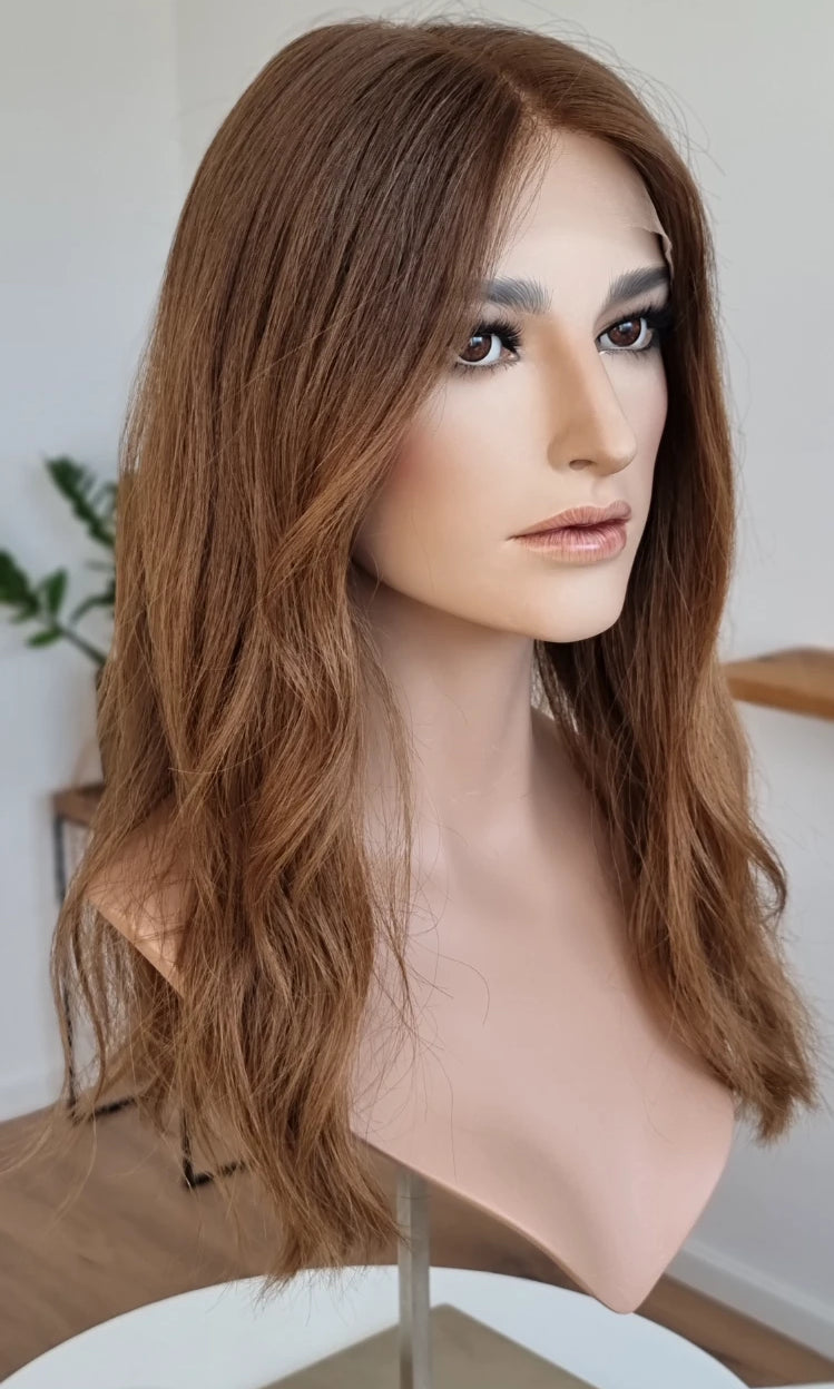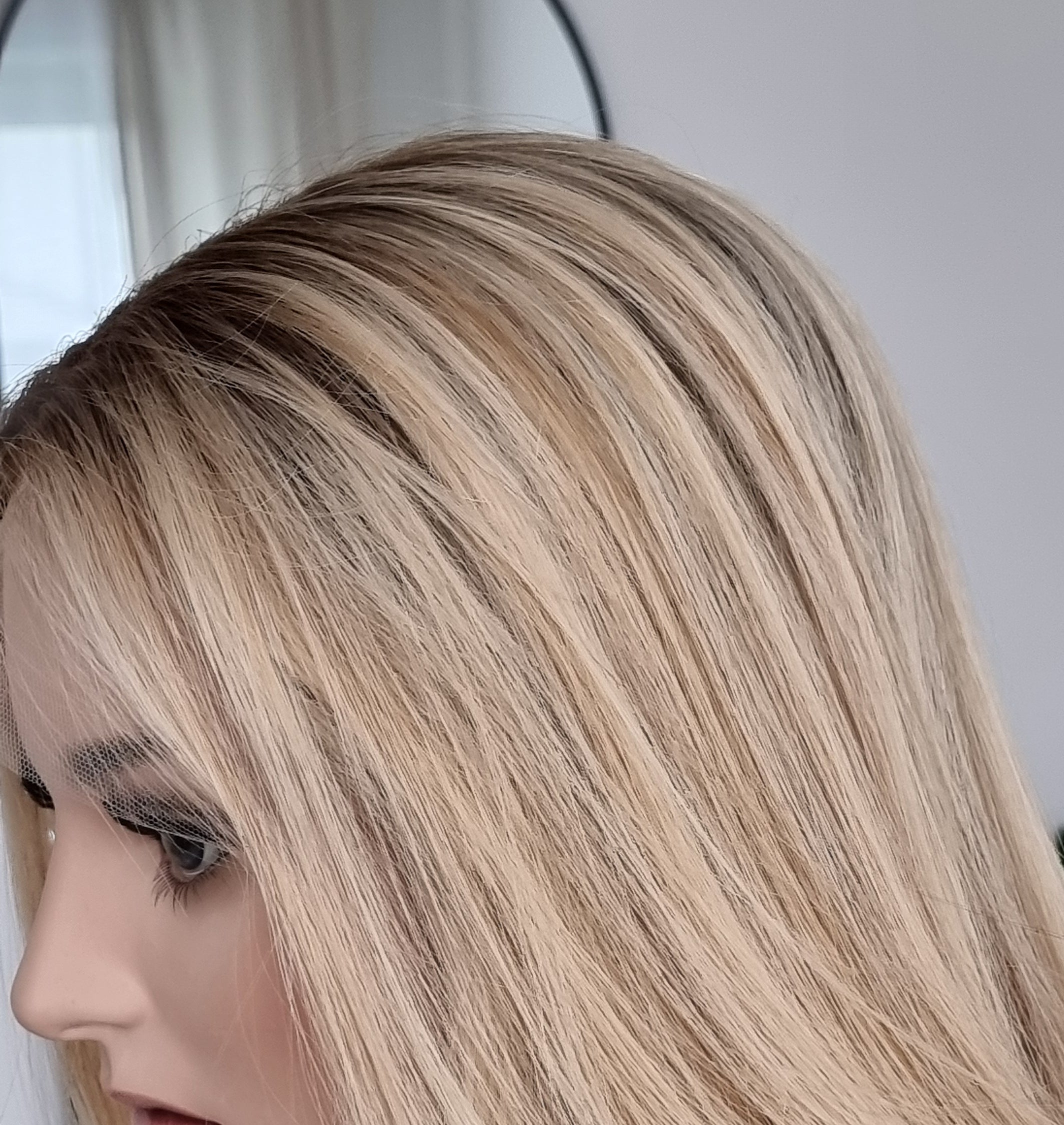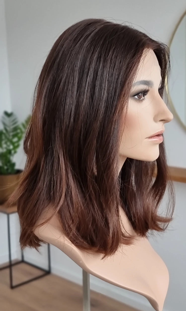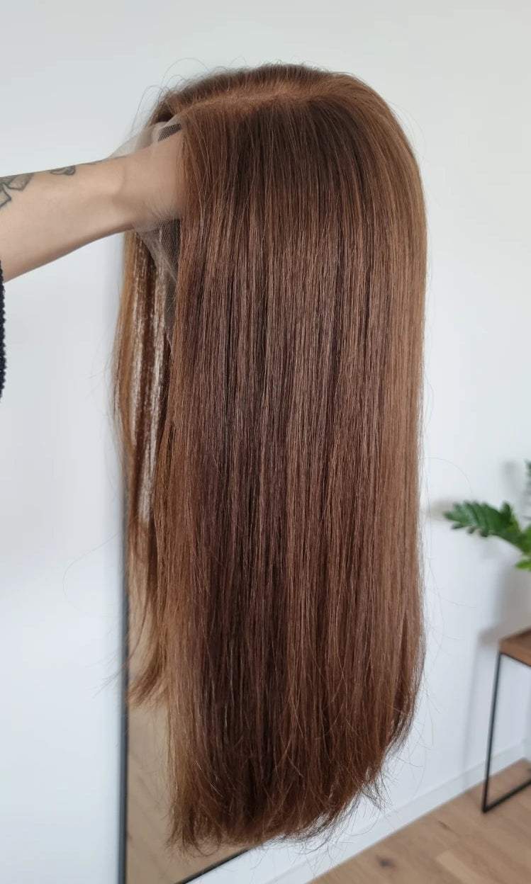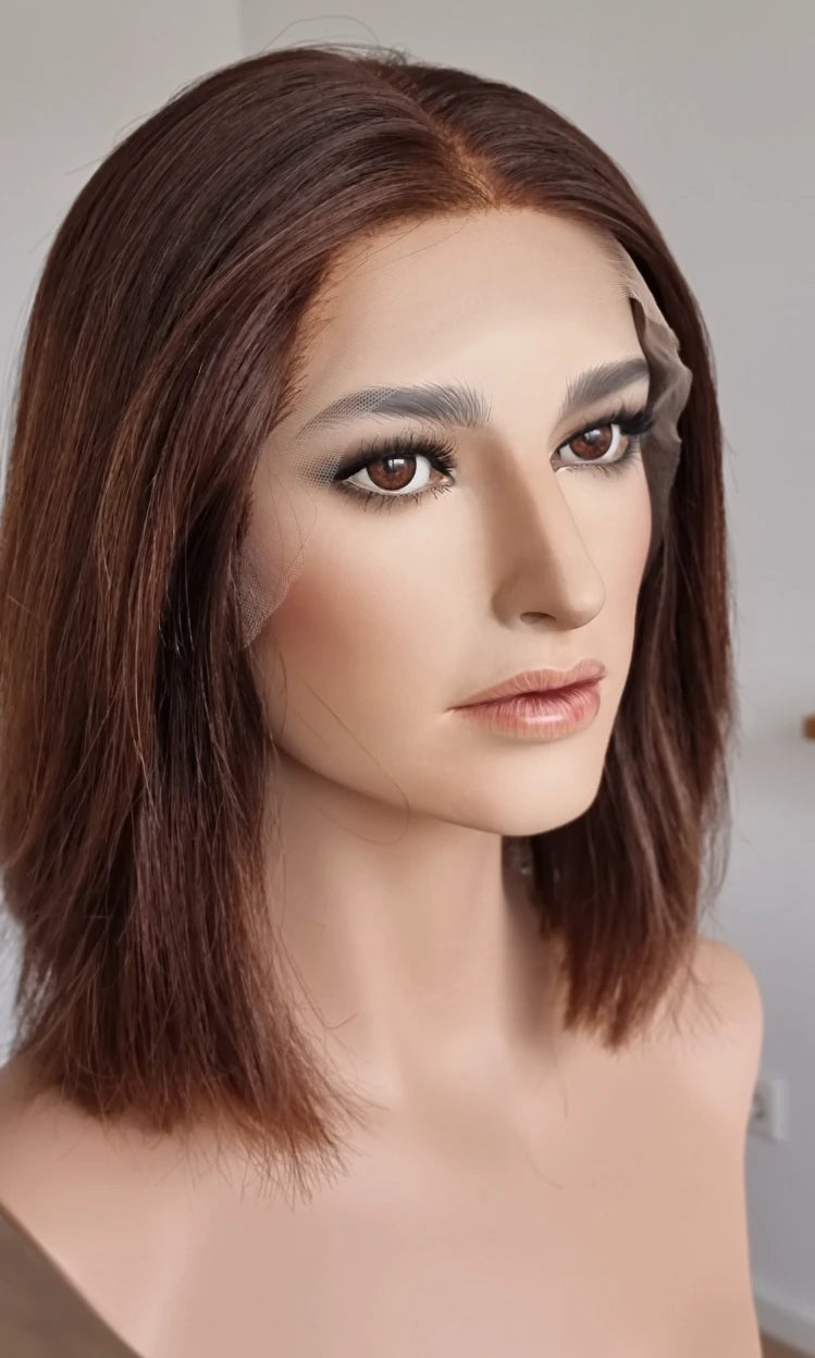 Eine Perücke bedeckt den gesamten Kopf und besteht aus verschiedenen Verarbeitungstechnicken, die gemeinsam für ein natürliches Aussehen sorgen.