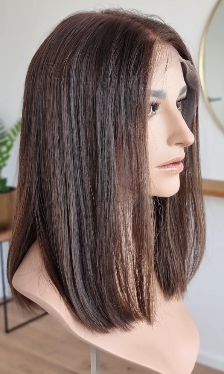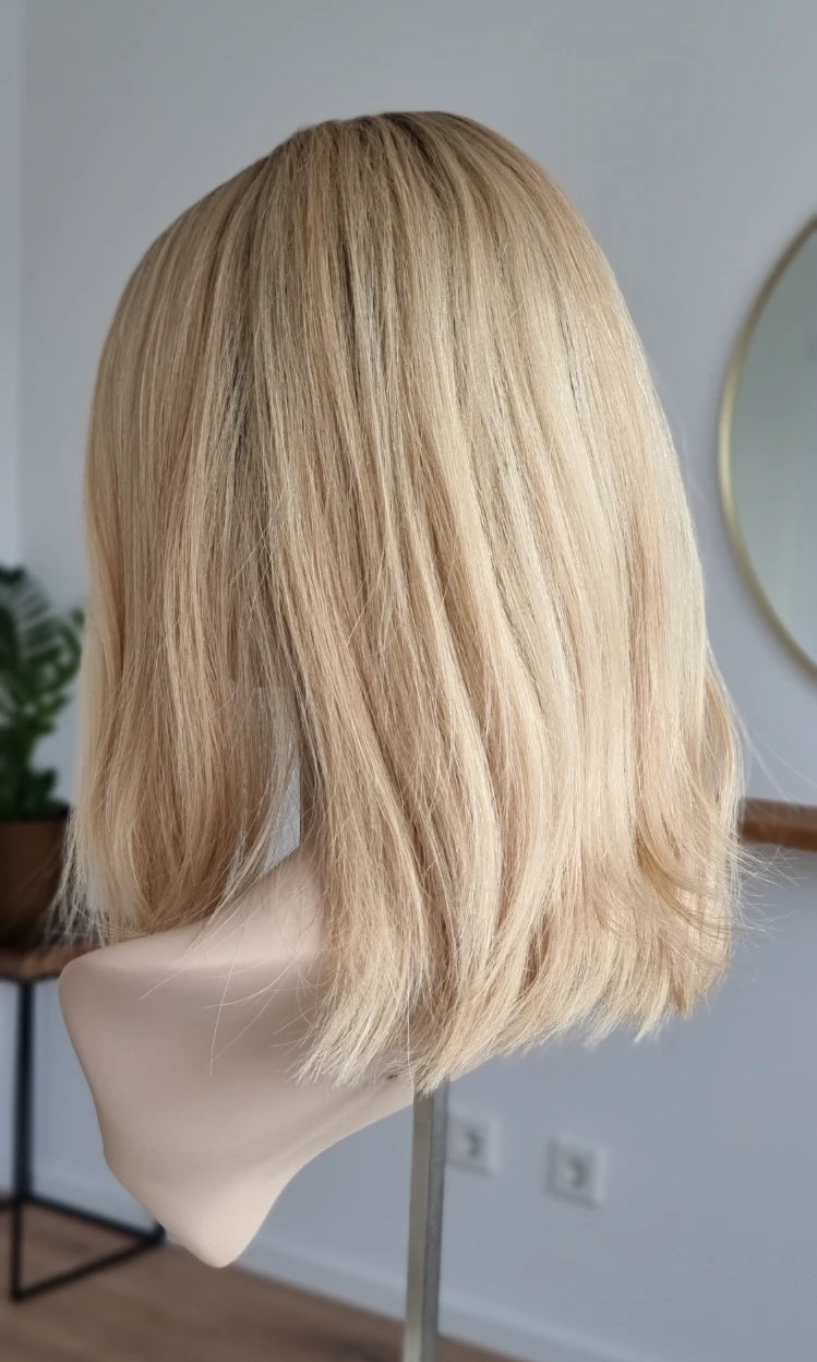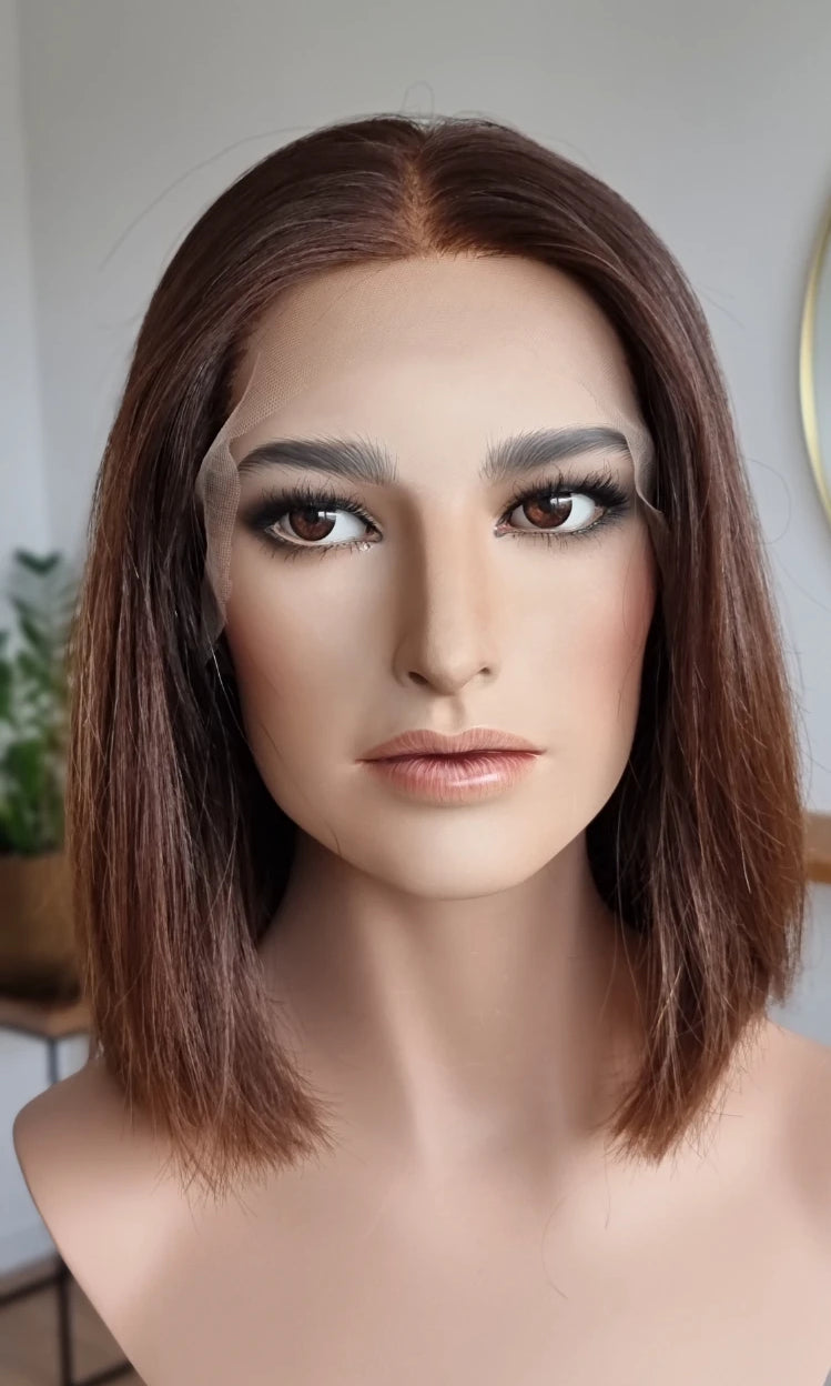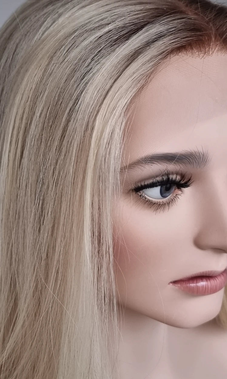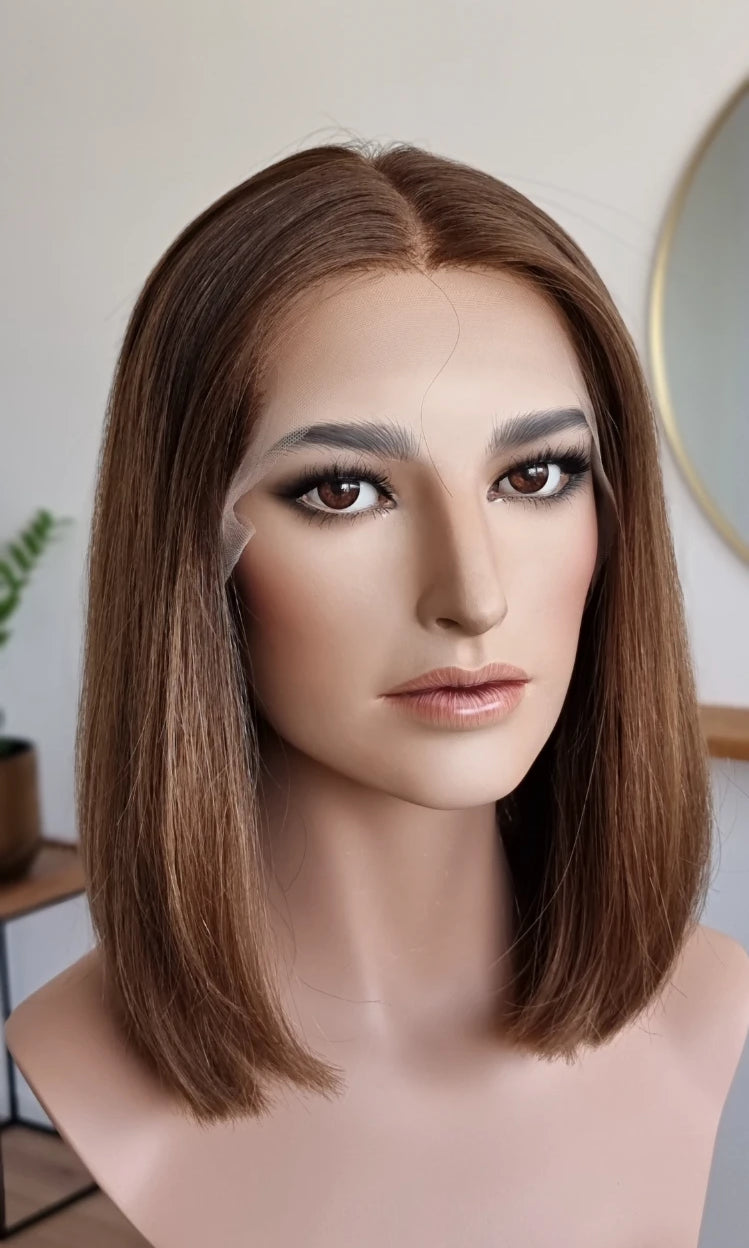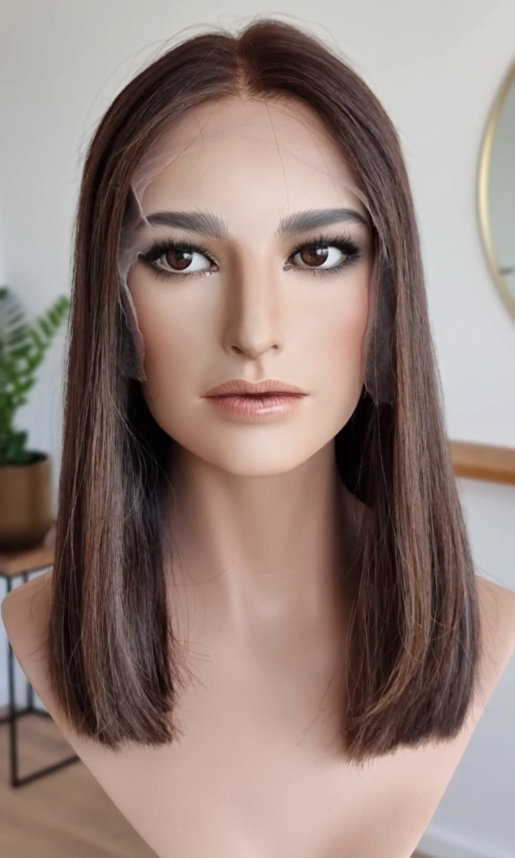 Eine Perücke bedeckt den gesamten Kopf und besteht aus verschiedenen Verarbeitungstechnicken, die gemeinsam für ein natürliches Aussehen sorgen.