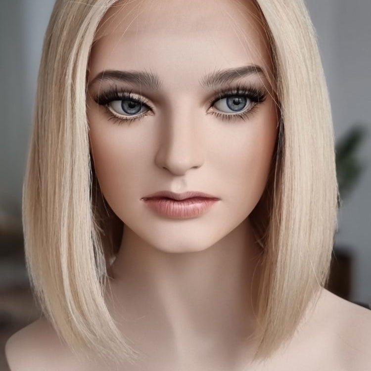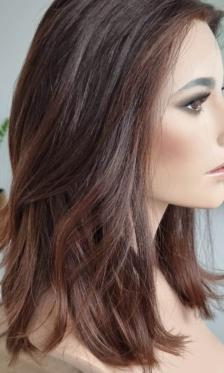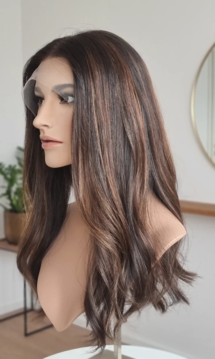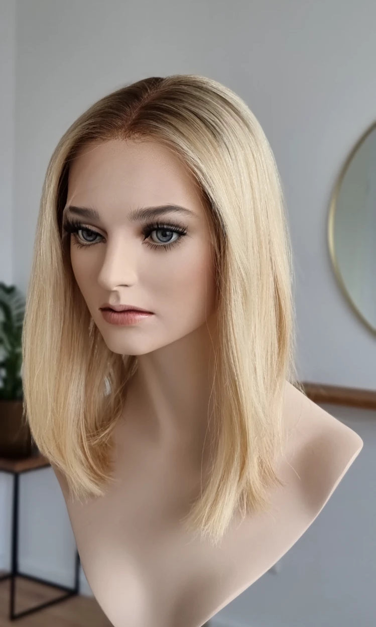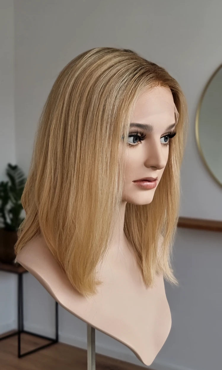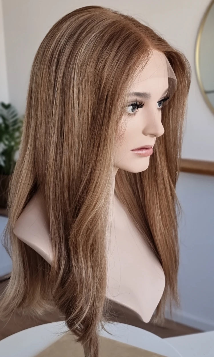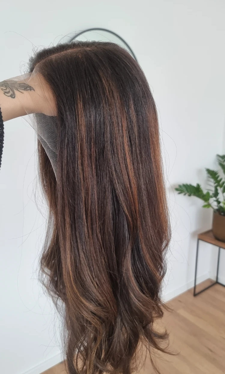 Eine Perücke bedeckt den gesamten Kopf und besteht aus verschiedenen Verarbeitungstechnicken, die gemeinsam für ein natürliches Aussehen sorgen.