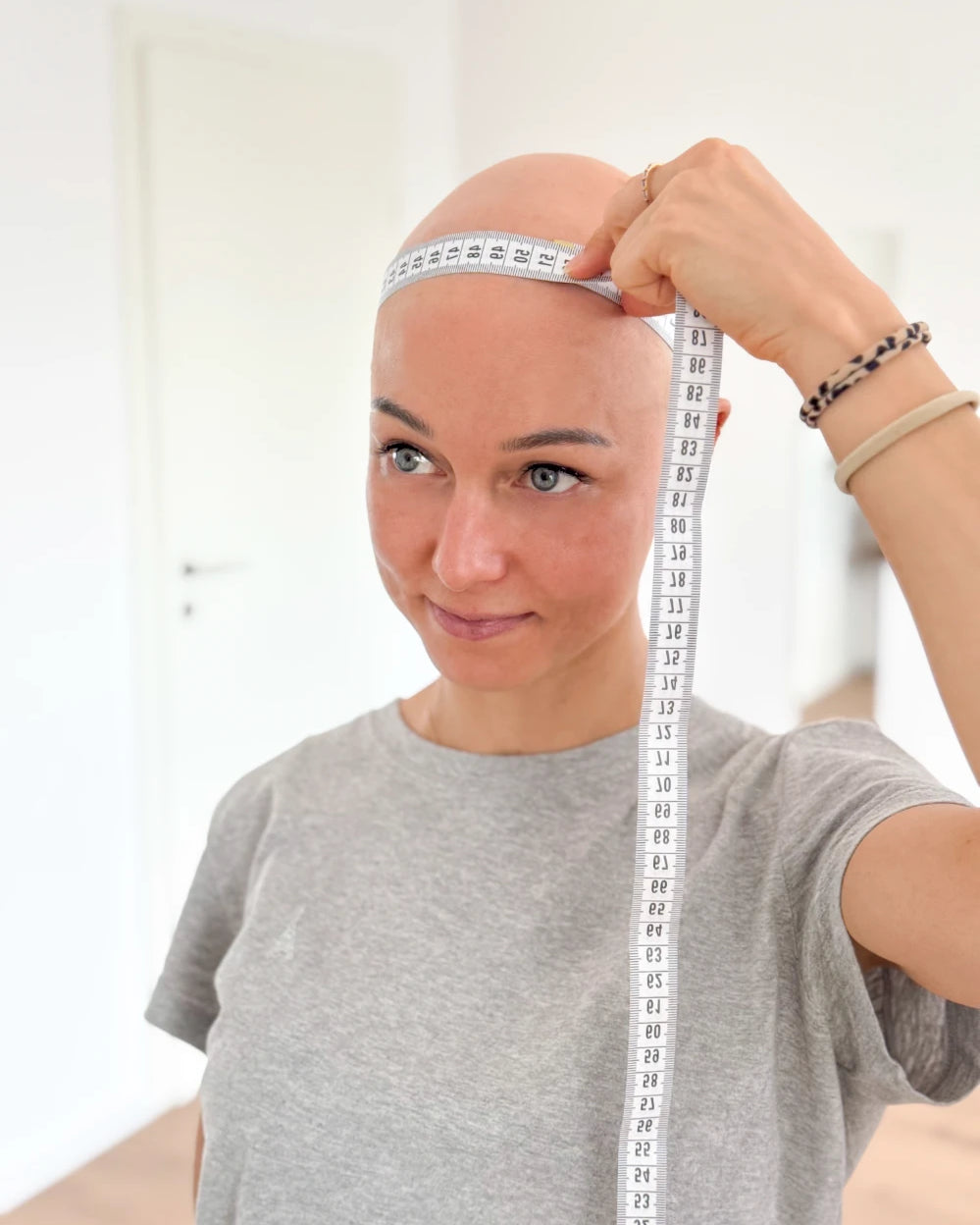 Um deine Perücken-Größe zu bestimmen, benötigst du drei Maße: Den Kopfumfang, das Ohr-zu-Ohr-Maß und den Abstand zwischen (ehemaligem) Haaransatz und deinem Nacken.