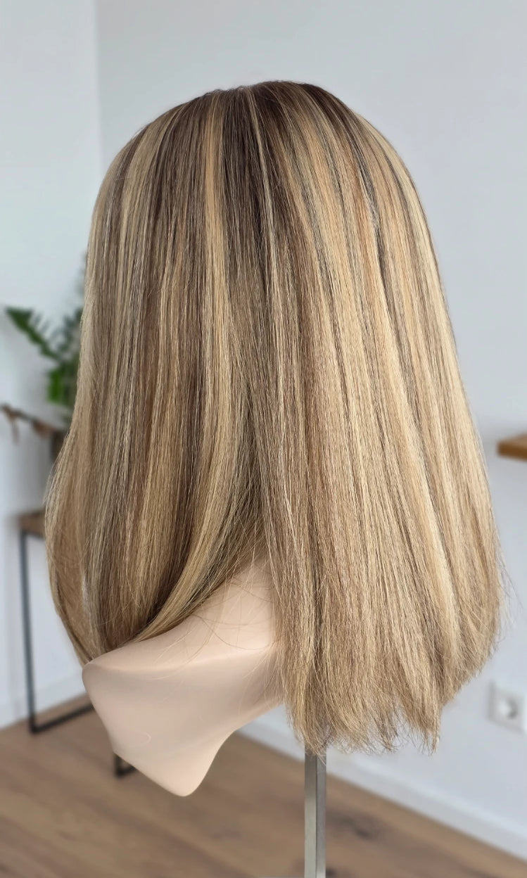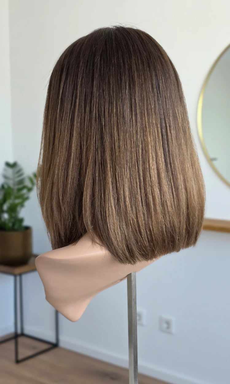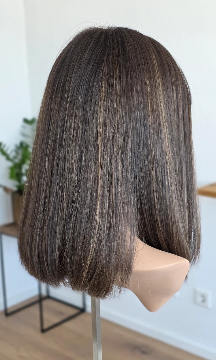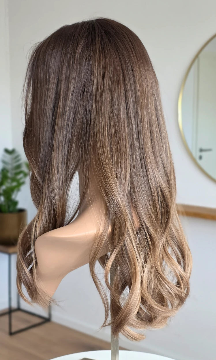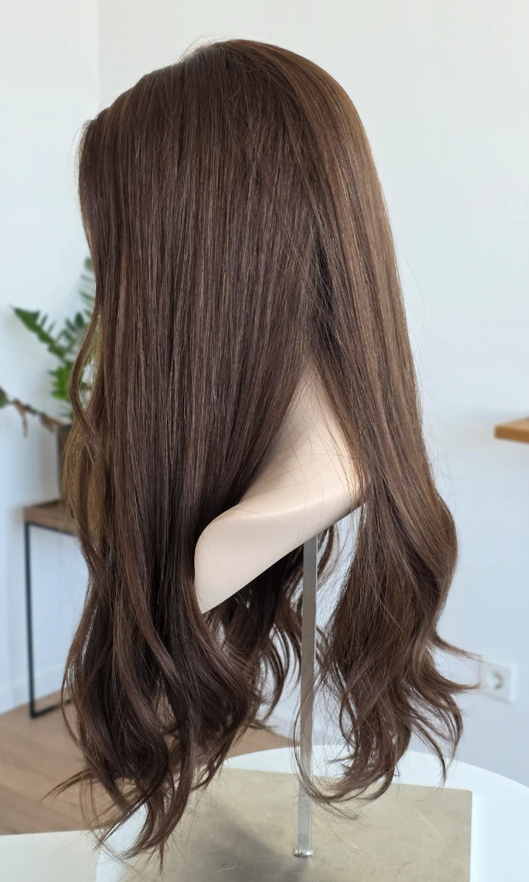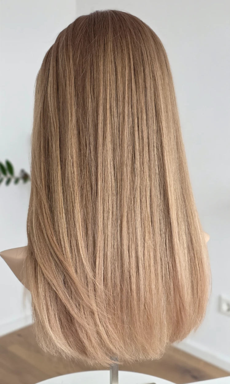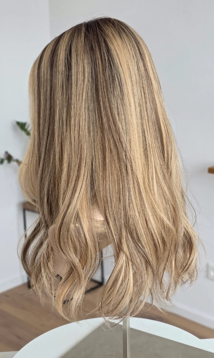 Eine Perücke bedeckt den gesamten Kopf und besteht aus verschiedenen Verarbeitungstechnicken, die gemeinsam für ein natürliches Aussehen sorgen.