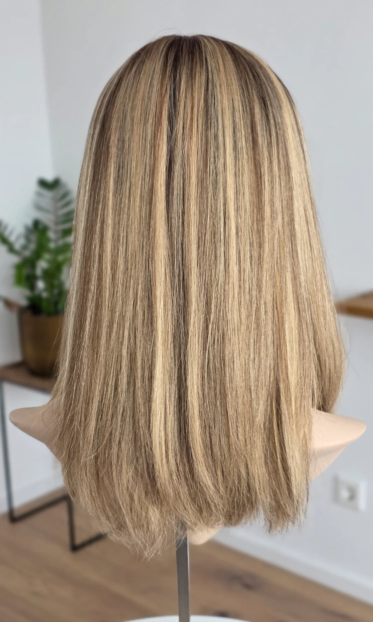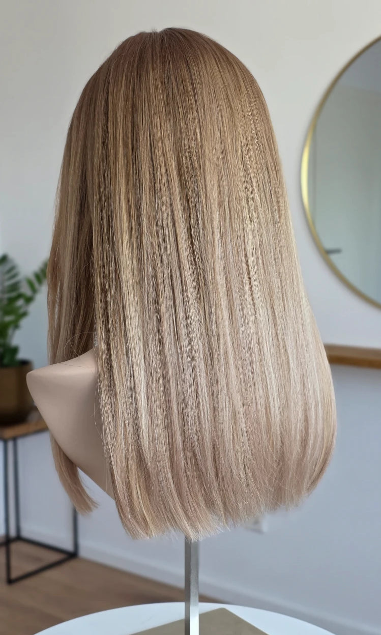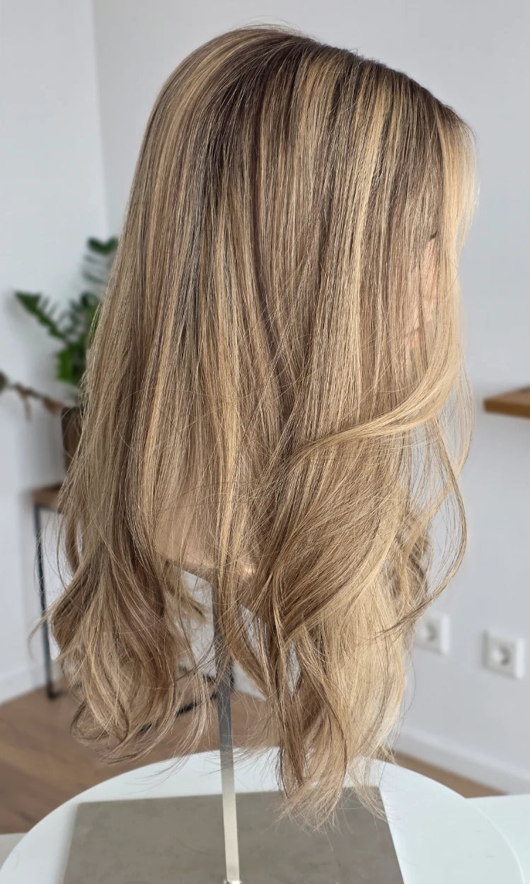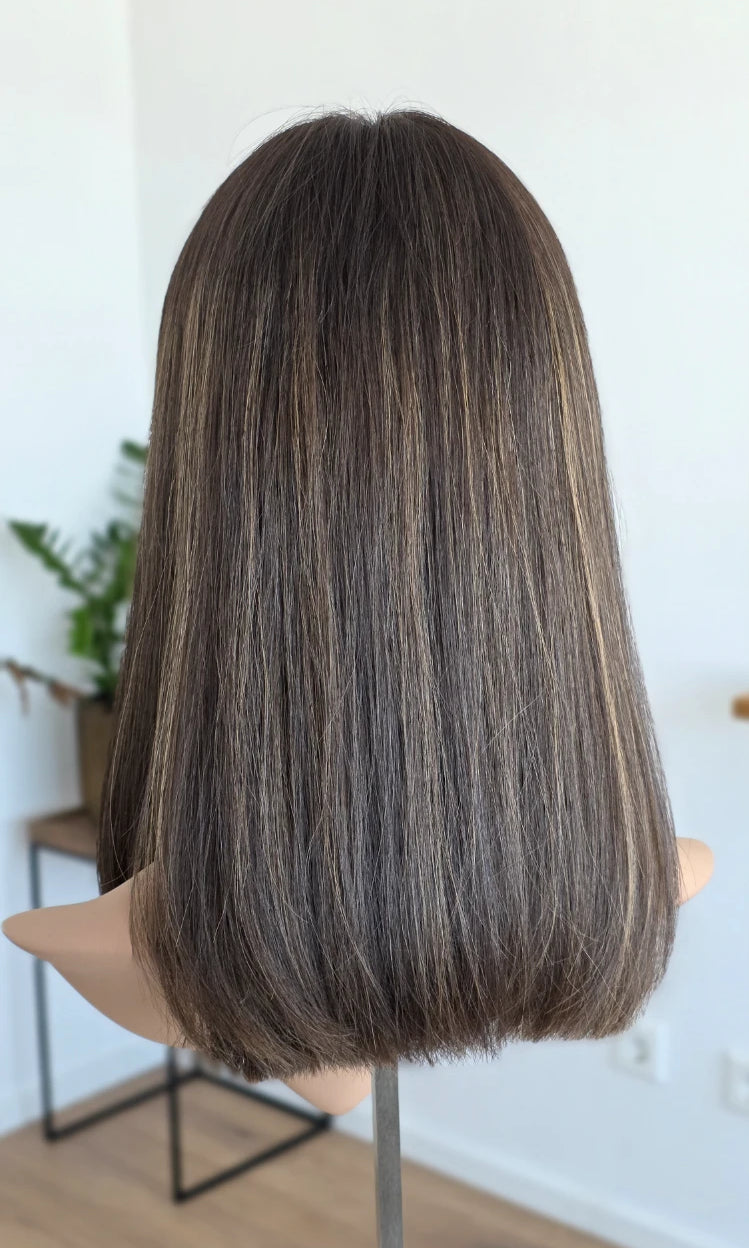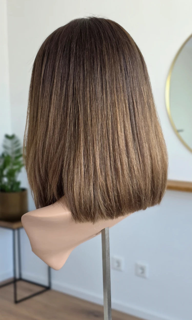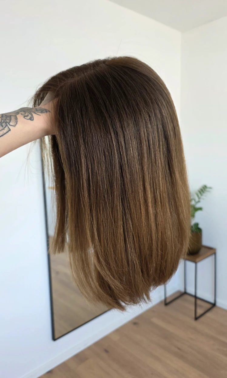 Eine Perücke bedeckt den gesamten Kopf und besteht aus verschiedenen Verarbeitungstechnicken, die gemeinsam für ein natürliches Aussehen sorgen.