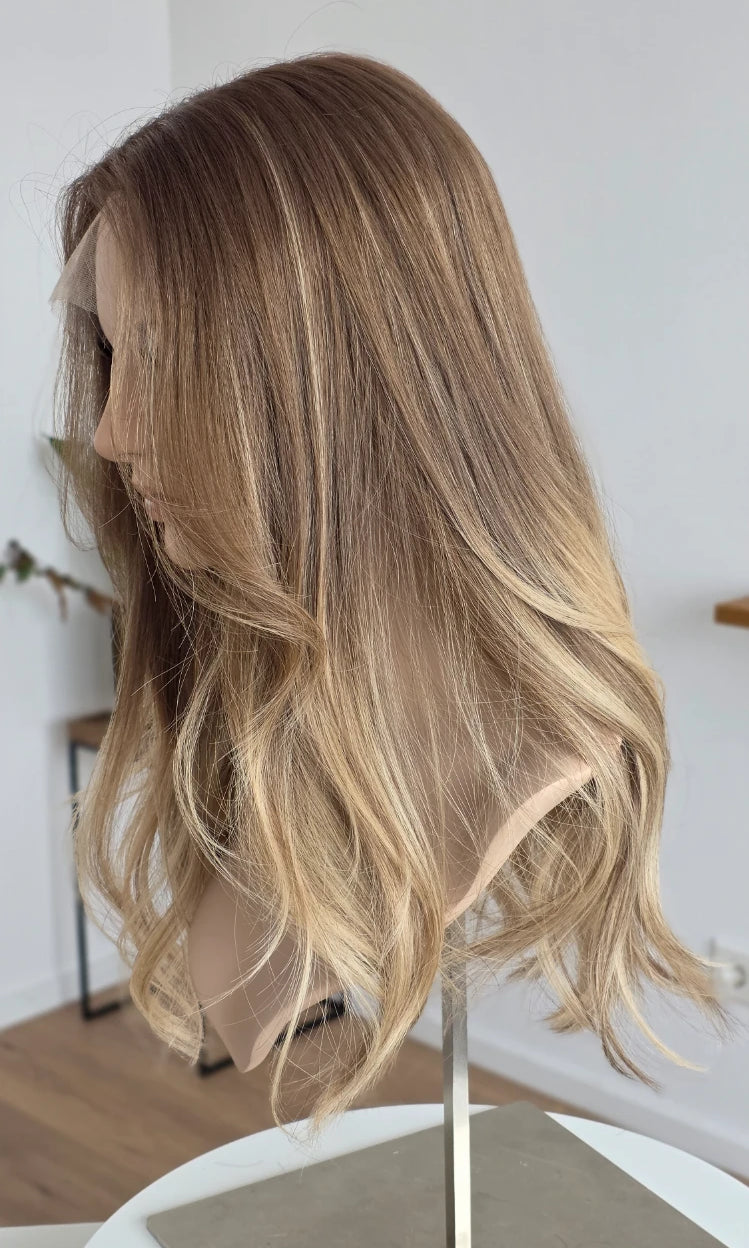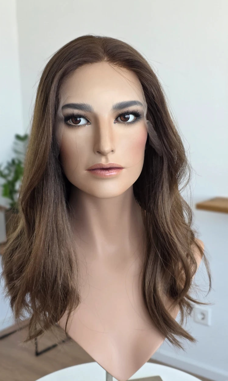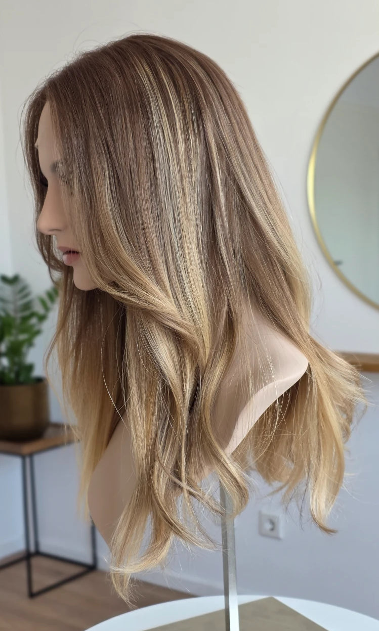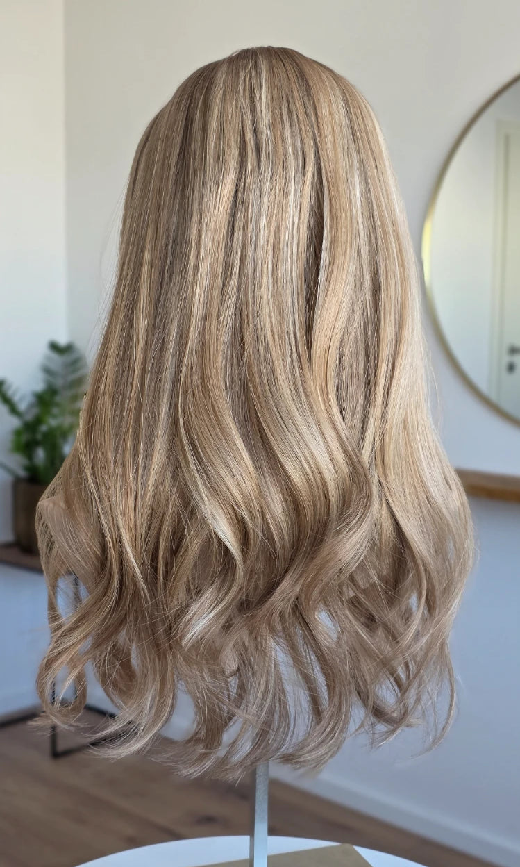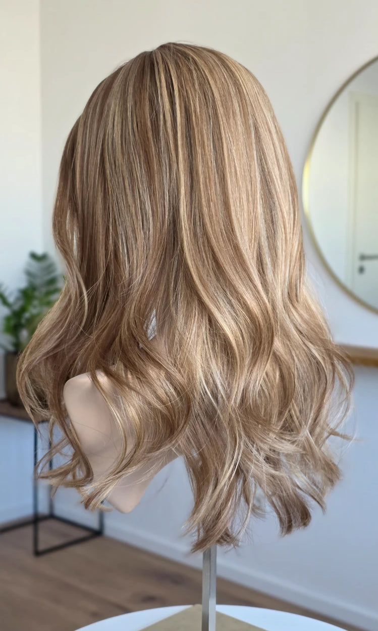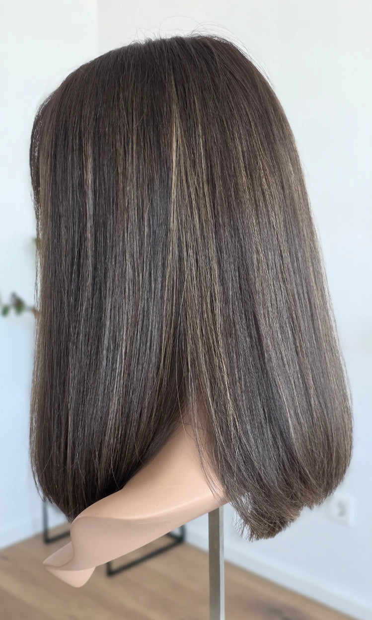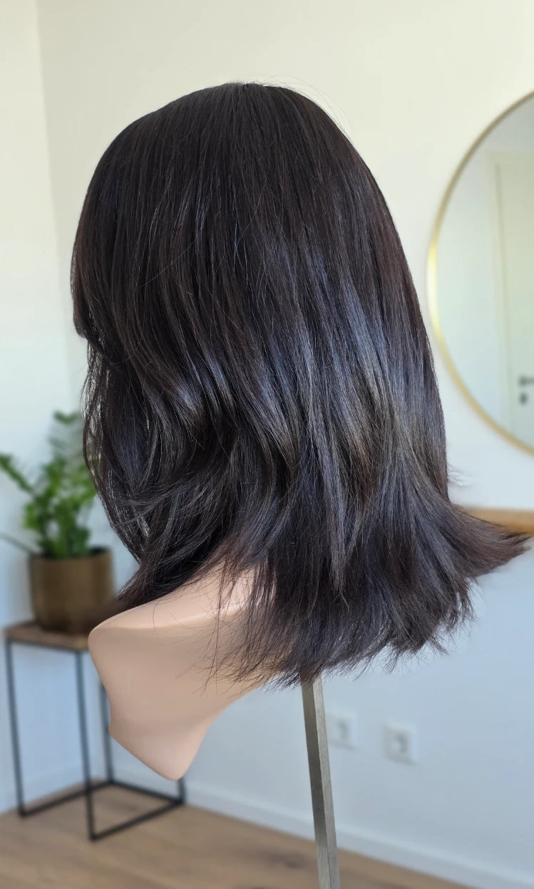 Eine Perücke bedeckt den gesamten Kopf und besteht aus verschiedenen Verarbeitungstechnicken, die gemeinsam für ein natürliches Aussehen sorgen.