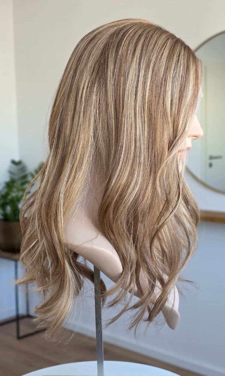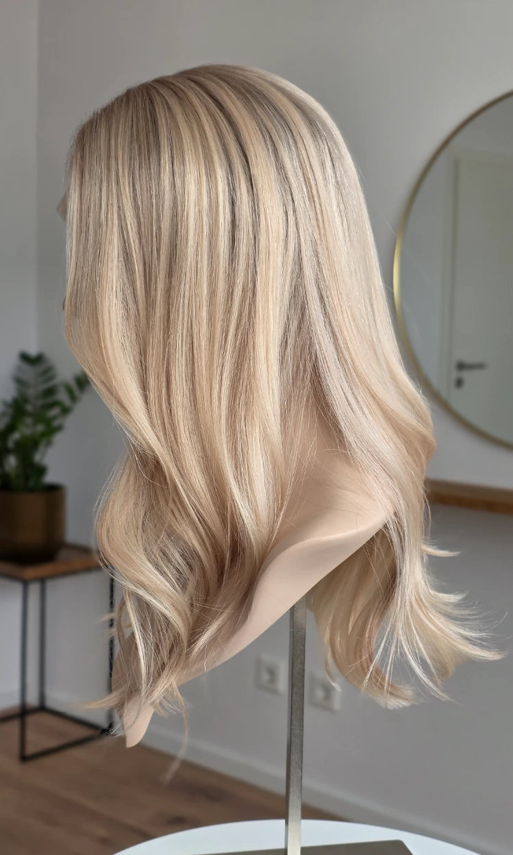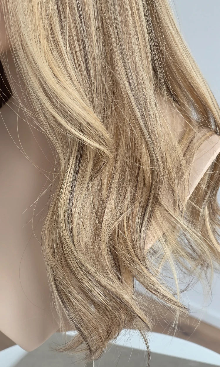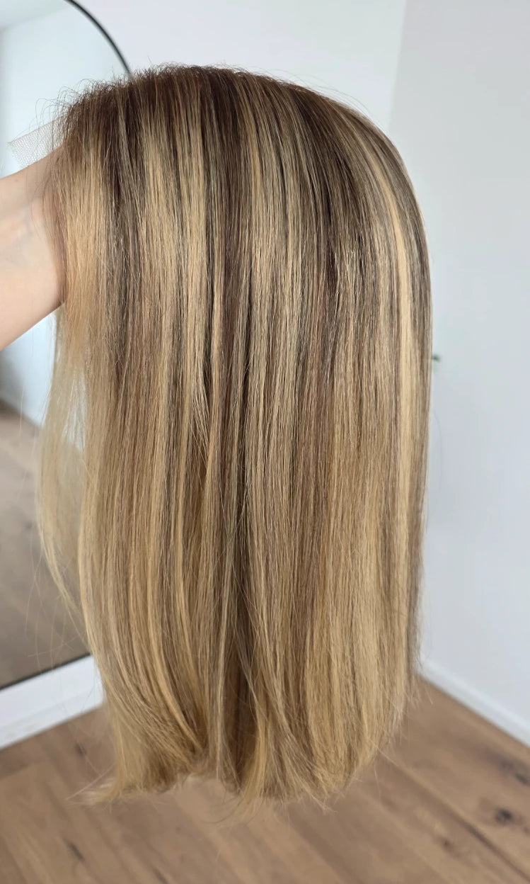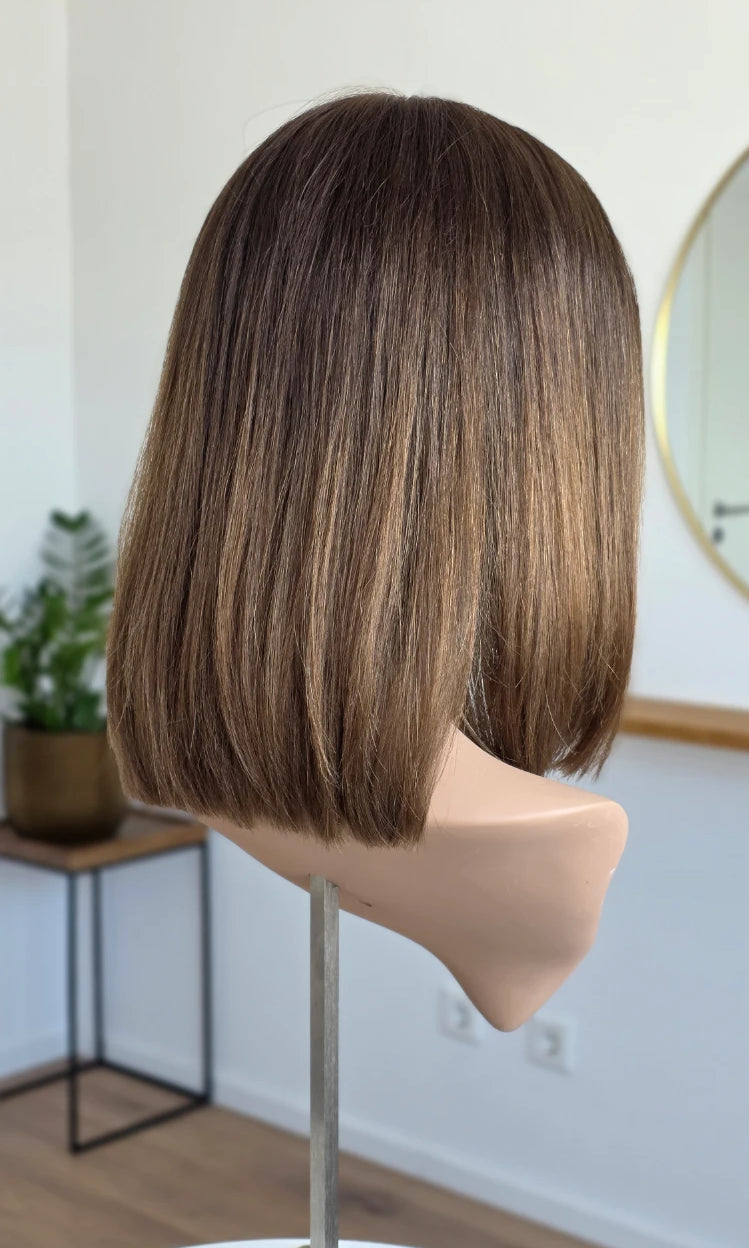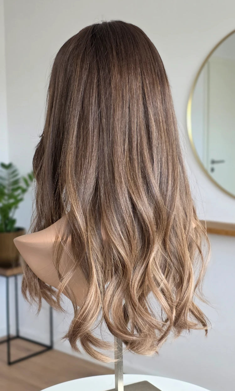 Eine Perücke bedeckt den gesamten Kopf und besteht aus verschiedenen Verarbeitungstechnicken, die gemeinsam für ein natürliches Aussehen sorgen.