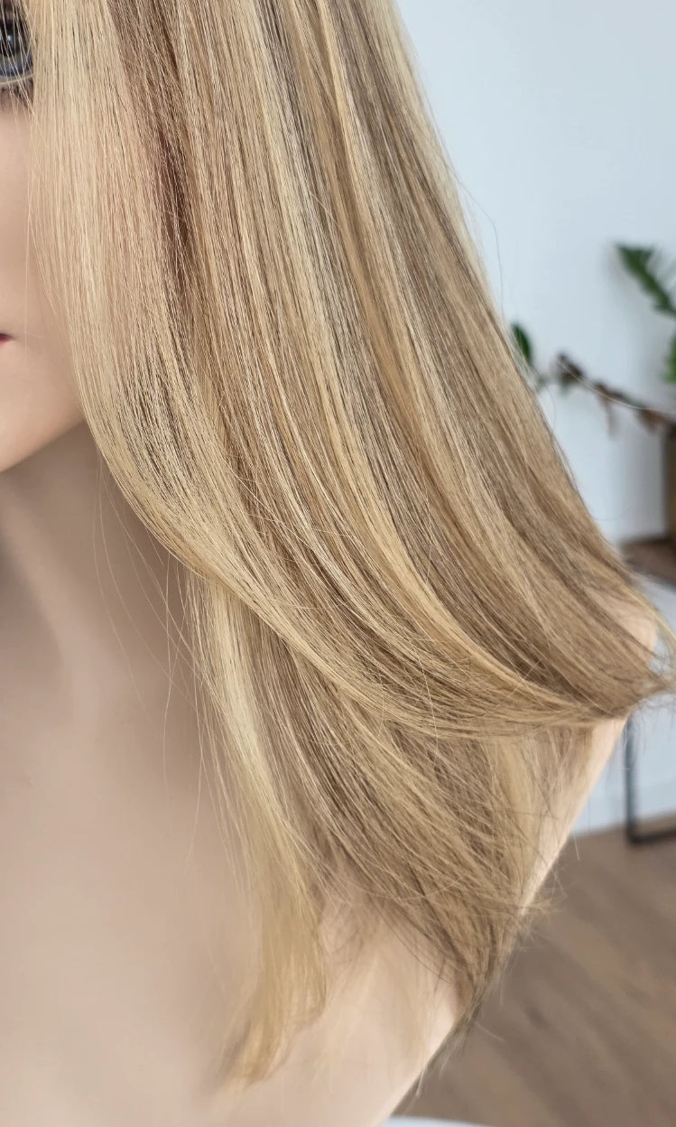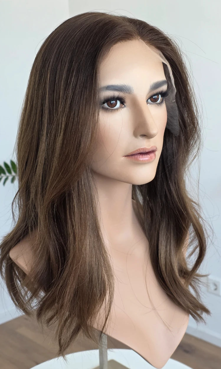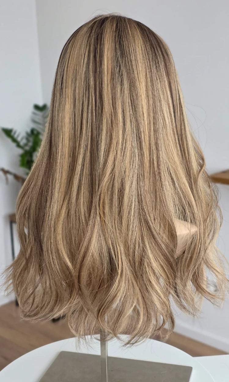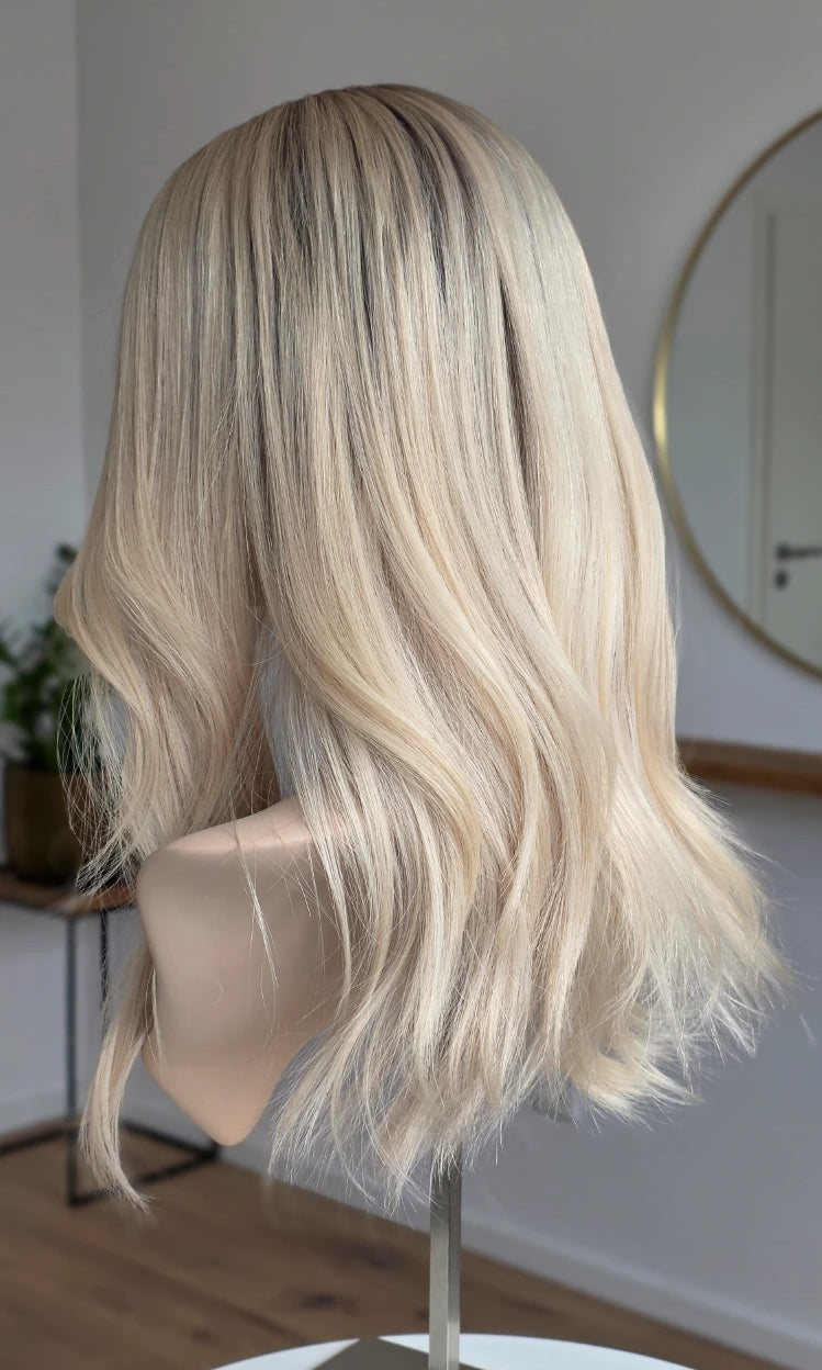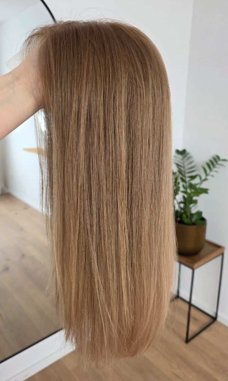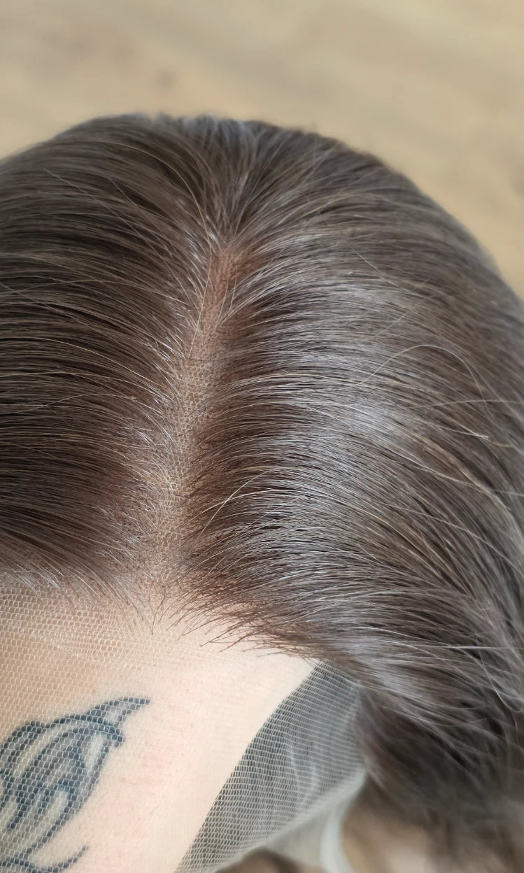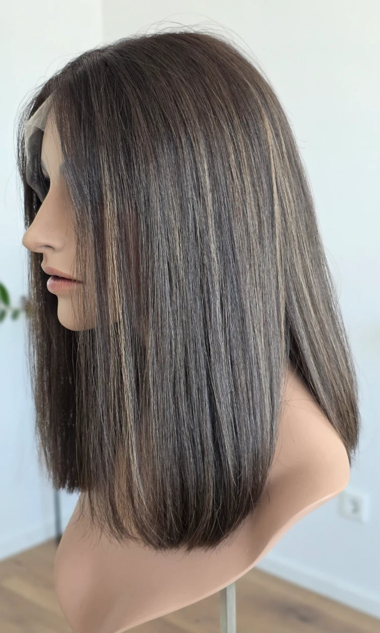 Eine Perücke bedeckt den gesamten Kopf und besteht aus verschiedenen Verarbeitungstechnicken, die gemeinsam für ein natürliches Aussehen sorgen.