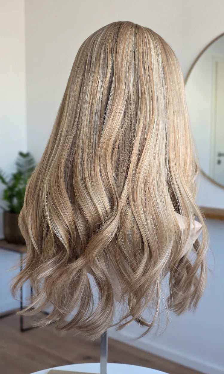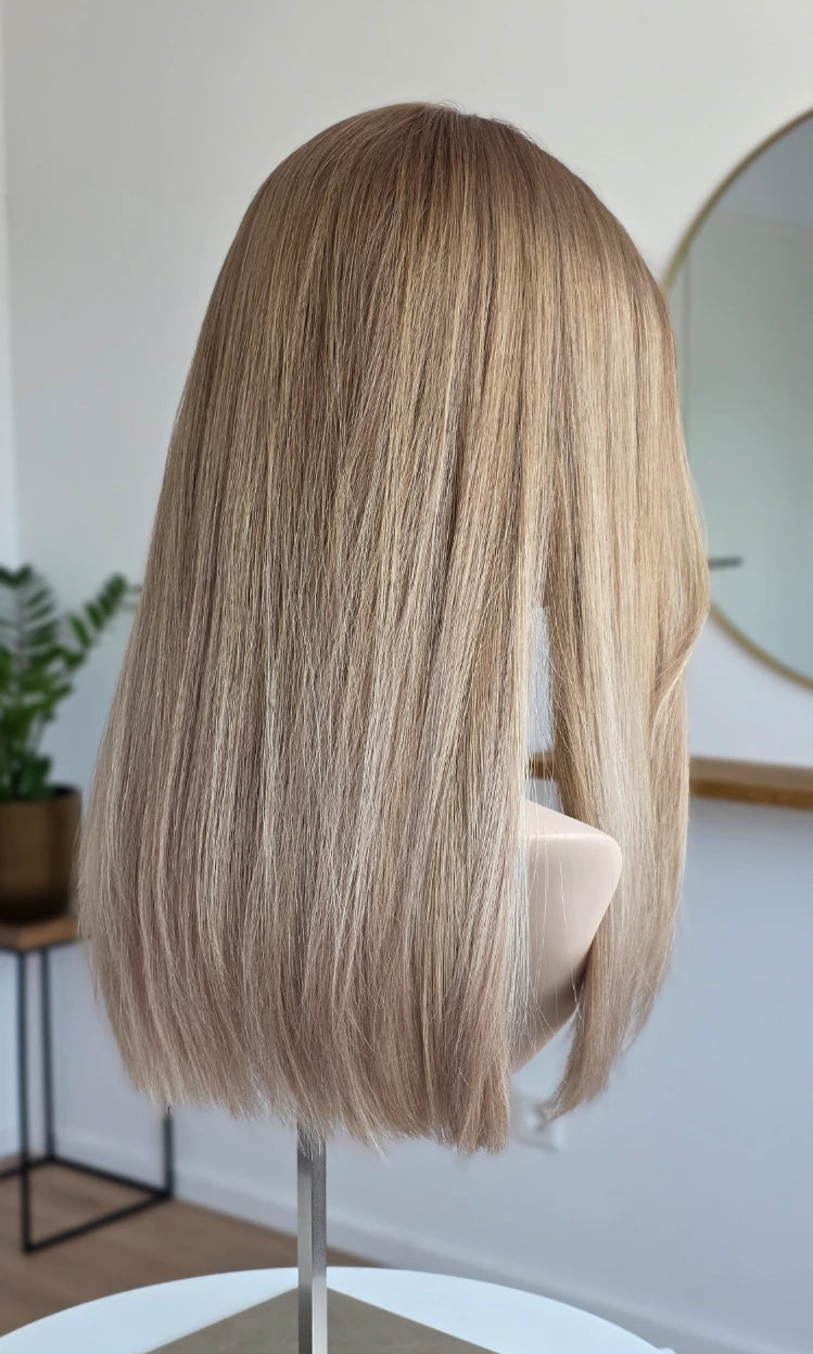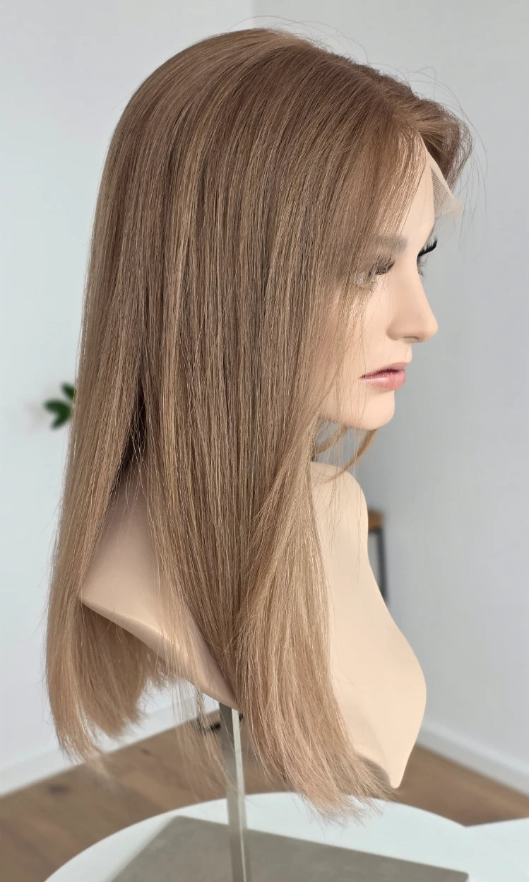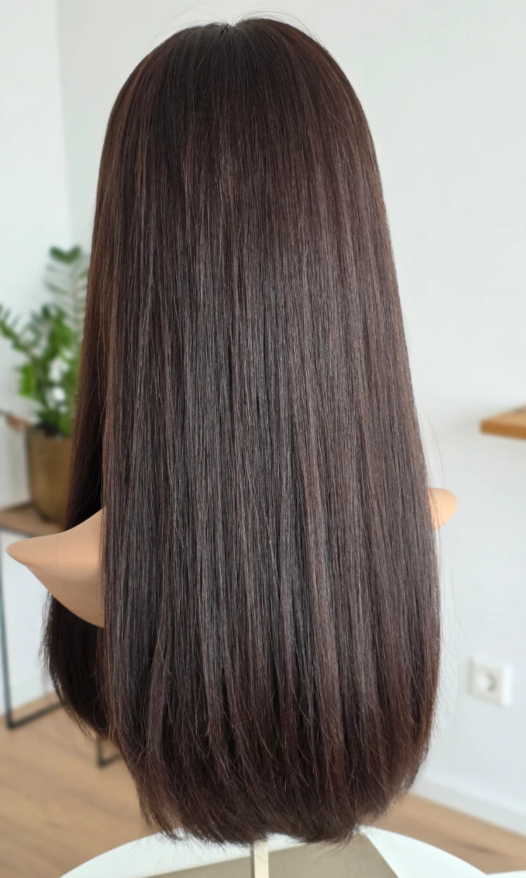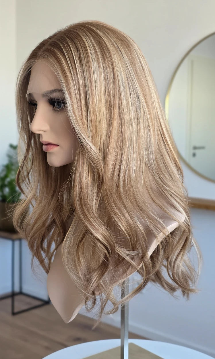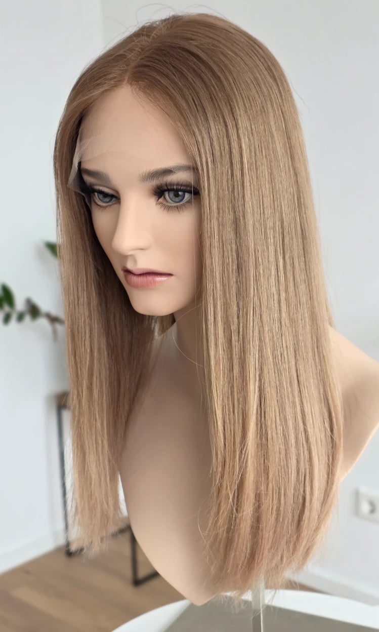 Eine Perücke bedeckt den gesamten Kopf und besteht aus verschiedenen Verarbeitungstechnicken, die gemeinsam für ein natürliches Aussehen sorgen.