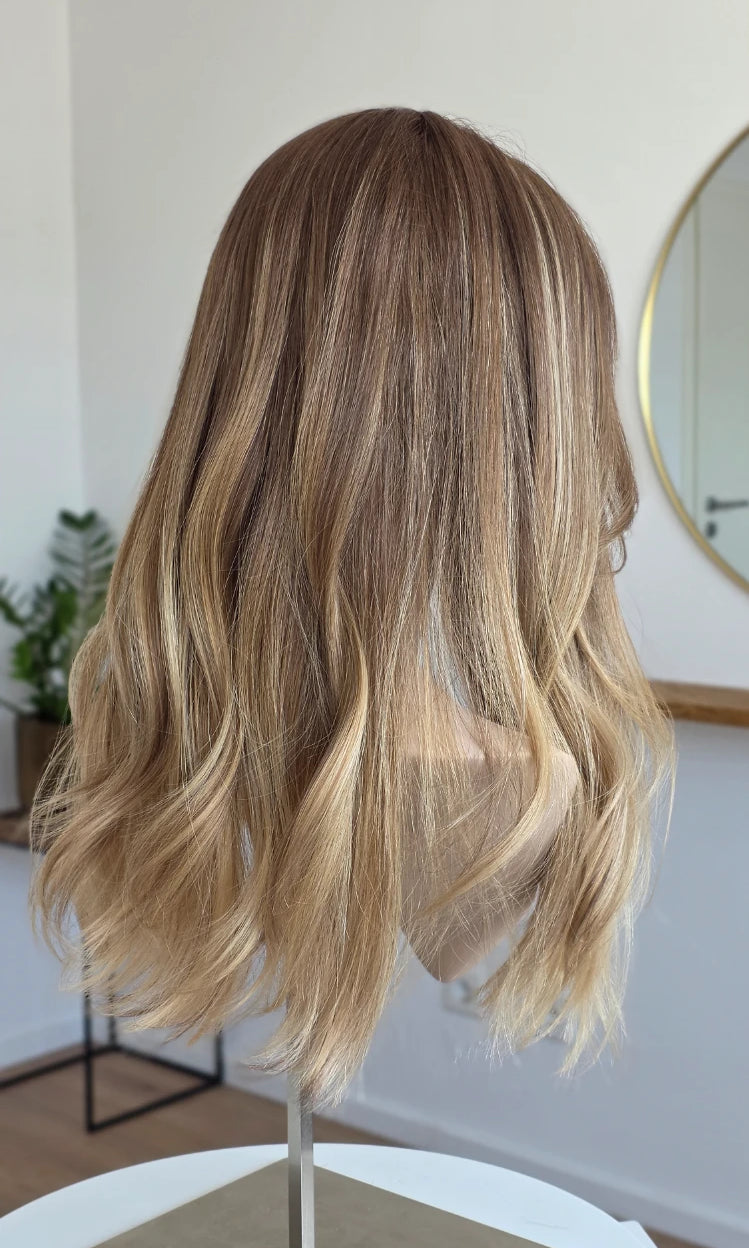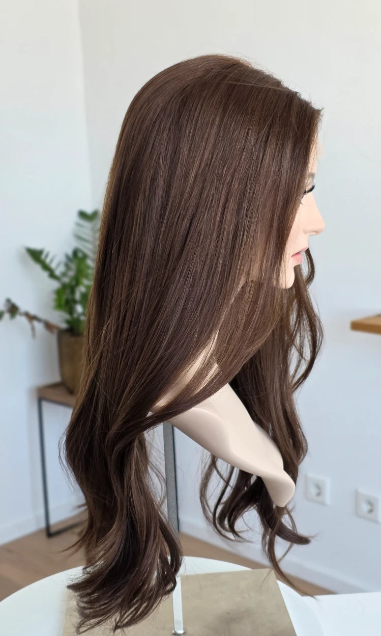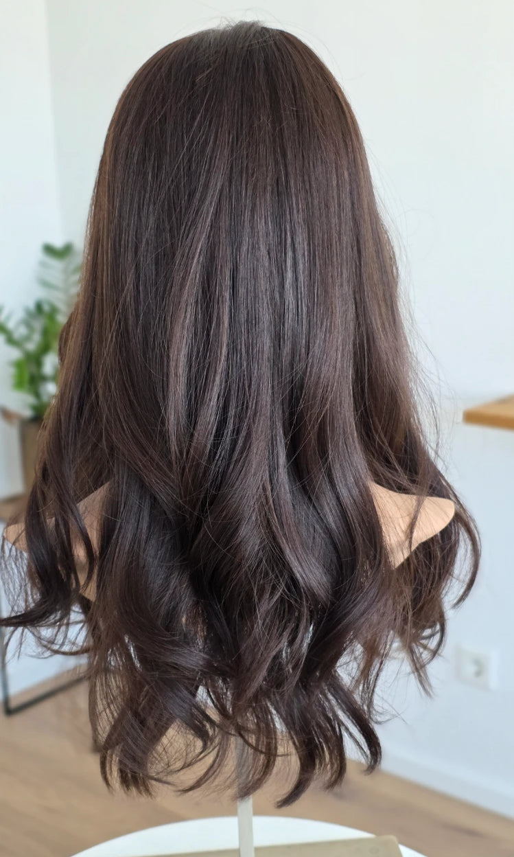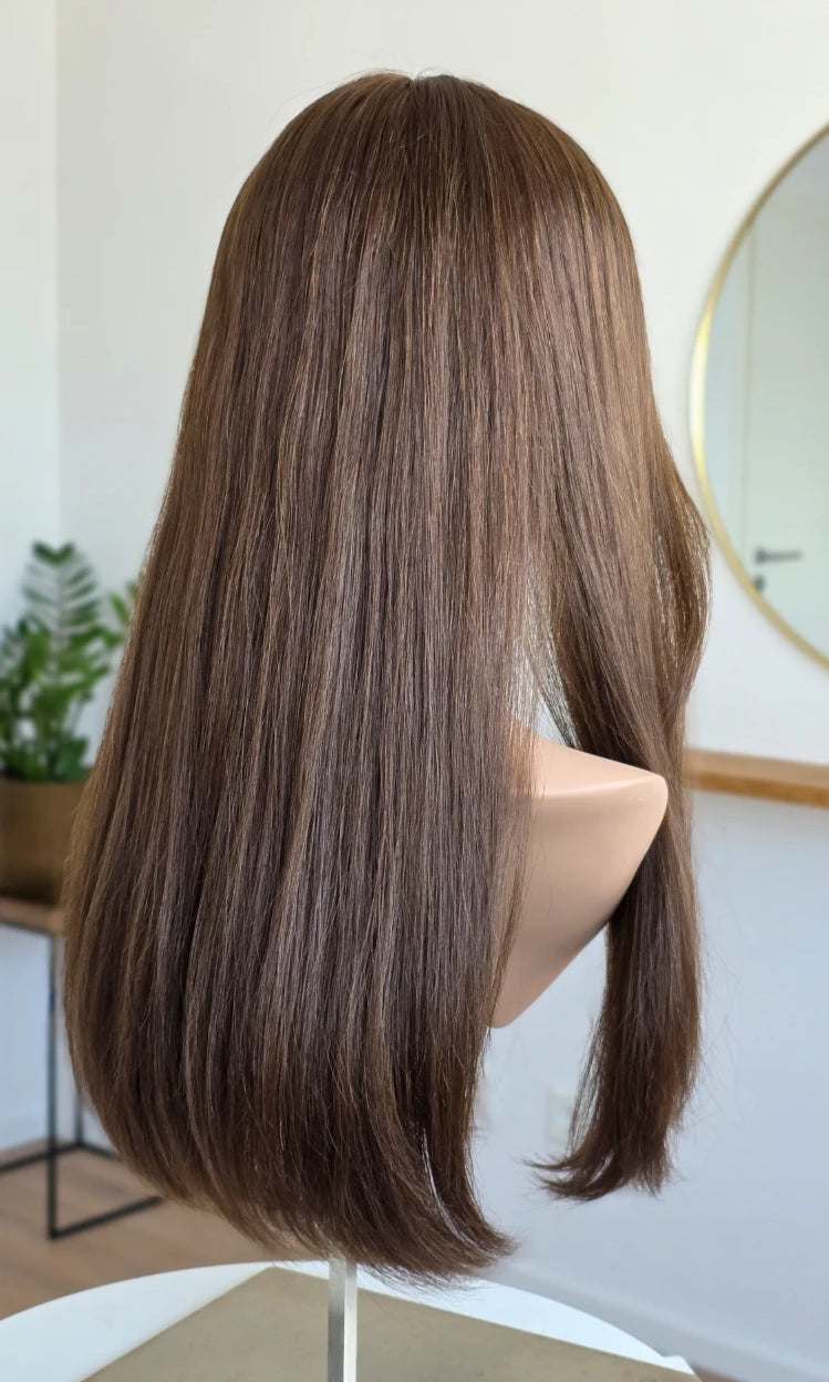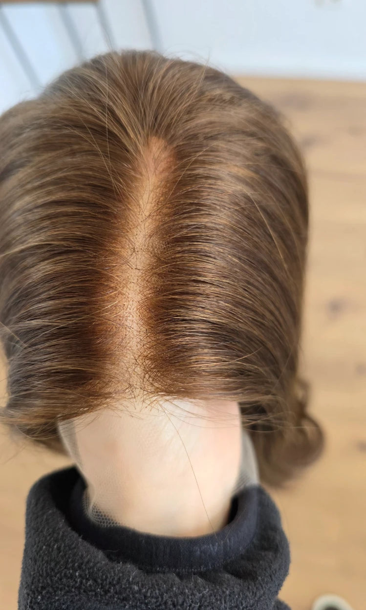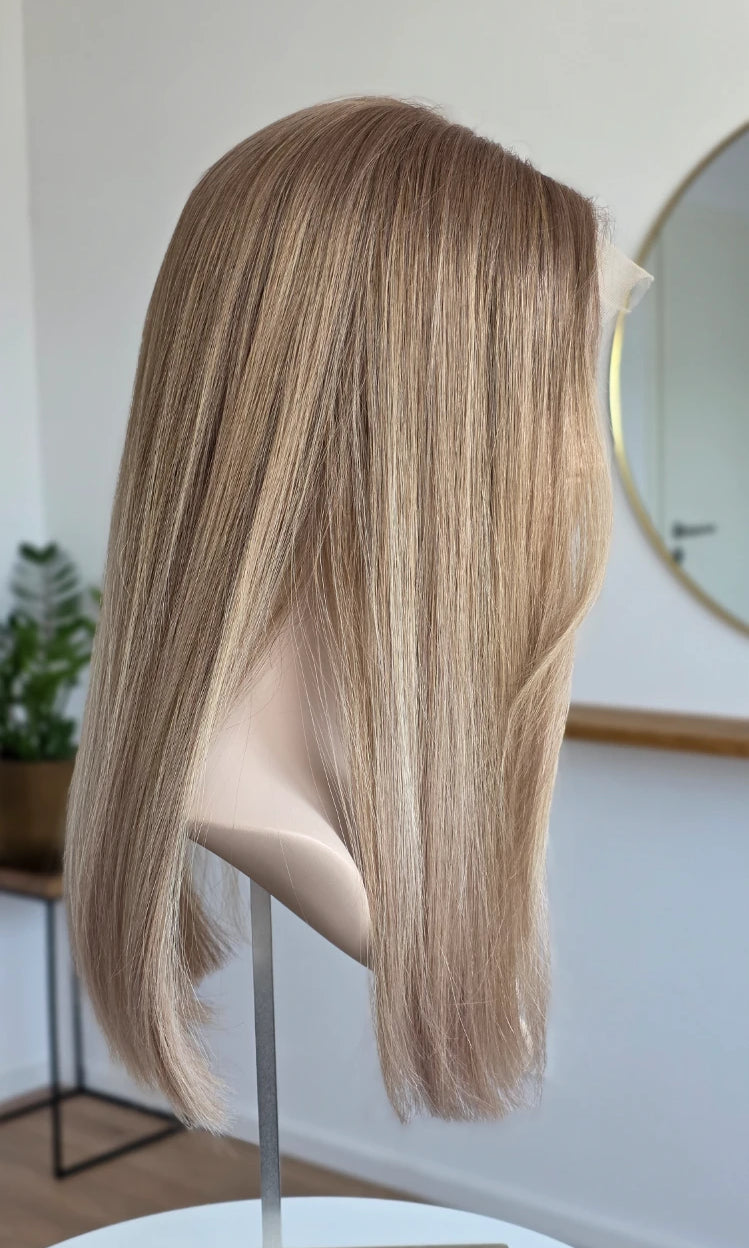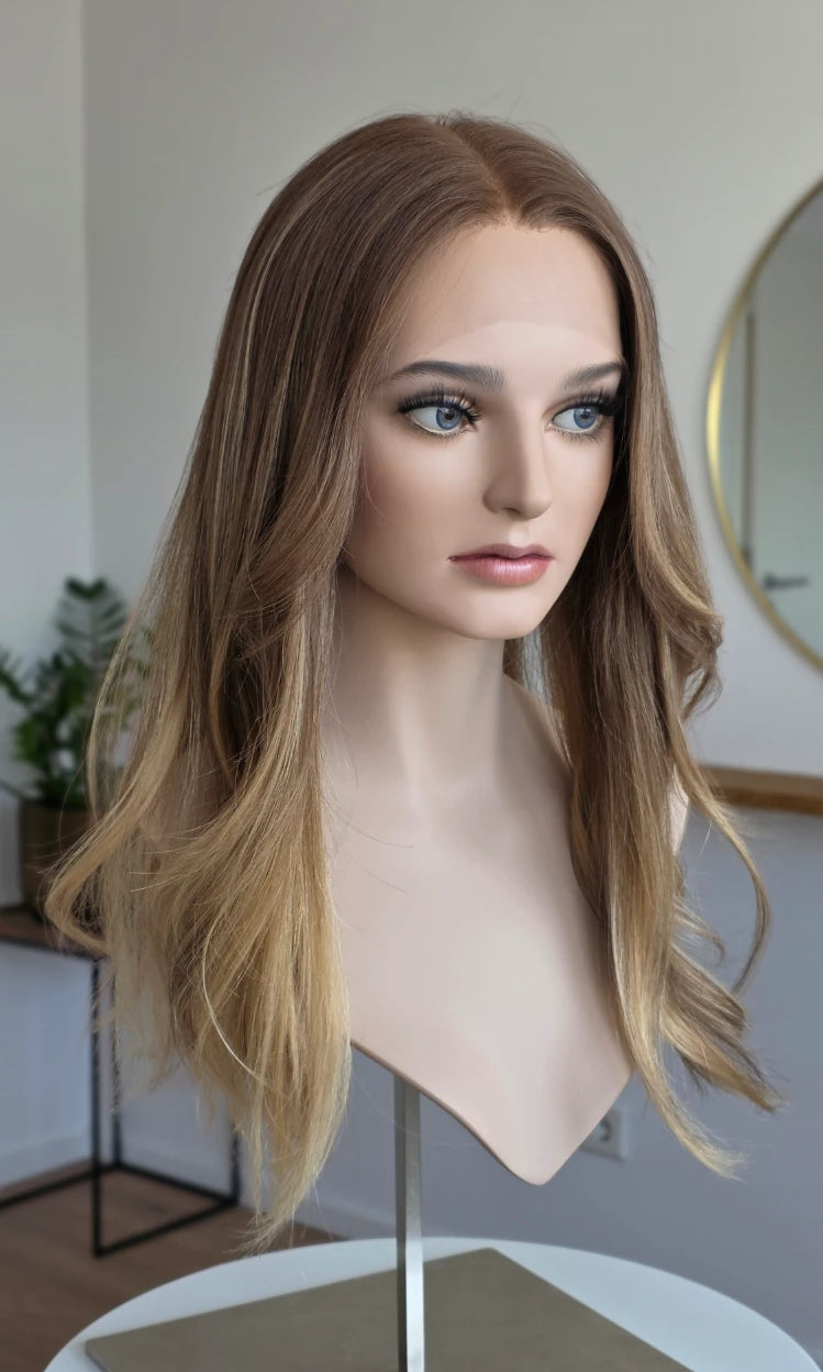 Eine Perücke bedeckt den gesamten Kopf und besteht aus verschiedenen Verarbeitungstechnicken, die gemeinsam für ein natürliches Aussehen sorgen.