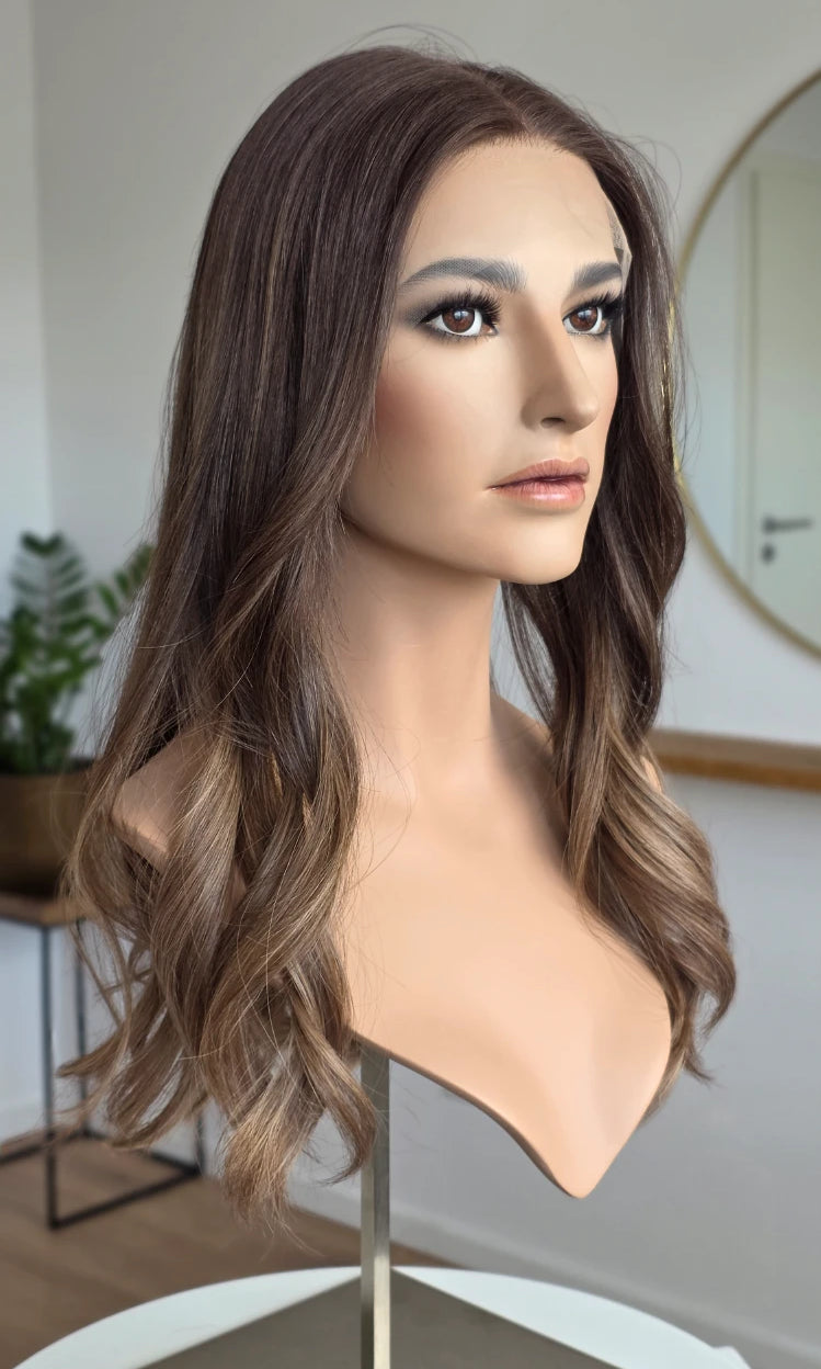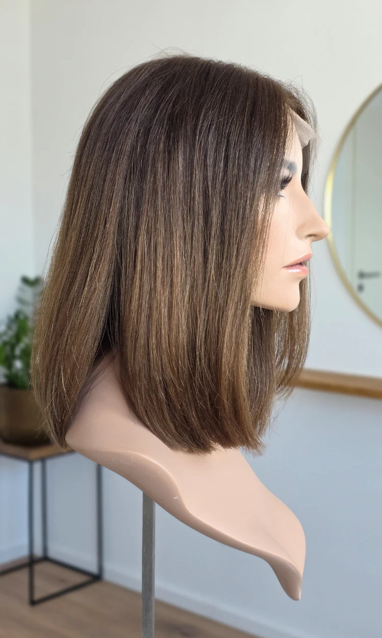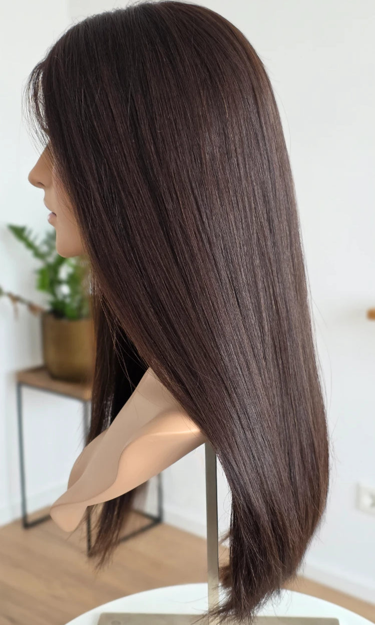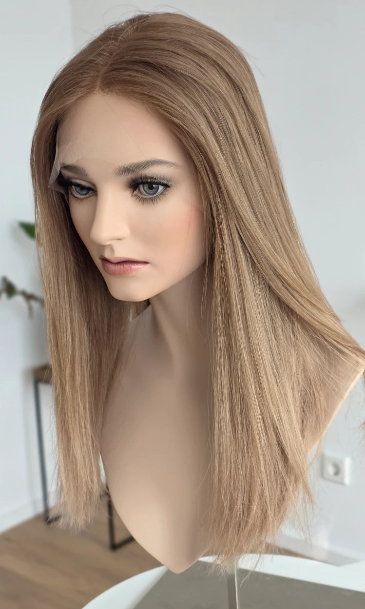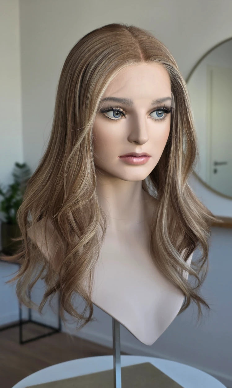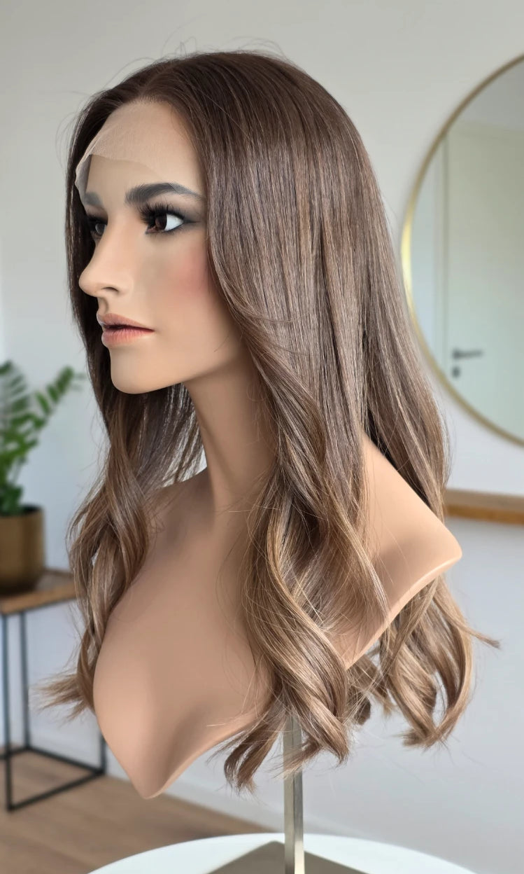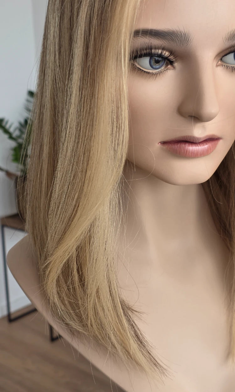 Eine Perücke bedeckt den gesamten Kopf und besteht aus verschiedenen Verarbeitungstechnicken, die gemeinsam für ein natürliches Aussehen sorgen.