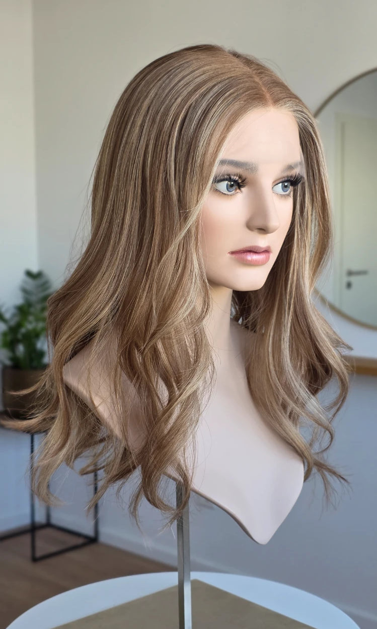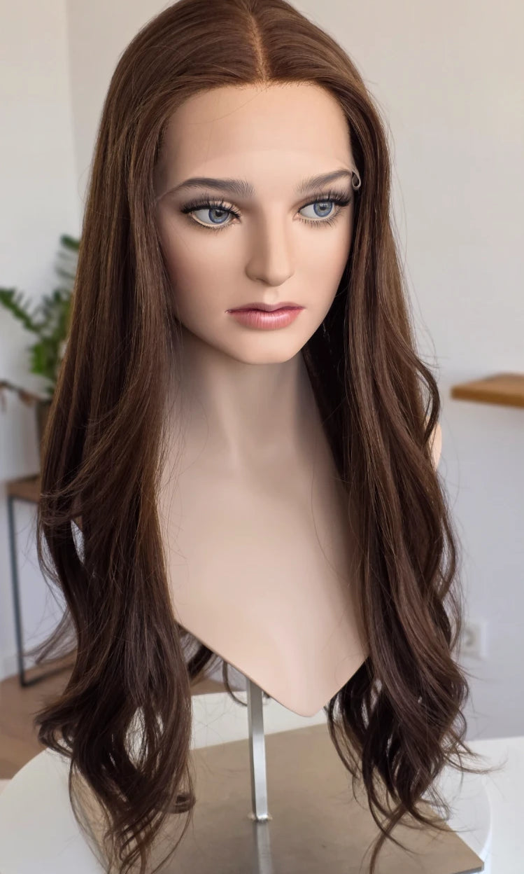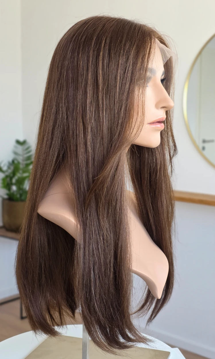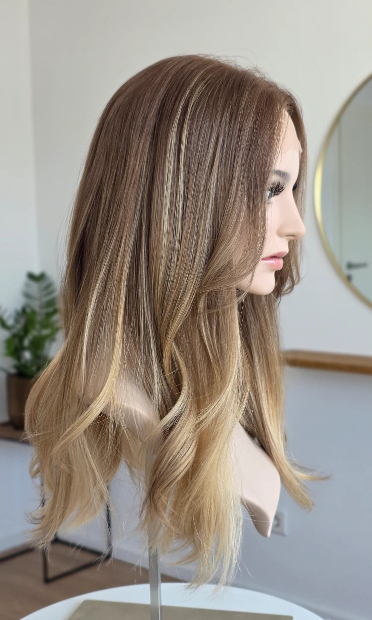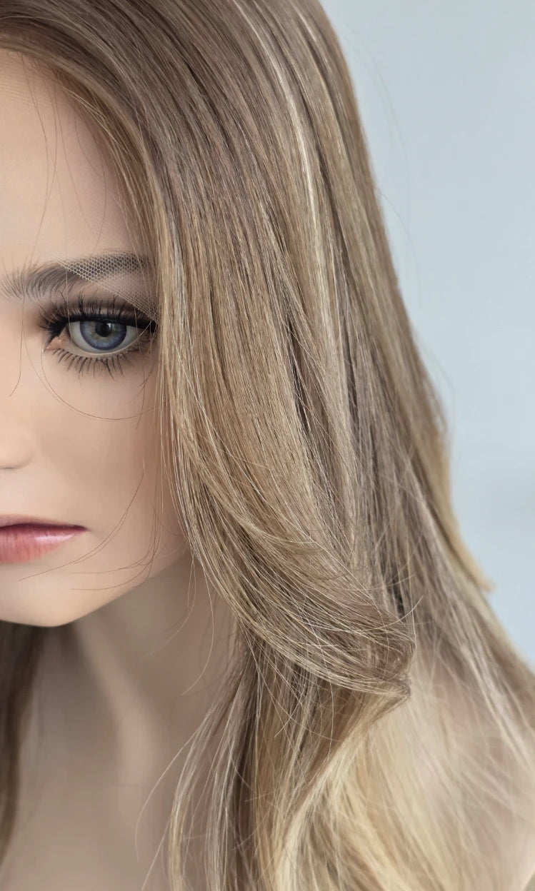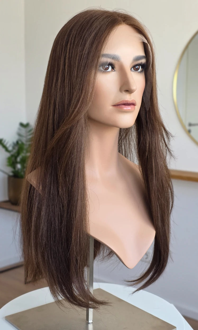 Eine Perücke bedeckt den gesamten Kopf und besteht aus verschiedenen Verarbeitungstechnicken, die gemeinsam für ein natürliches Aussehen sorgen.