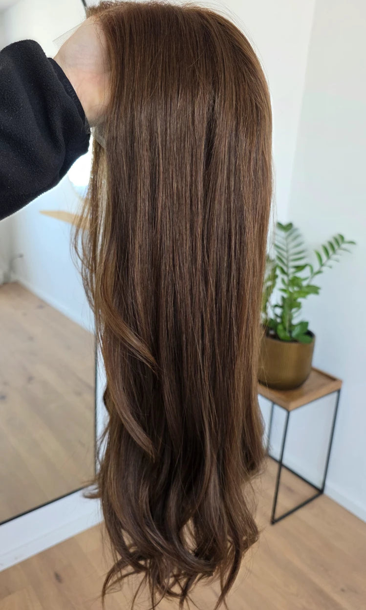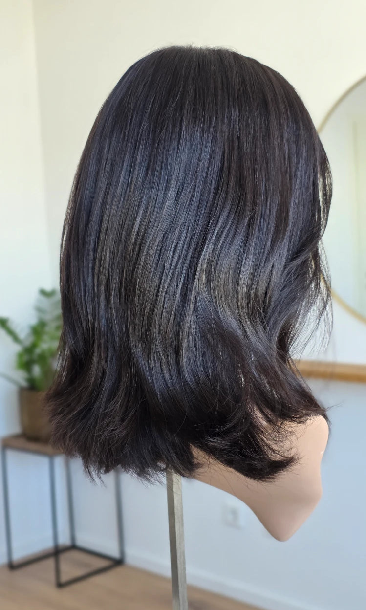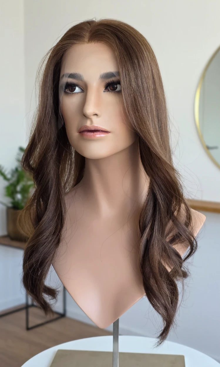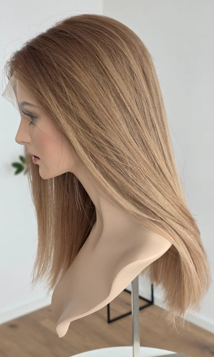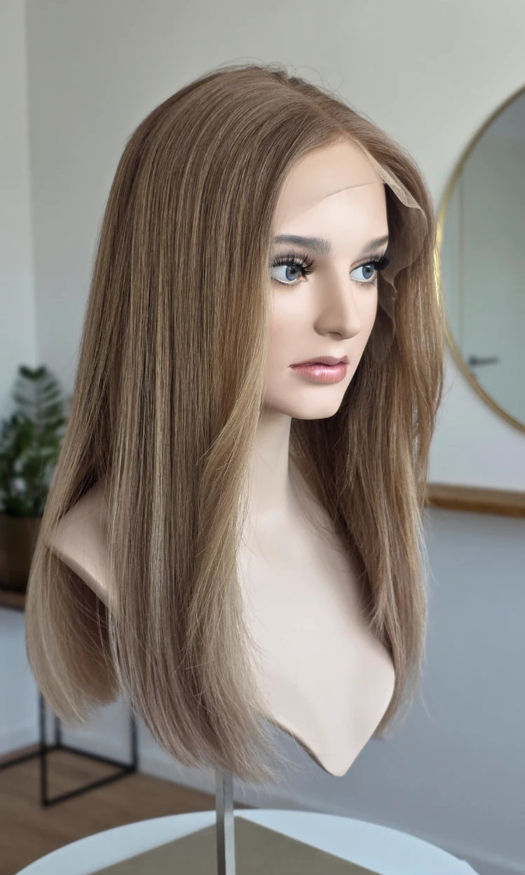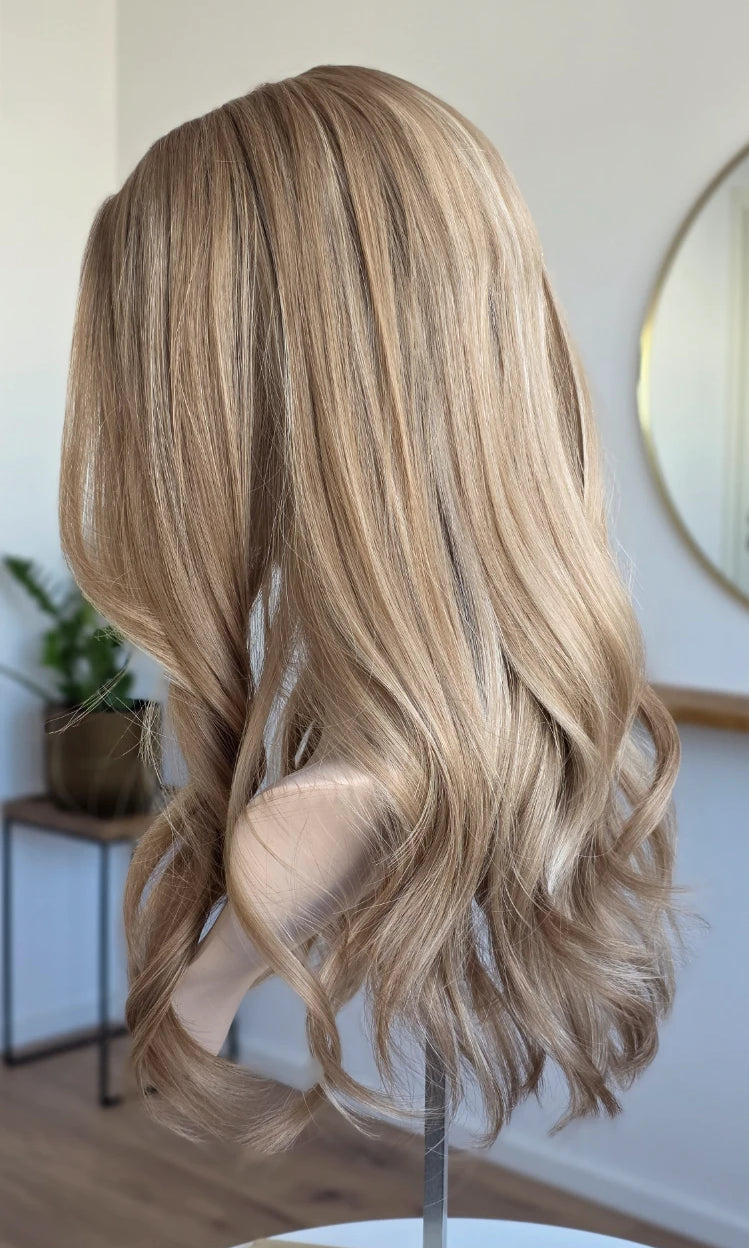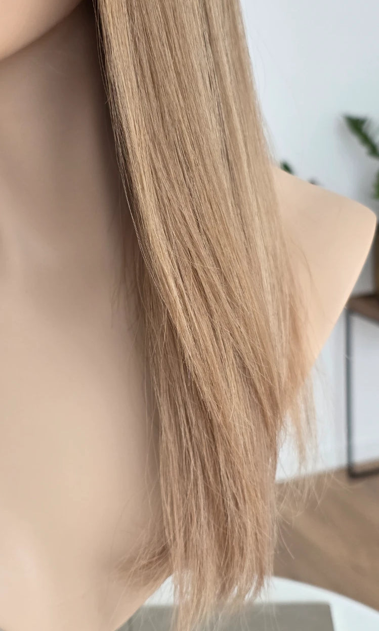 Eine Perücke bedeckt den gesamten Kopf und besteht aus verschiedenen Verarbeitungstechnicken, die gemeinsam für ein natürliches Aussehen sorgen.