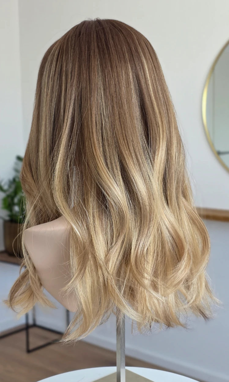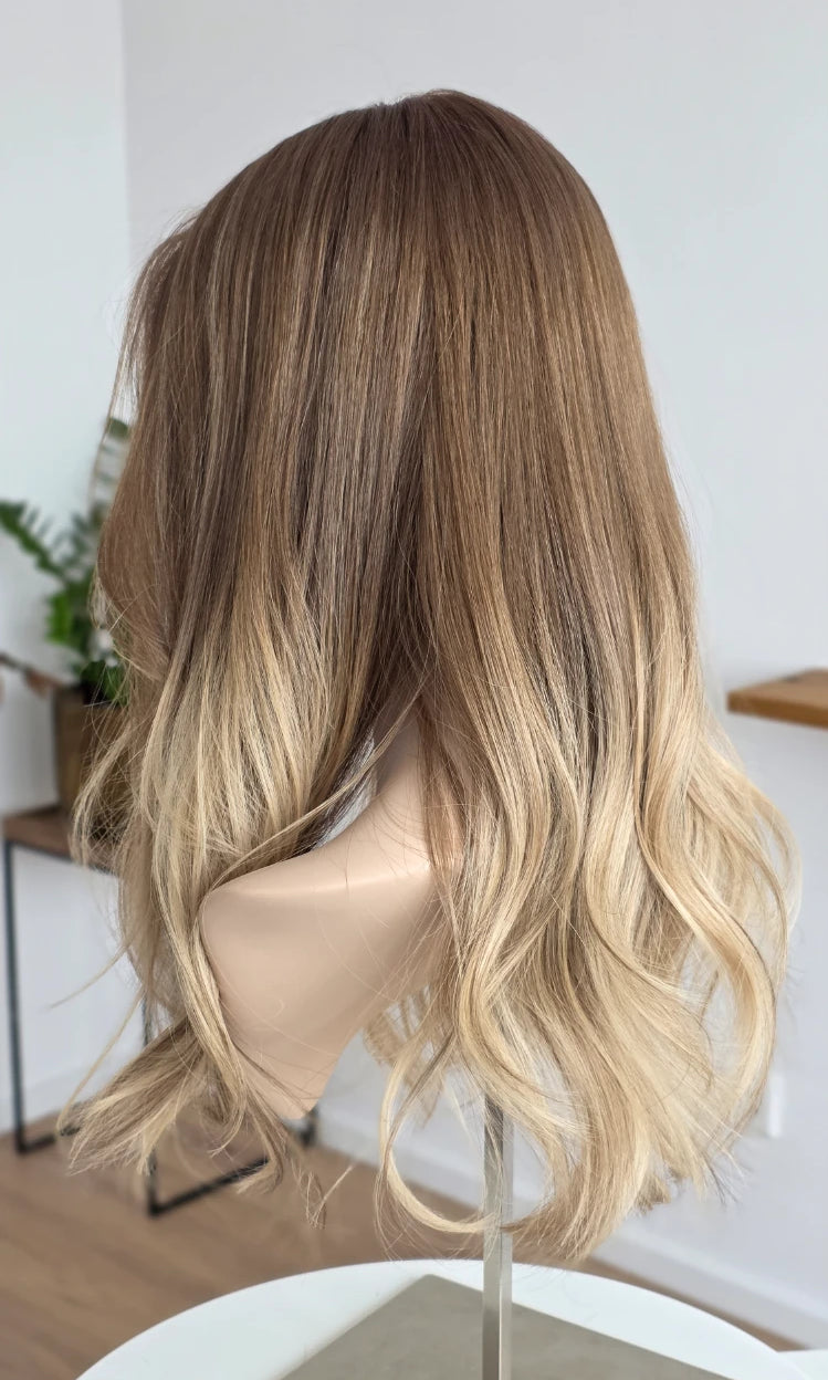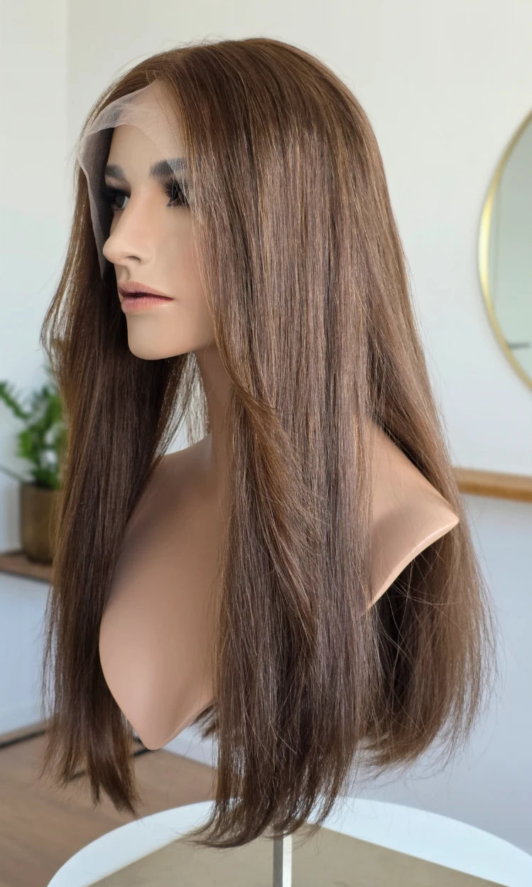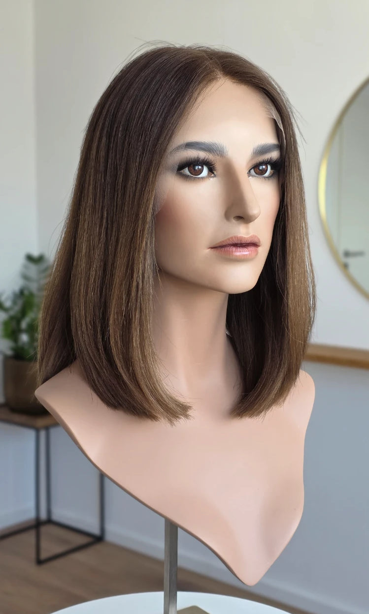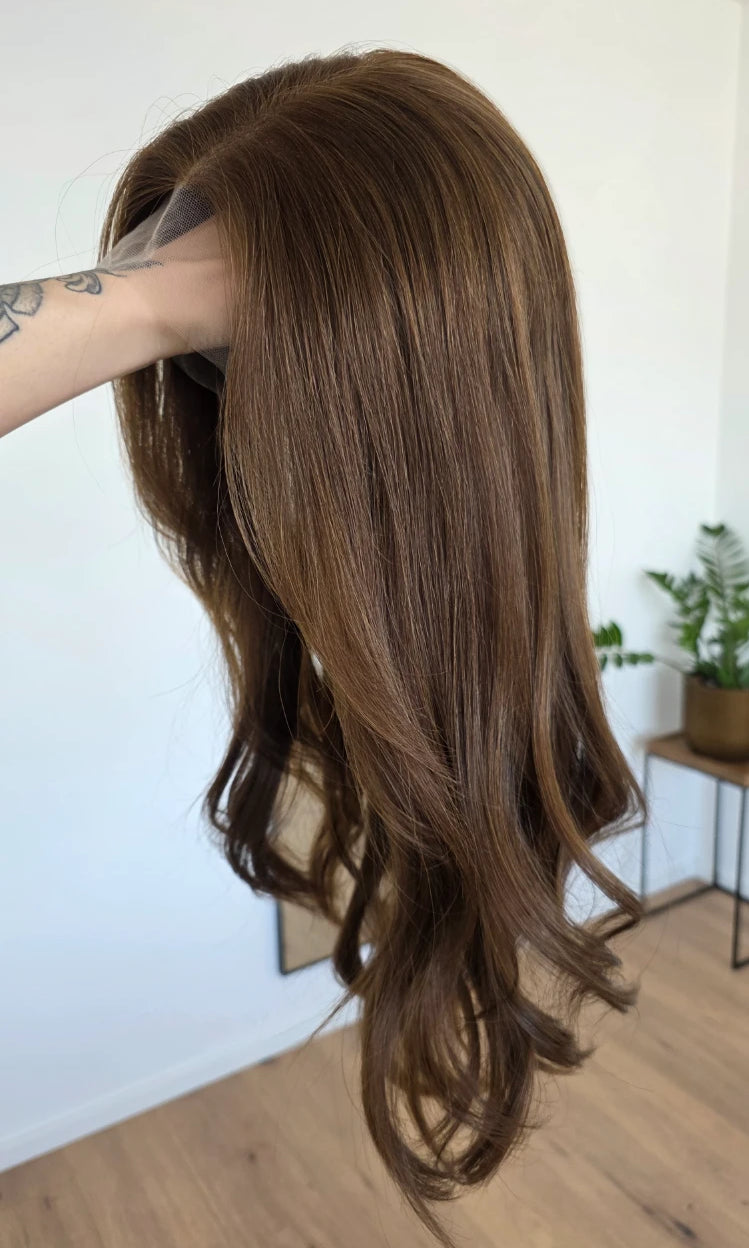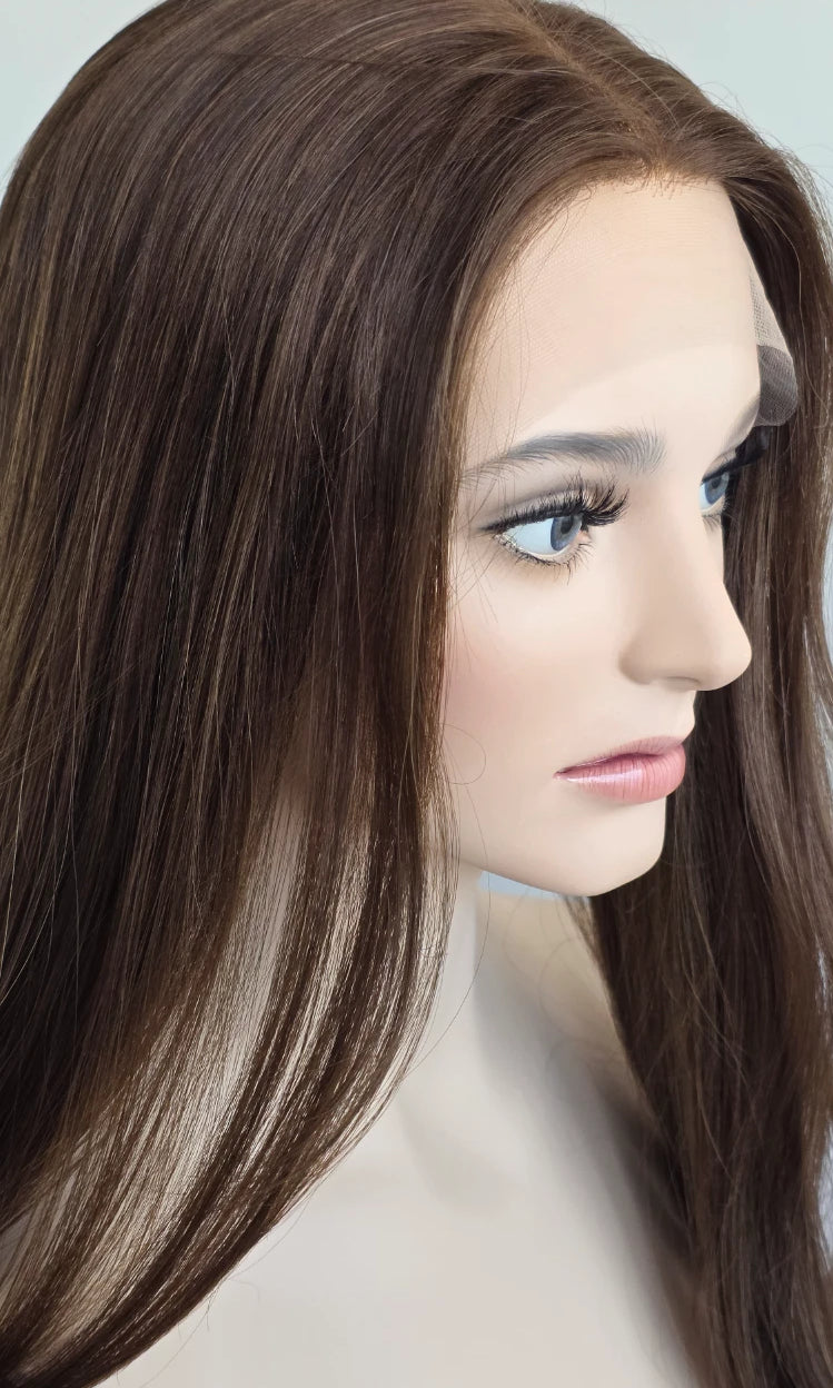 Eine Perücke bedeckt den gesamten Kopf und besteht aus verschiedenen Verarbeitungstechnicken, die gemeinsam für ein natürliches Aussehen sorgen.