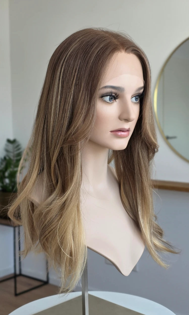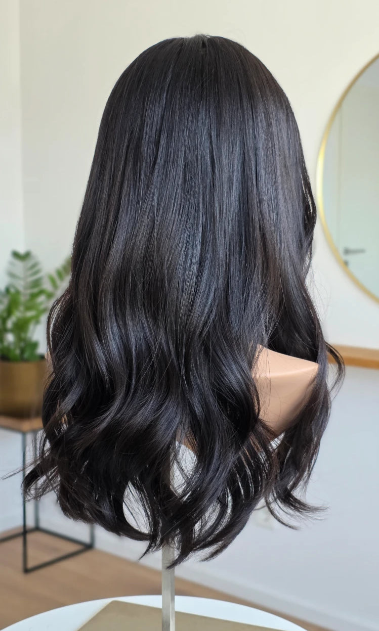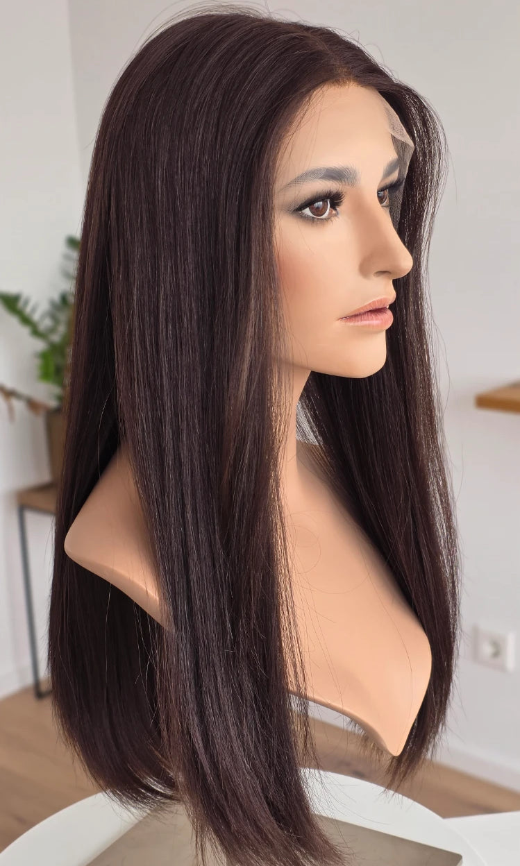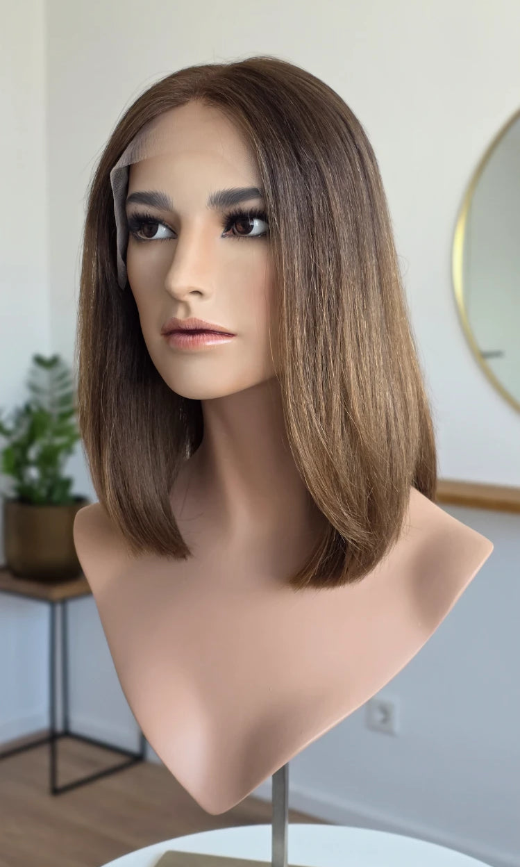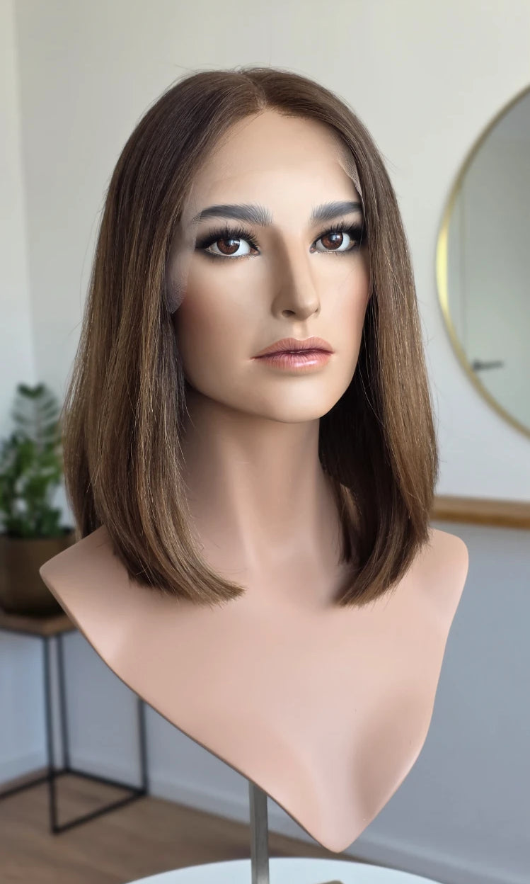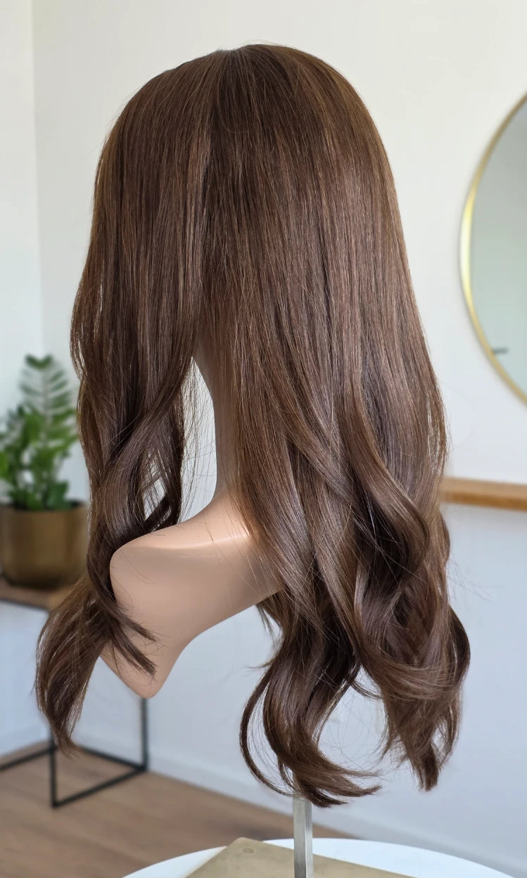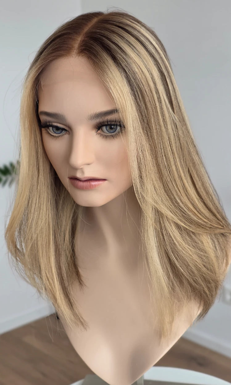 Eine Perücke bedeckt den gesamten Kopf und besteht aus verschiedenen Verarbeitungstechnicken, die gemeinsam für ein natürliches Aussehen sorgen.