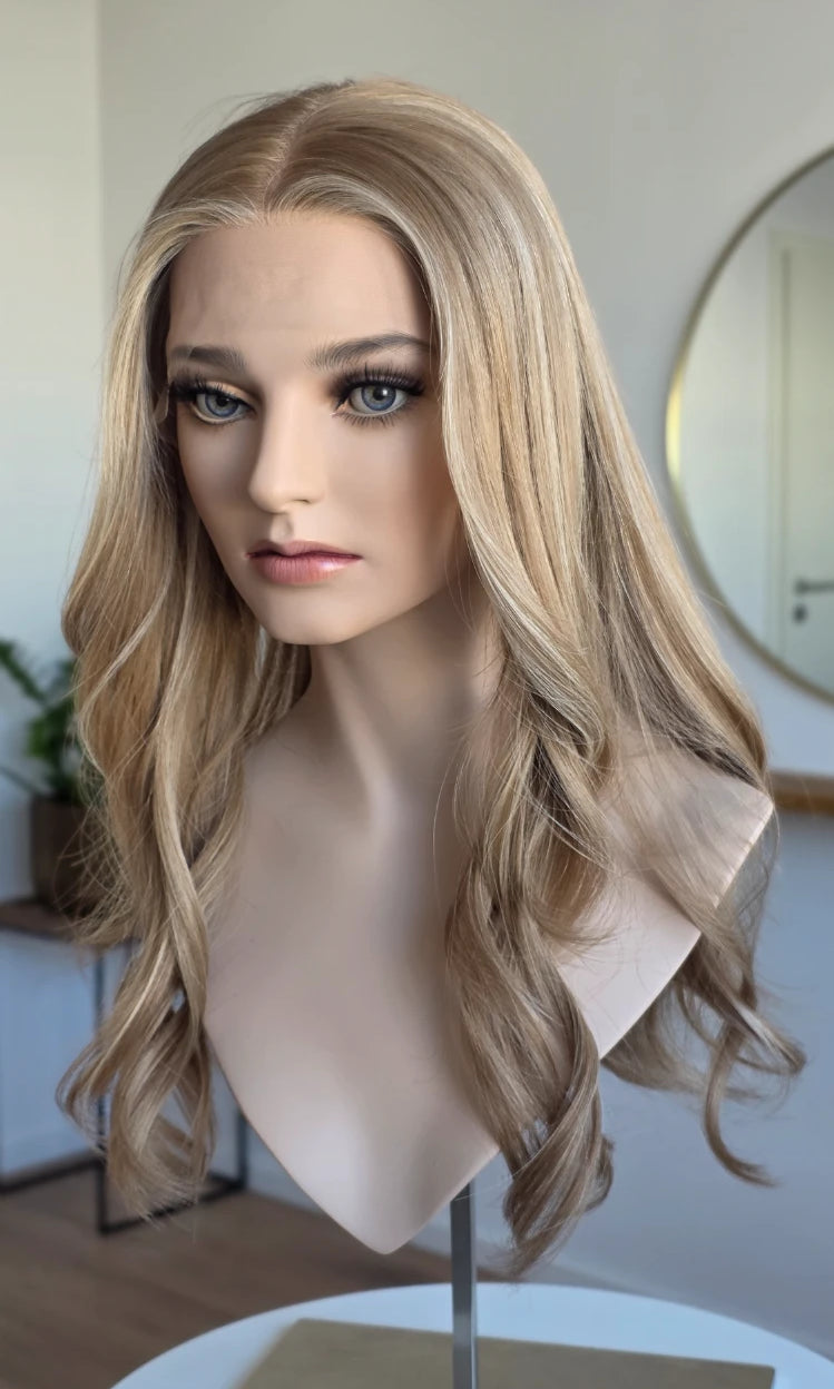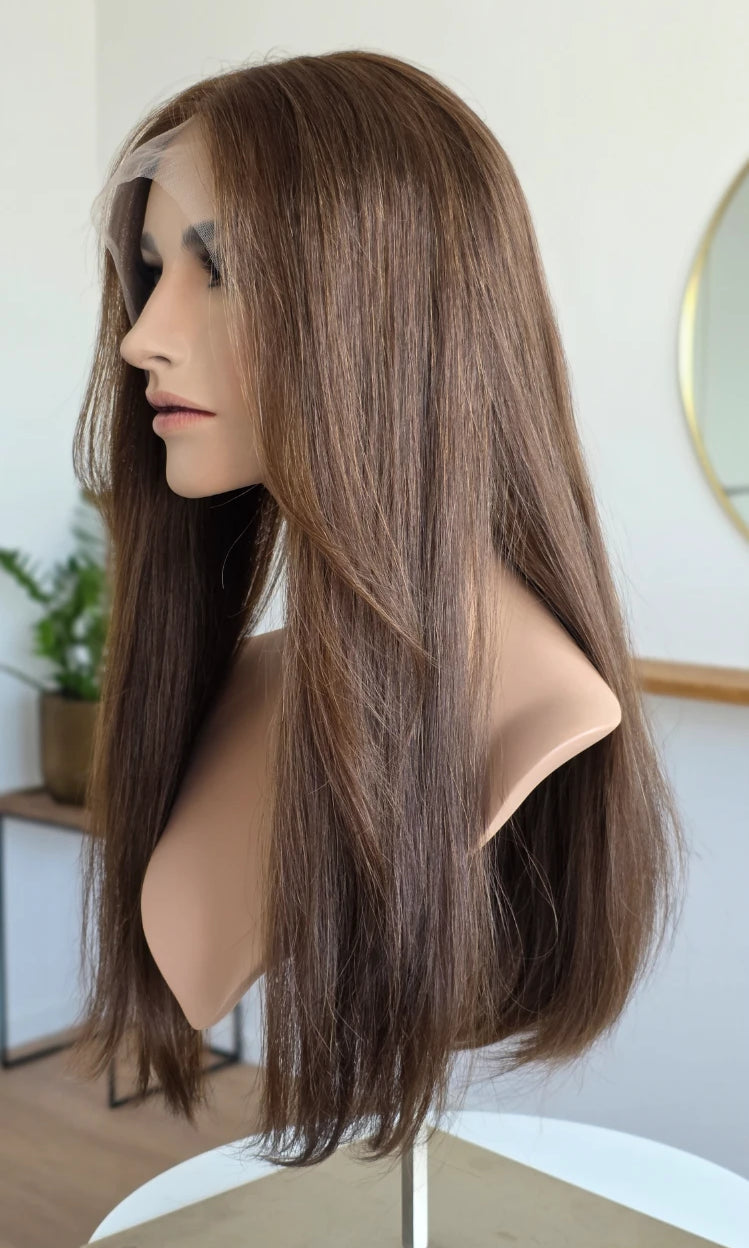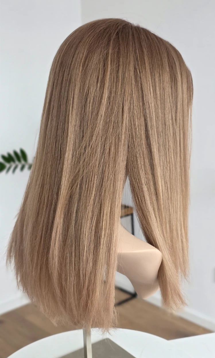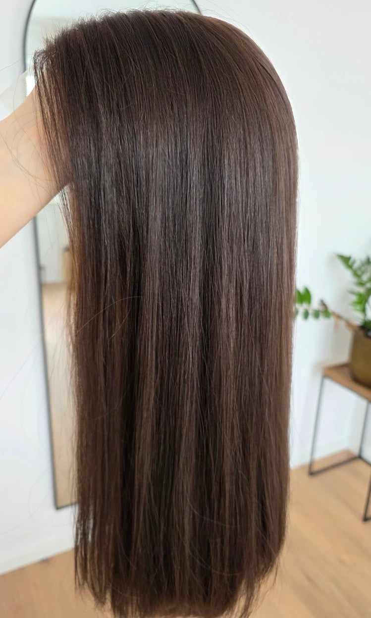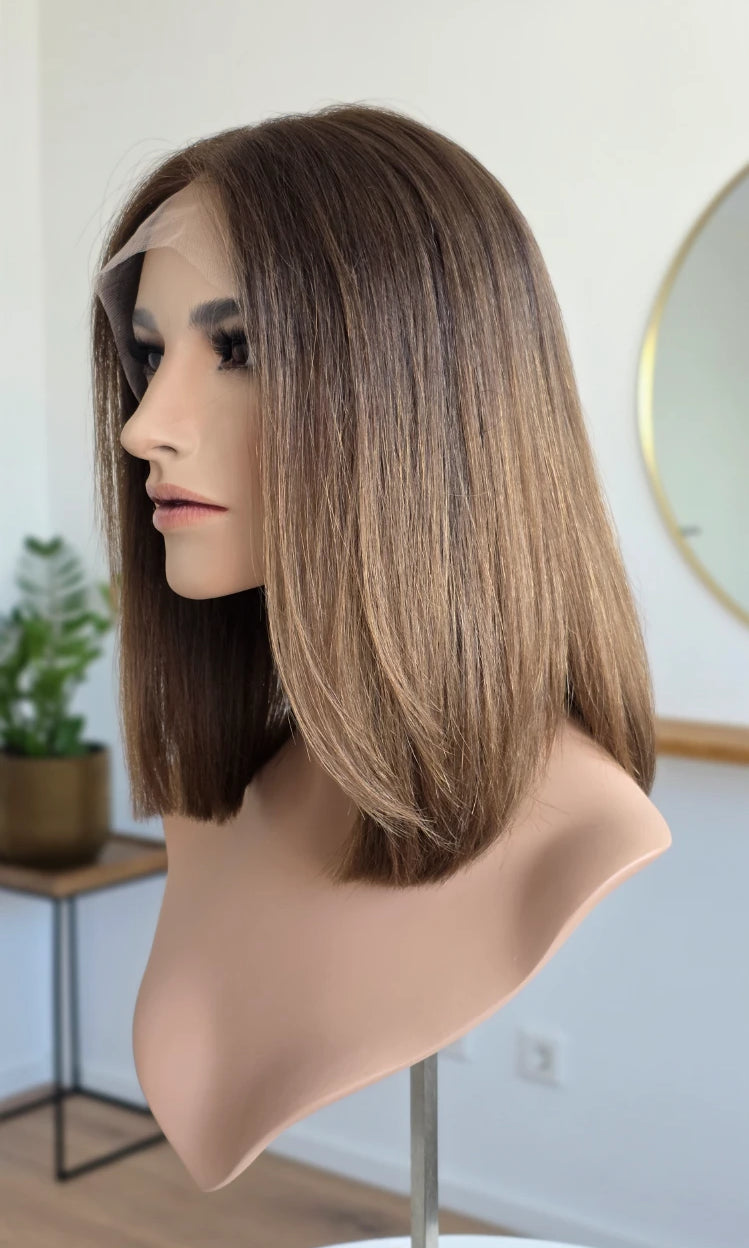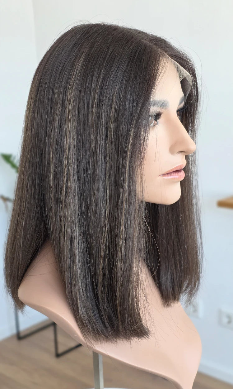 Eine Perücke bedeckt den gesamten Kopf und besteht aus verschiedenen Verarbeitungstechnicken, die gemeinsam für ein natürliches Aussehen sorgen.